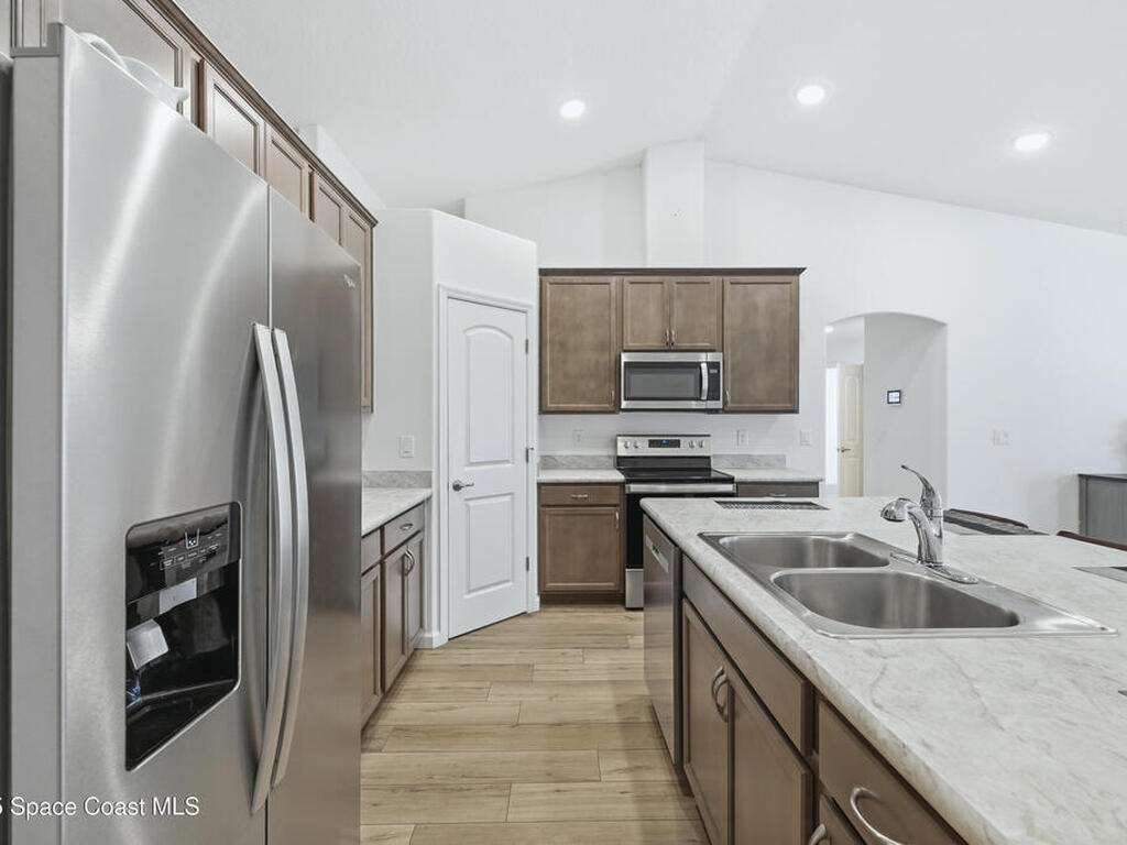 Beautiful and move-in ready! This 3-bedroom, 2-bath home with a den and 20x12 trussed screened porch on city water is packed with upgrades. Stone columns and a wrought iron porch surround add curb appeal and peace of mind. Inside, you'll love the open floor plan, Level 2 vinyl plank flooring, and kitchen with stainless appliances and a spacious island overlooking the family room. The primary suite offers a tray ceiling, walk-in closet, double vanity, and a large tiled shower with glass door. Extras include a WiFi garage door opener, LED lighting, new paver patio, and vinyl-fenced backyard-perfect for relaxing or entertaining!
