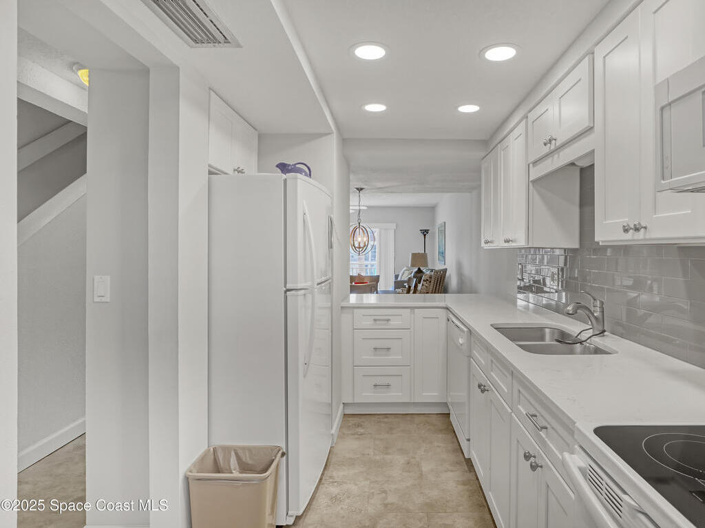 Welcome to Paradise! Living up to it's moniker, this gorgeous two bedroom, two and a half bath condo is tastefully updated and just a two minute walk to Paradise Beach (aka the local's beach). Featuring an updated kitchen with LED lighting, quartz countertops, white cabinets, tile back splash & floors. impact rated windows and brand new a/c system, new interior paint, slider blinds, plantation shutters, and plenty of storage space throughout. Both bedrooms are spacious, with private full baths & walk-in shower in master suite. Enjoy sunshine, surfing, & great rocket launch viewing, walk to restaurants, and shopping. Sip your coffee in the morning on your privare porch overlooking the beautifully maintained pool. From tennis courts, sauna and a shuffleboard court, activities abound. Offered turn-key furnished, bring your toothbrush and immediately begin to enjoy all that Florida beach life has to offer. Washer/Dryer can be added