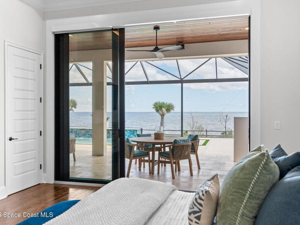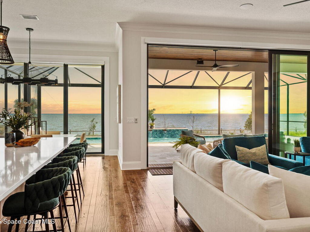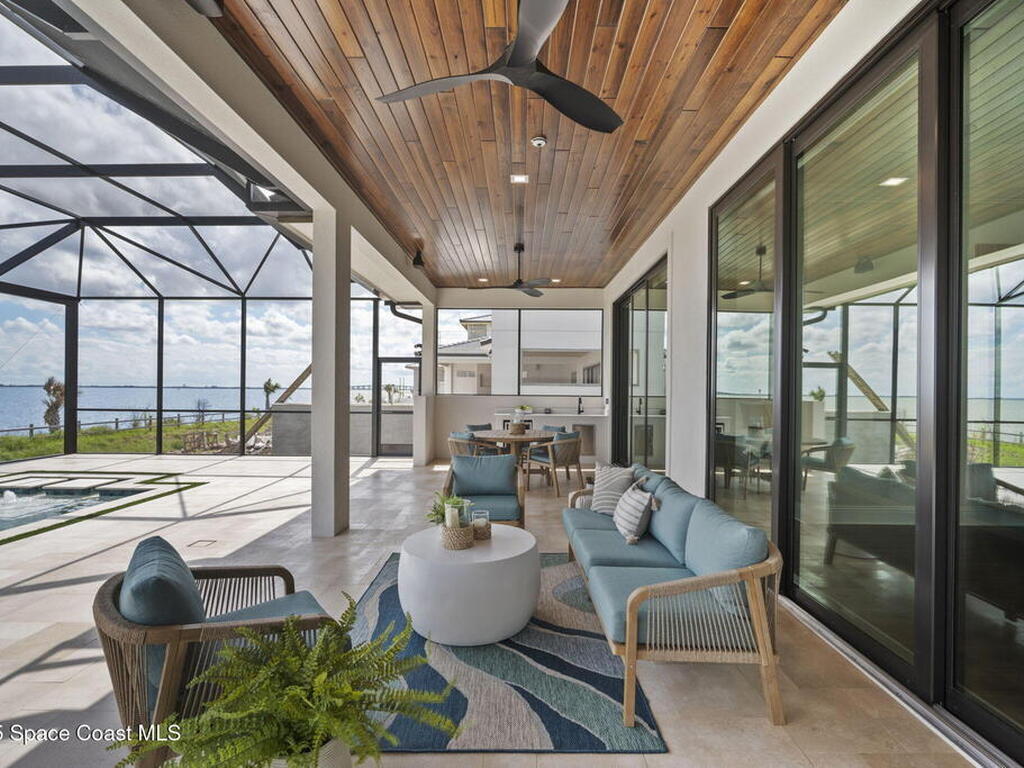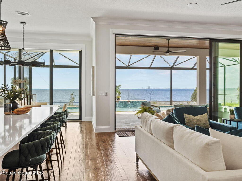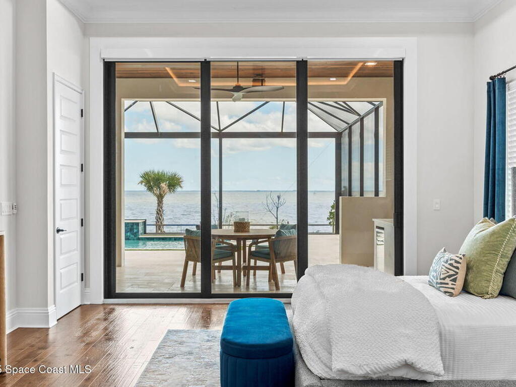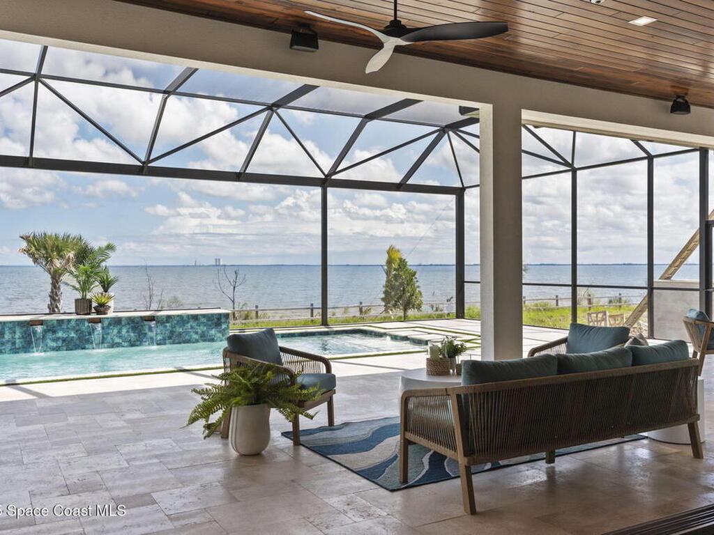 The Shores at Tranquility is a gated lifestyle community with a planned marina, town center, clubhouse, resort-style pool, fitness center, pickleball courts, and more.Experience luxury waterfront living in this beautiful custom Hulbert Homes build featuring 4 bedrooms, 3.5 bathrooms, and a 4-car garage. This home offers breathtaking 3-5 mile views across the Intracoastal Waterway.Inside, elegant details include a climate-controlled wine room, 10' sliders, electronic roll-down shades, and a custom iron pivot entry door.The open-concept design includes a chef's kitchen with a large island, gas stove, and stainless Dacor appliances. The screened saltwater pool with sun shelf and waterfall creates a private retreat perfect for watching rocket launches. A hidden ''Florida Basement'' adds extra storage, blending innovation, comfort, and coastal sophistication.Don't miss this once-in-a-lifetime waterfront home -- a place to build lasting memories and your family legacy.