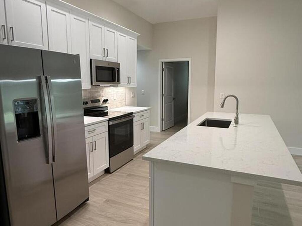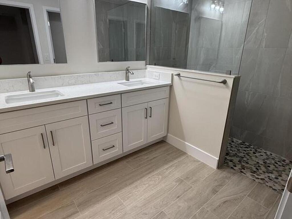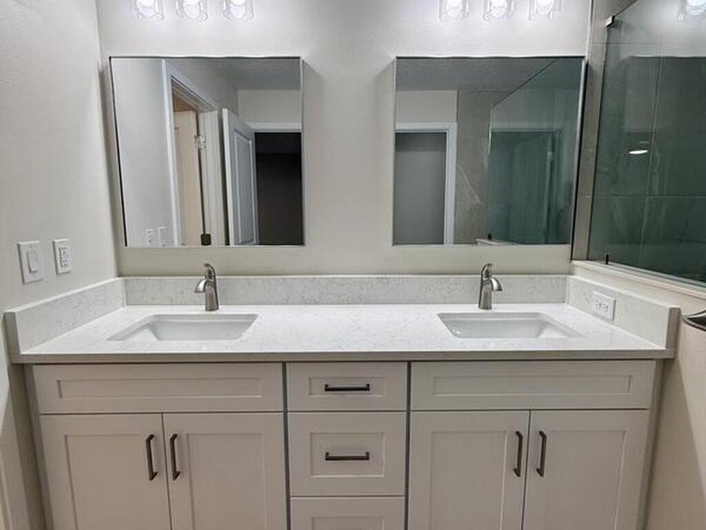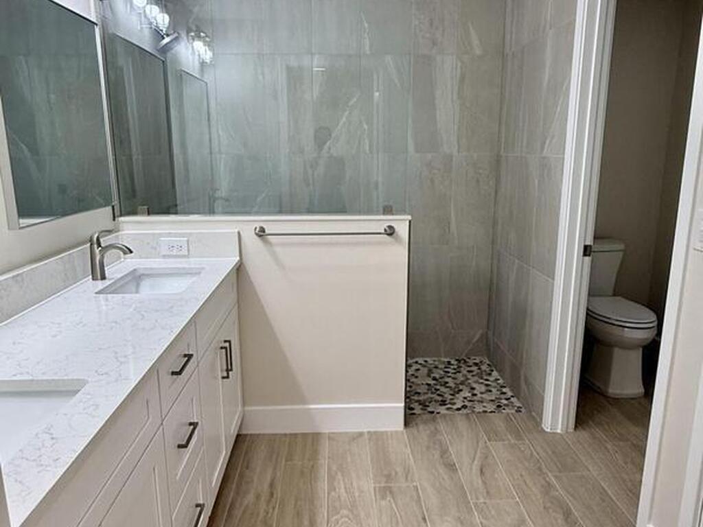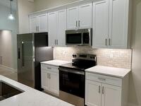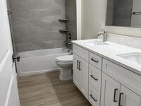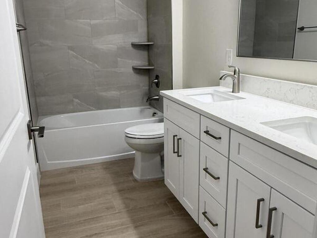 Spectacular new construction home with spacious layout. This great room floor plan features vaulted ceilings, 4 bedrooms, 2 bathrooms, 2 car garage, and covered patio. Kitchen features soft-close cabinet doors and drawers, quartz counter tops, under-cabinet lighting, stainless steel GE appliances, tiled backsplash, and one level island for eating/entertaining. The home has a large walk-in pantry and separate laundry room. All bedrooms have ceiling fans with remotes. Bathrooms feature soft-close cabinet doors and drawers, quartz counter tops, tiled shower/tub to ceiling, and brushed nickel plumbing/light fixtures. Flooring throughout is porcelain wood plank tile. This home is move-in ready with blinds installed at all windows and sliding glass door. Quiet neighborhood.