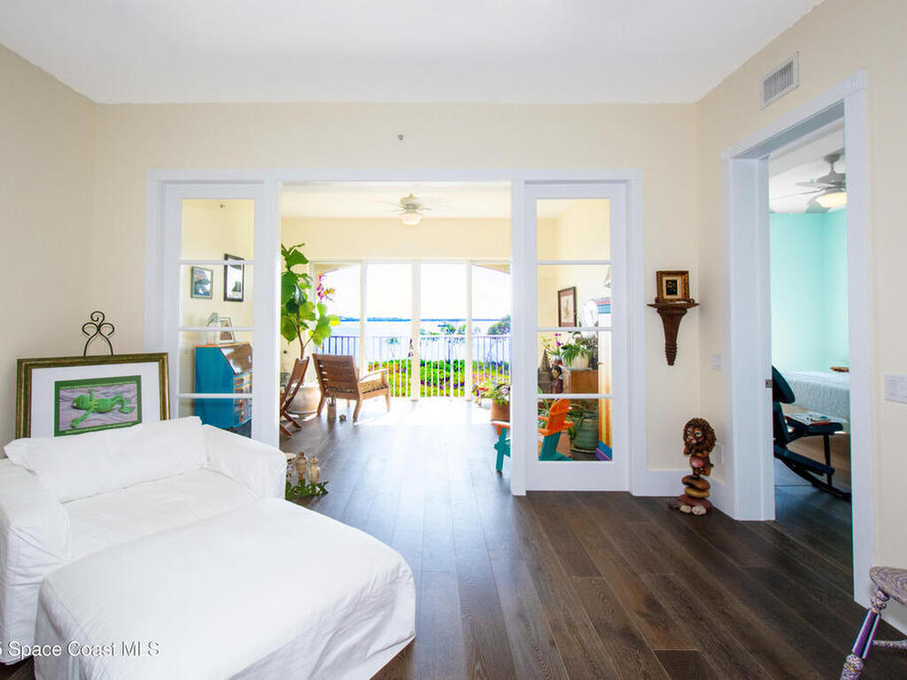 Feels like home, this waterfront condo offers breathtaking views of boats on the Indian River. Awash in natural light, the condo features a soft coastal palette, high-end marble countertops, oakwood flooring, wood plantation shutters, and refined trim details throughout. Eat-in kitchen with white porcelain subway tile, custom cabinets and maple shelving, and a designer hood range for a sophisticated, airy feel. Open dining and living spaces flow seamlessly into a serene sitting room bathed in sunlight. The guest bath has a custom vanity with a cottage feel, guest hall offers custom maple wood shelves. The primary suite impresses with sunrise water views, custom split closets, and a glass barn-door entry to the luxurious spa-inspired ensuite with custom vanity, soaking tub and glass tiled shower. Thoughtful built-ins, a butler's pantry, and utility room, this condo offers exceptional storage. All appliances and HVAC are under three years old.