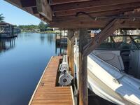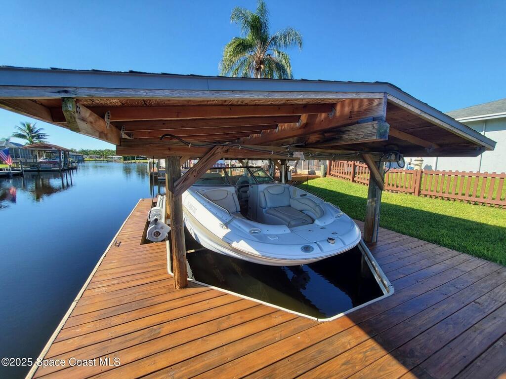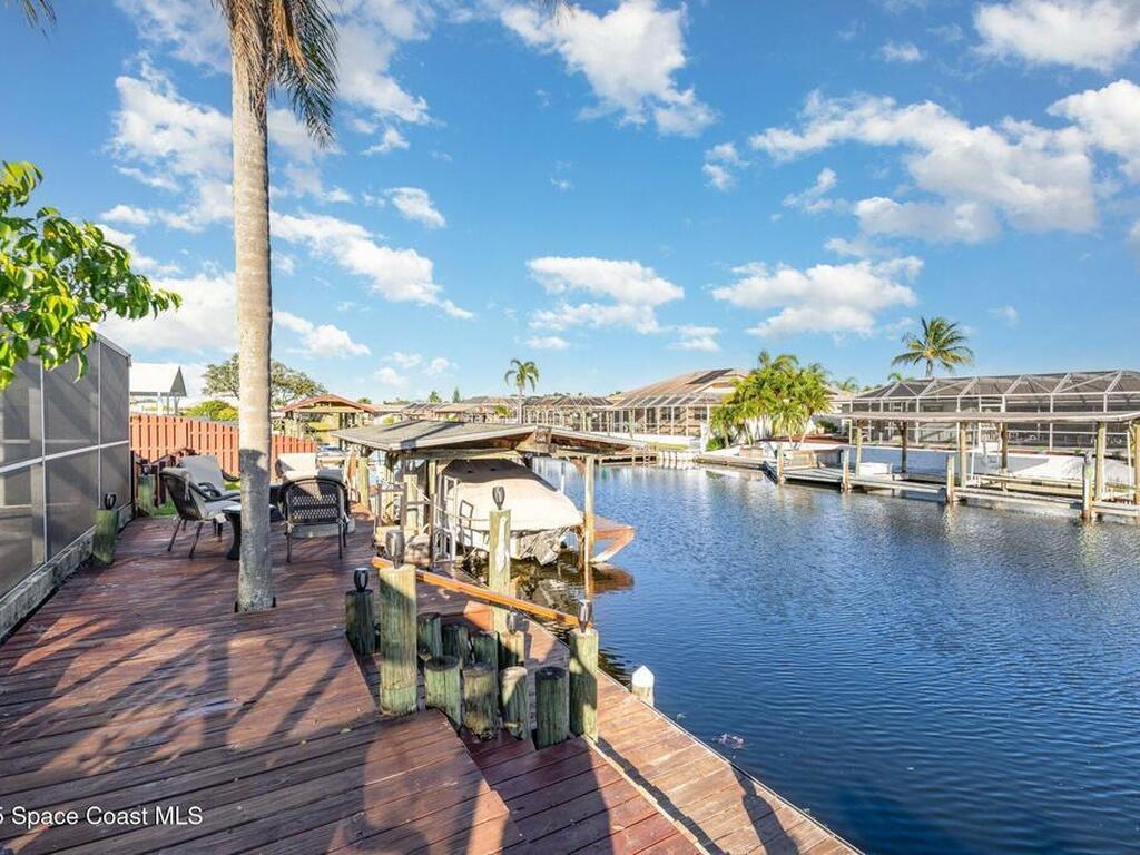Waterfront pool remodeled home with 4 bedrooms & 3 bathrooms! Primary bedroom suite plus a separate full suite along with 2 more bedrooms & a pool bath in this desirable split plan! Gorgeous kitchen with quartz counters & matching wet bar! Sunken spacious great room! Updated bathrooms! Large entertaining screened patio & pool area! Covered boat dock with lift (boat for sale too!) Impact windows and sliders! PVC plumbing & alumicons installed! Underground utilites! Fenced yard with sprinkler system too!