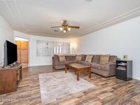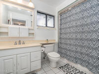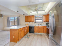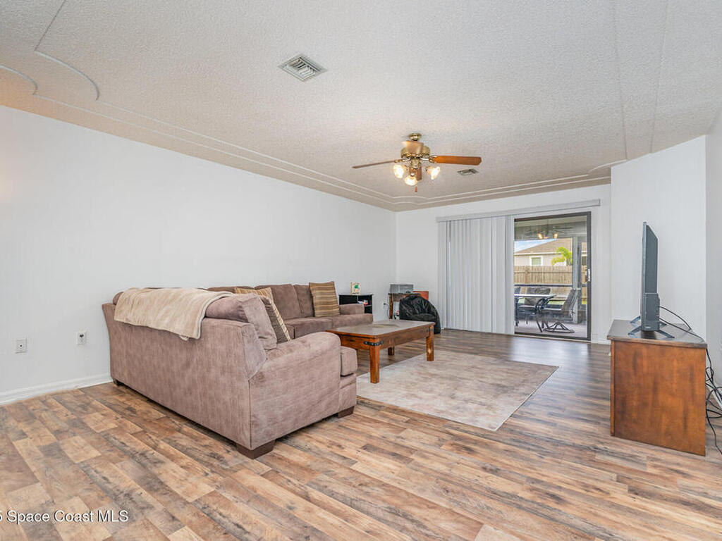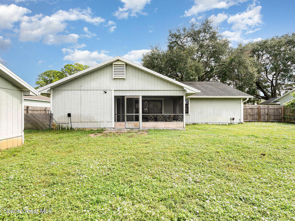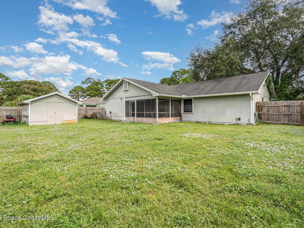 Comfortable 3/2/2 Home on City Water! Nestled in a peaceful Palm Bay neighborhood, this well-maintained home features numerous thoughtful updates throughout. Recent improvements include a 2023 hot water heater, 2022 HVAC system, 2022 refrigerator and stove, gutters, storm shutters, hurricane-rated sliding glass door, ceiling fans, and an irrigation system. Enjoy decorative tray ceilings and a spacious open layout with tile and laminate flooring--NO CARPET! The large kitchen offers oak cabinets, a walk-in pantry, breakfast bar, and recessed lighting. Both baths feature clean-lined countertops, with the guest bath showcasing a tiled shower. Additional highlights include a laundry sink, washer & dryer (included), a 15x18 covered screened lanai, and a 12x18 storage shed in the fenced backyard.