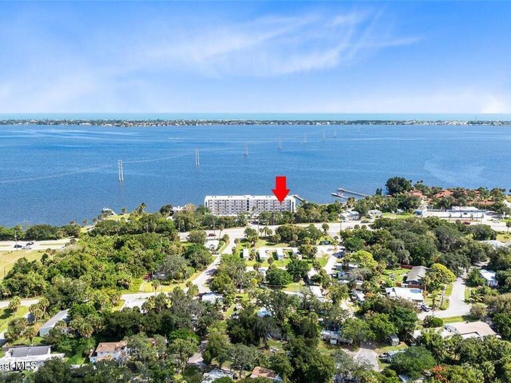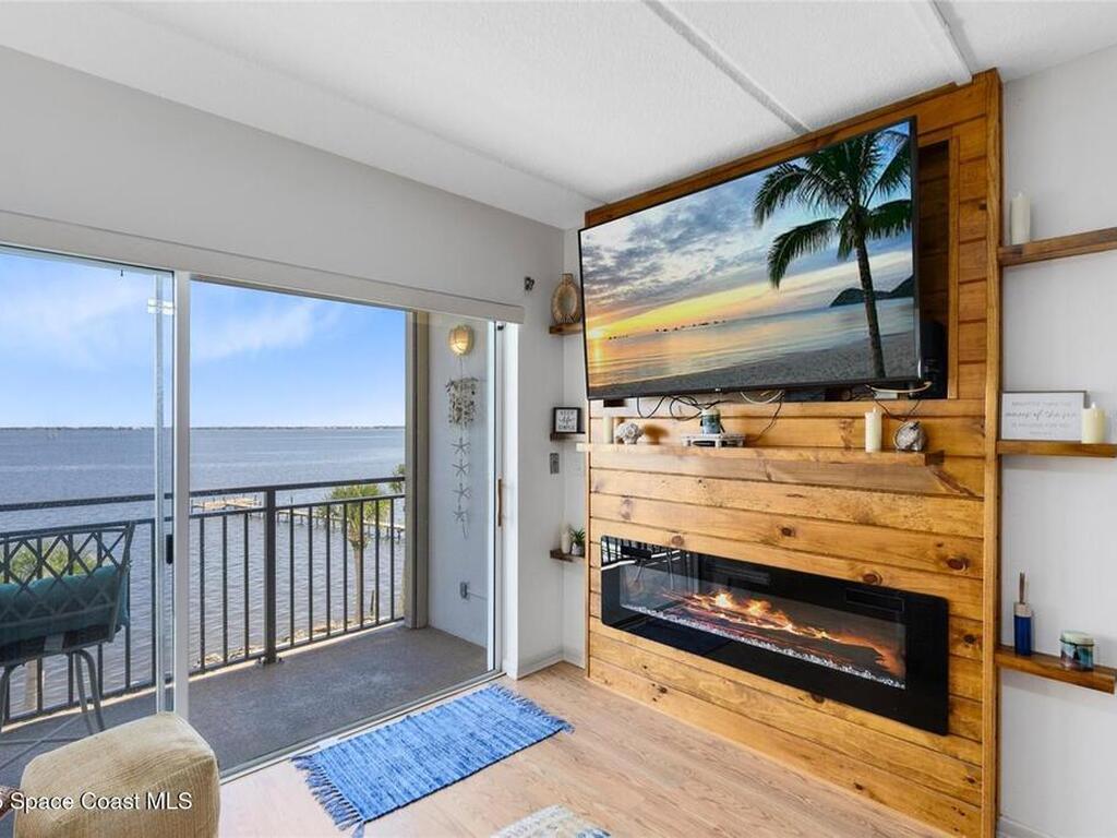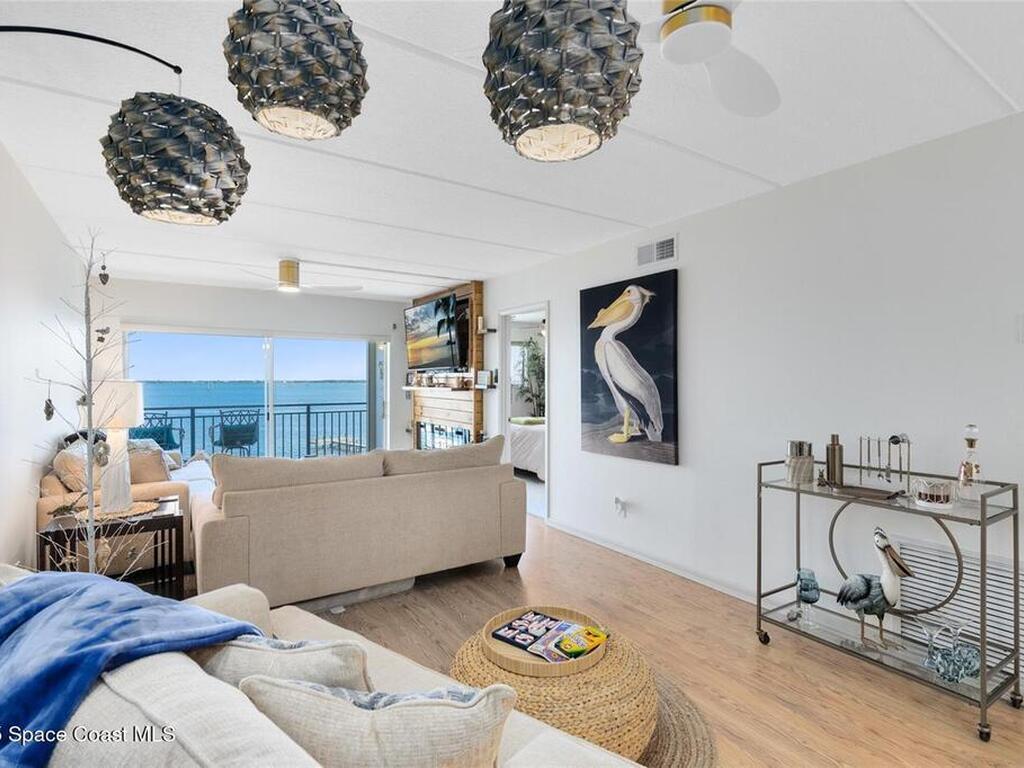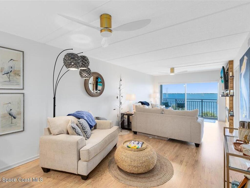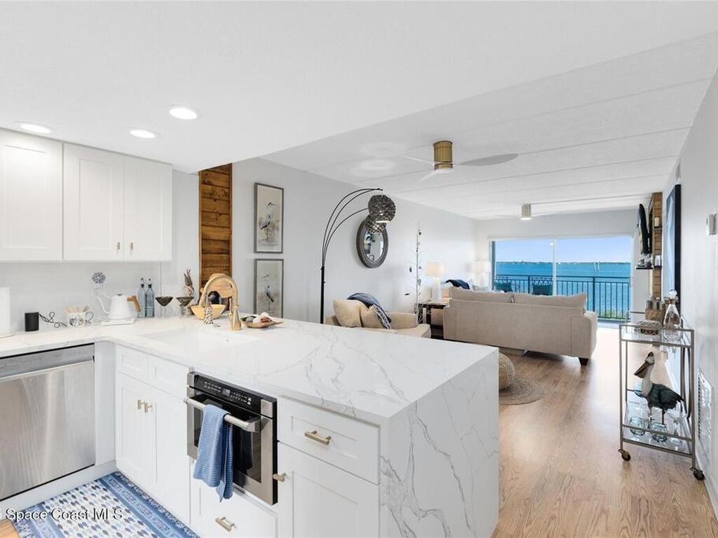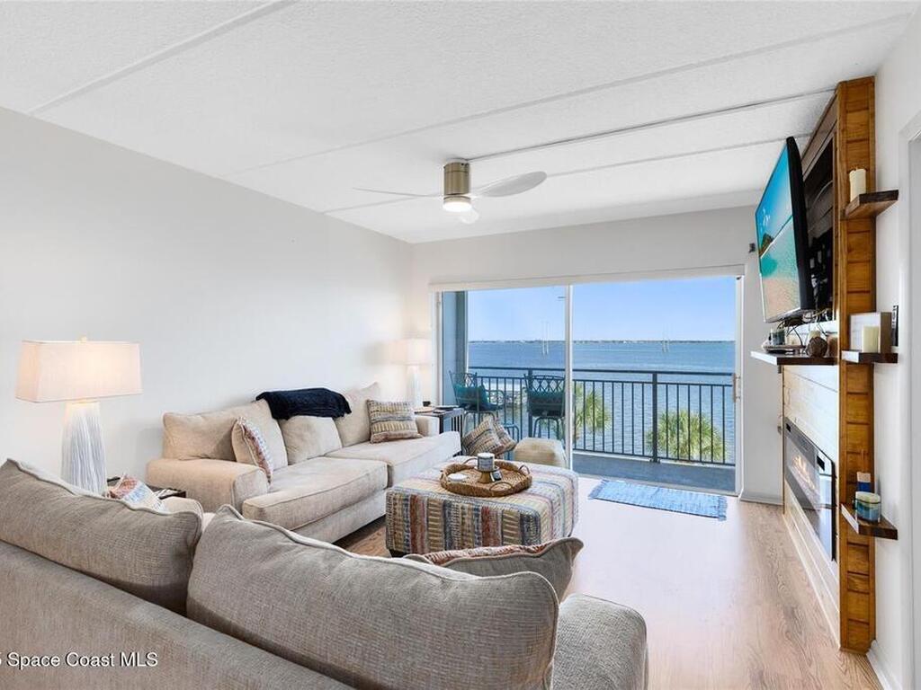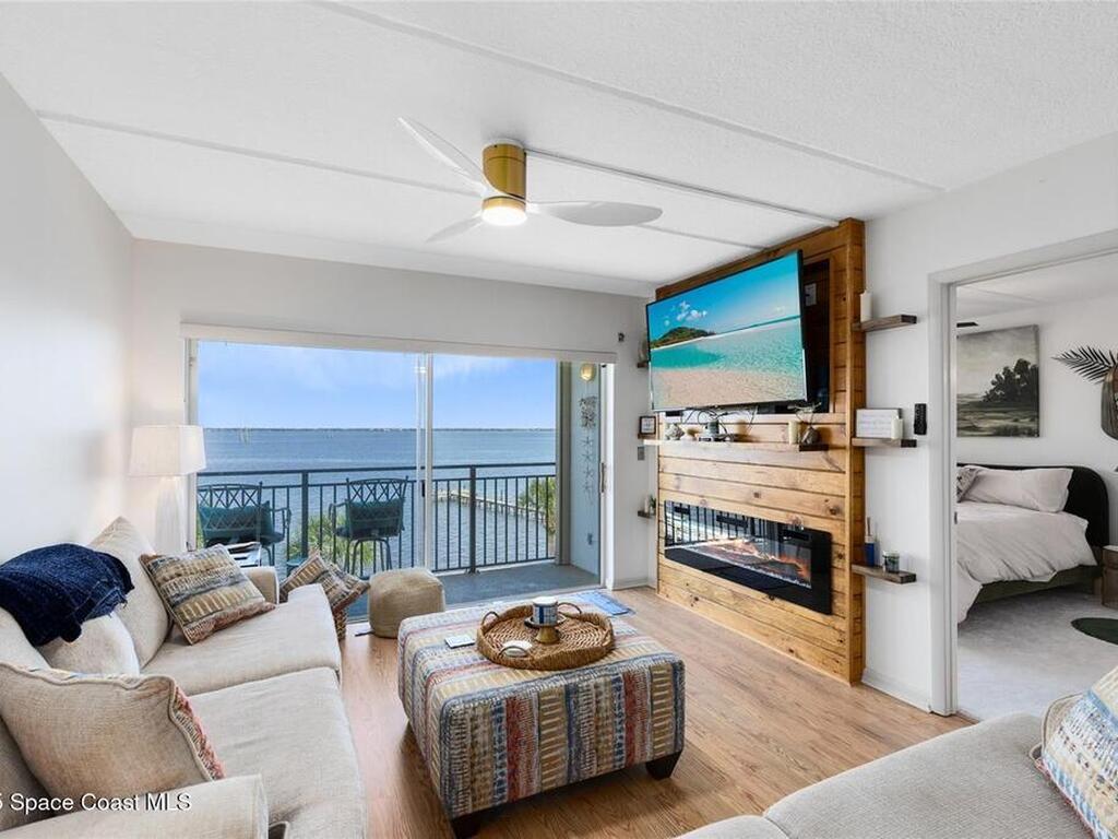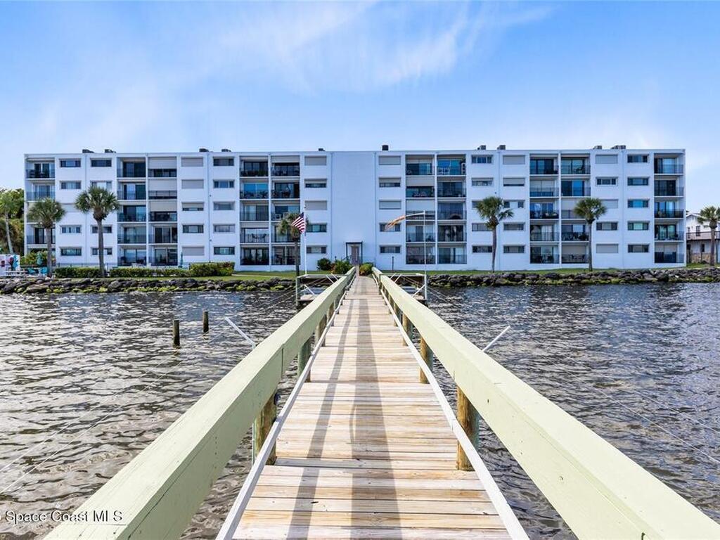 Welcome to your dream retreat on the Indian River in Palm Bay! This COMPLETELY renovated condo showcases elegant coastal style with gold fixtures throughout, custom wood features, a wine cooler, brand-new kitchen, and new carpet in the bedrooms. Situated on the 4th floor of Castaway Cove, you'll enjoy stunning sunrises, refreshing breezes, and the serenity of watching dolphins and manatees play from your private balcony. In the evenings, relax and watch rocket launches illuminate the sky--all from the comfort of home. The community offers riverside pool access, a dock, covered parking, and a secure lobby for peace of mind. The HOA covers exterior maintenance, cable, water, sewer, garbage, pest control, groundskeeping, and insurance, ensuring a true maintenance-free lifestyle. Luxury, comfort, and nature come together seamlessly in this beautiful waterfront condo. (Note: No short-term rentals permitted.)