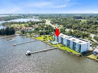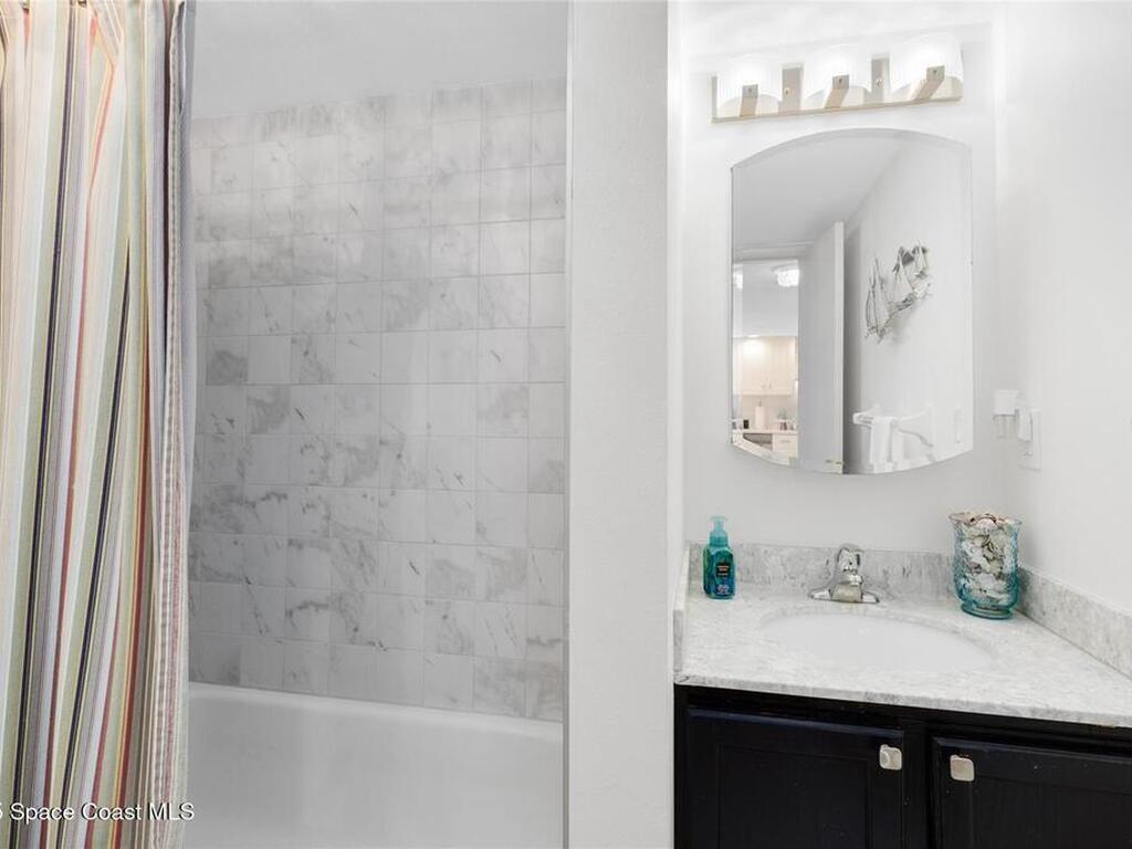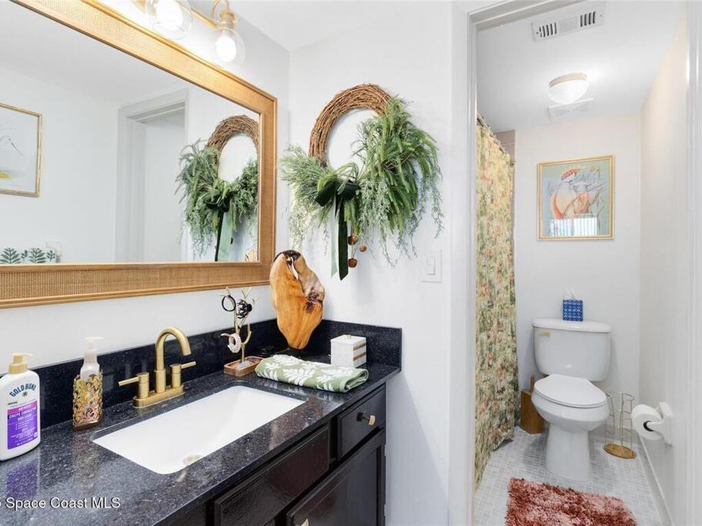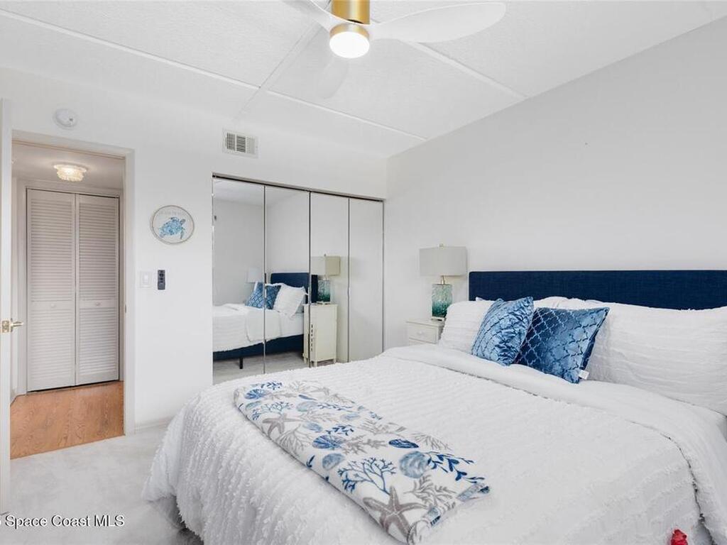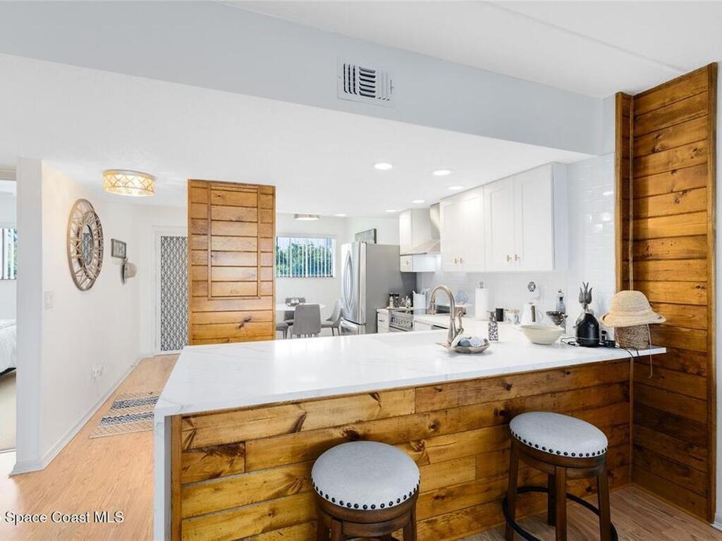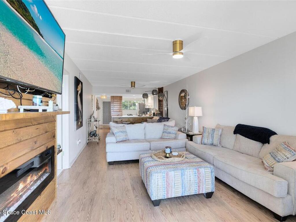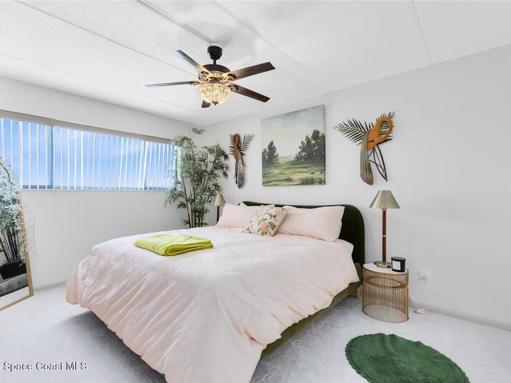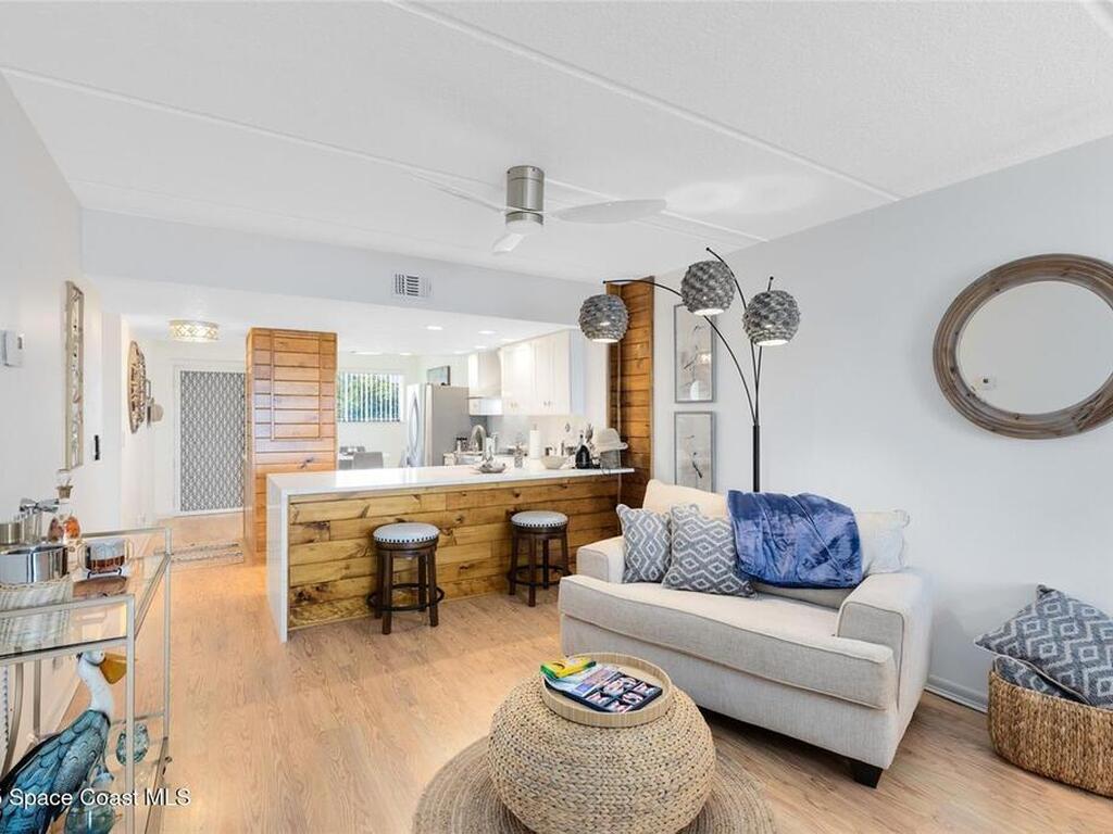 Welcome to your dream retreat on the Indian River in Palm Bay! This COMPLETELY renovated condo showcases elegant coastal style with gold fixtures throughout, custom wood features, a wine cooler, brand-new kitchen, and new carpet in the bedrooms. Situated on the 4th floor of Castaway Cove, you'll enjoy stunning sunrises, refreshing breezes, and the serenity of watching dolphins and manatees play from your private balcony. In the evenings, relax and watch rocket launches illuminate the sky--all from the comfort of home. The community offers riverside pool access, a dock, covered parking, and a secure lobby for peace of mind. The HOA covers exterior maintenance, cable, water, sewer, garbage, pest control, groundskeeping, and insurance, ensuring a true maintenance-free lifestyle. Luxury, comfort, and nature come together seamlessly in this beautiful waterfront condo. (Note: No short-term rentals permitted.)