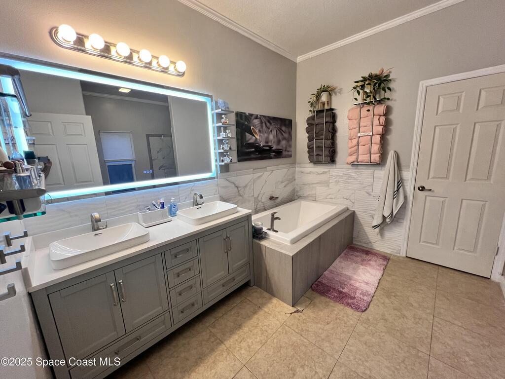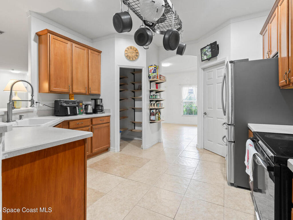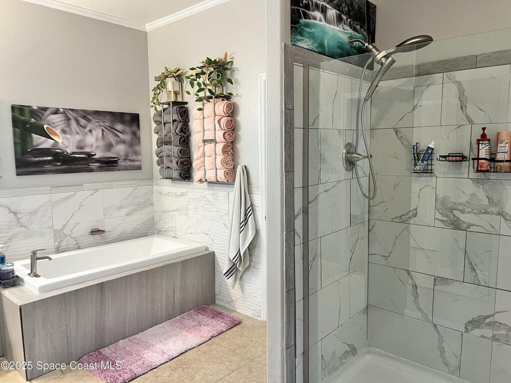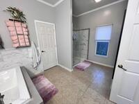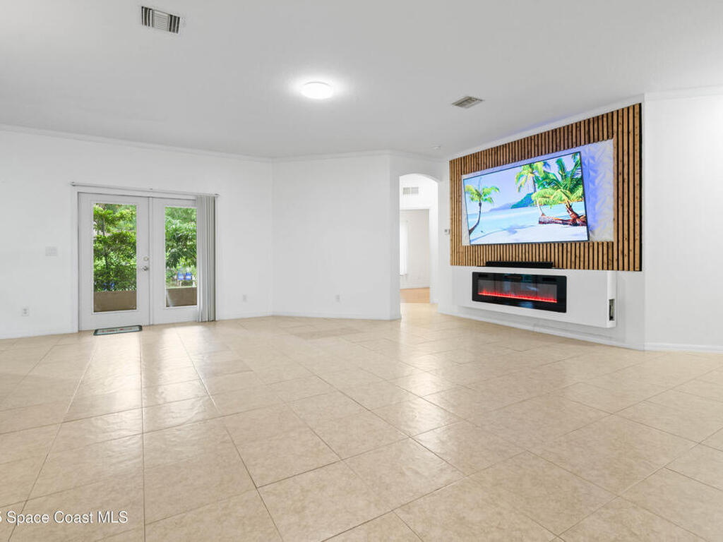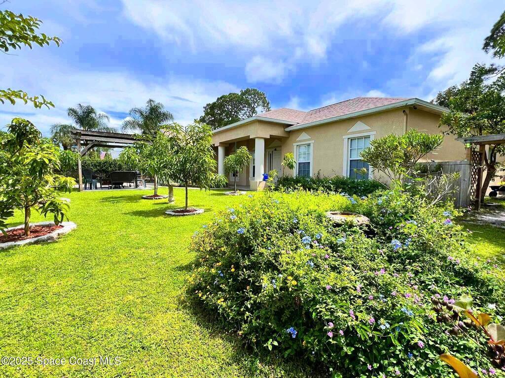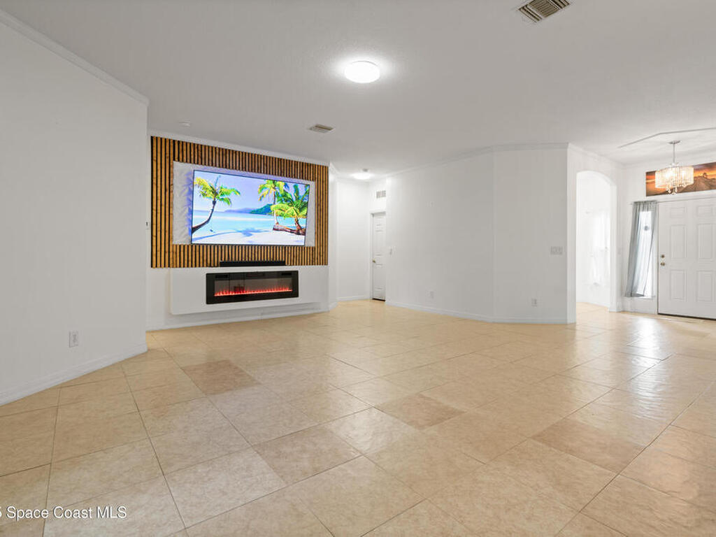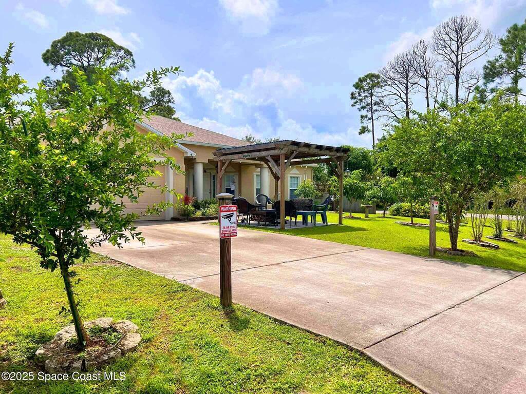 City Water, Brand-New Roof, gutters & AC! This beautifully upgraded home offers comfort, style, and functionality throughout. The welcoming family room features a built-in electric fireplace and a custom media wall with an impressive 85-inch TV--perfect for cozy nights or lively gatherings. Formal living and dining rooms provide an elegant setting for hosting guests, enhanced by stylish tile flooring and crown molding that add a cohesive, sophisticated touch. French doors open to a spacious screened-in porch, ideal for relaxing or entertaining outdoors. The kitchen is both warm and practical, showcasing rich maple cabinetry with crown accents, a breakfast bar, and a charming nook for casual meals. Master suite is a true retreat, complete with a generous walk-in closet and a luxurious en-suite bath featuring a garden tub and separate shower. Step outside to a gardener's paradise, where a pergola, exotic fruit trees, and privacy fencing create a serene and inviting backyard escape.