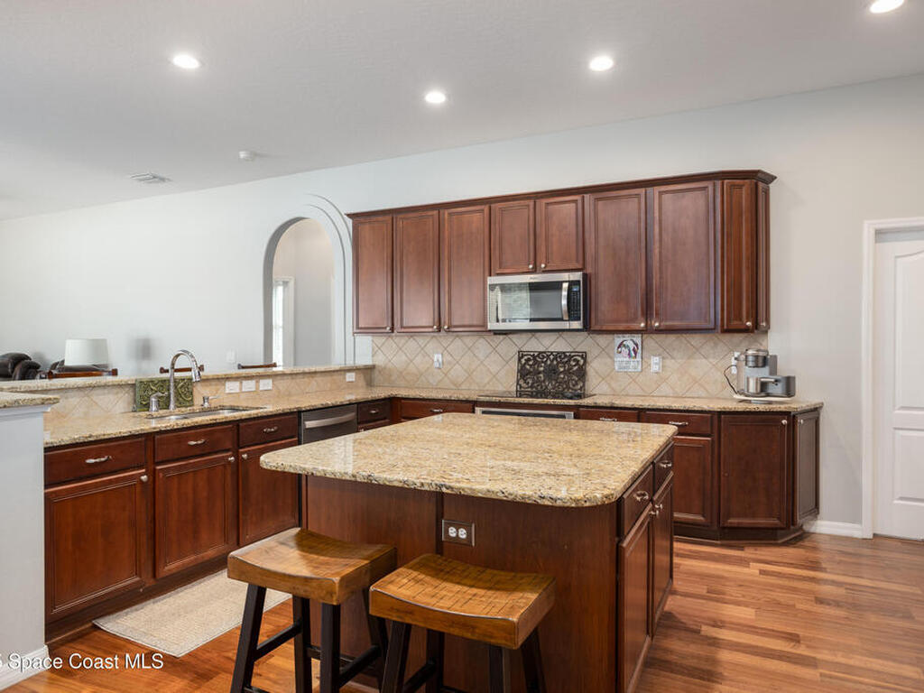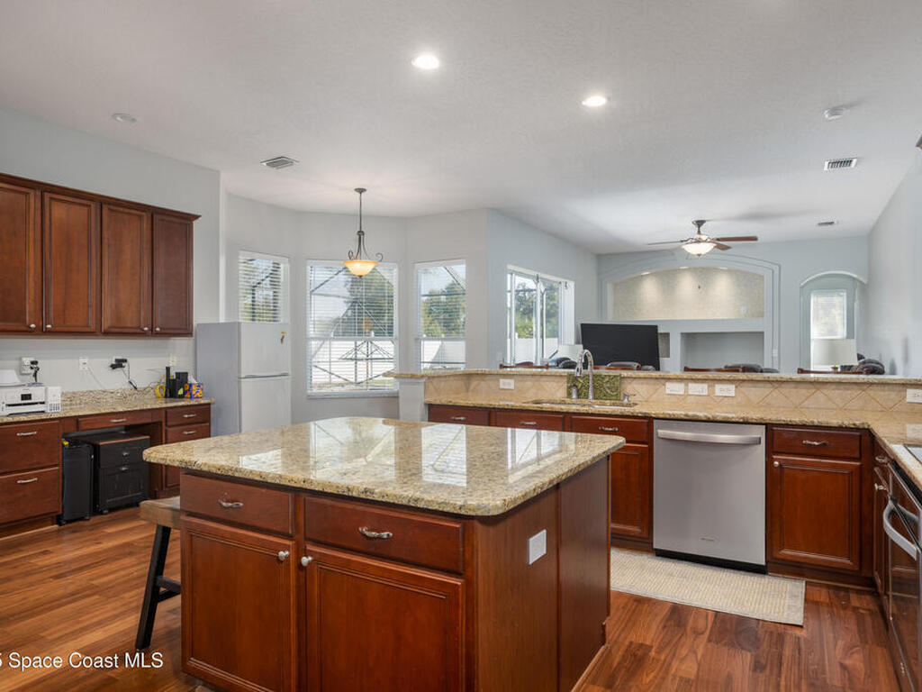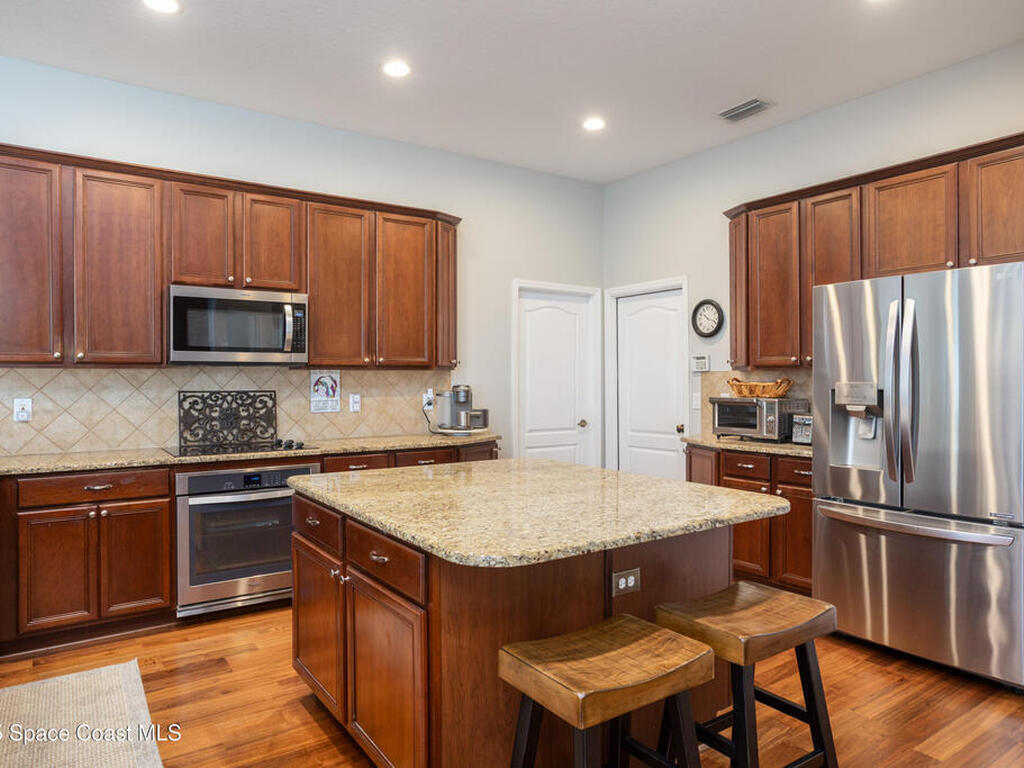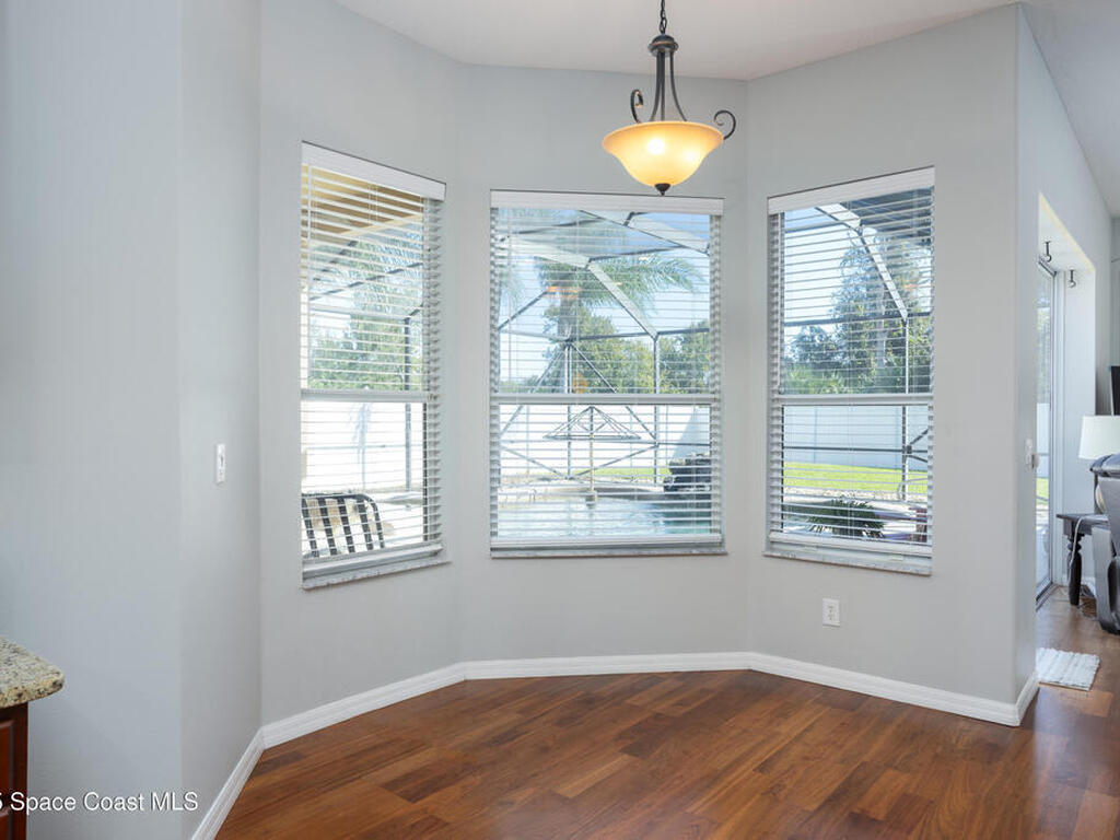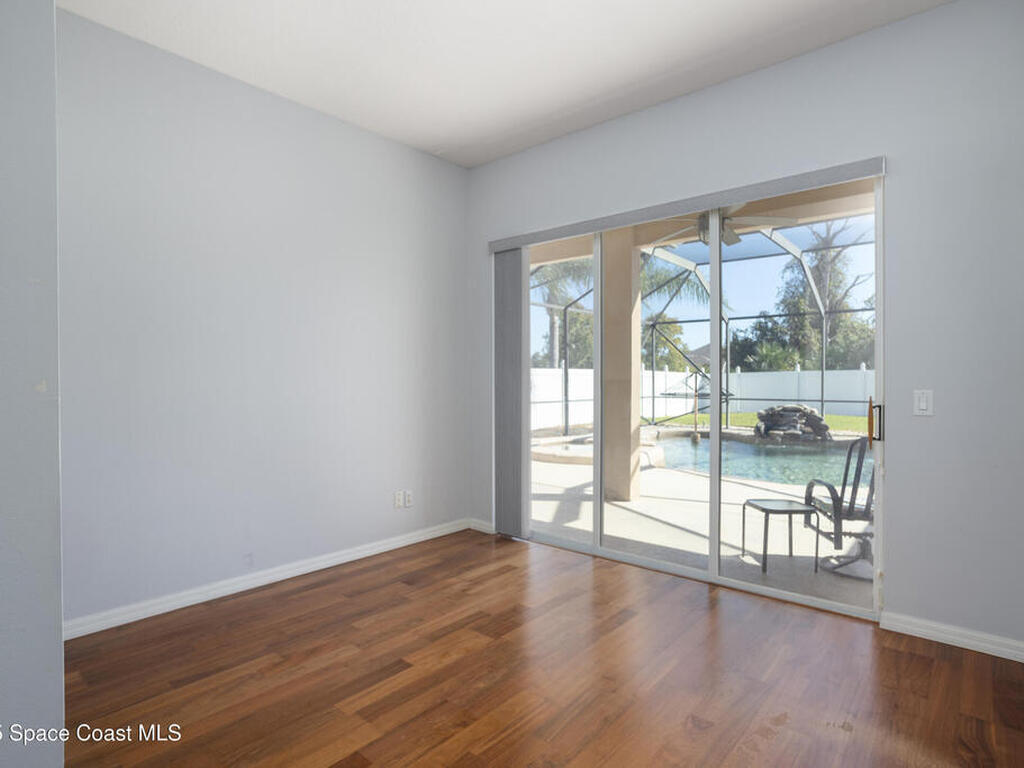 Welcome to this beautifully maintained 5-bedroom, 2.5-bath home located in the desirable Grand Haven community offering quick access to I-95, US-1, and the area's gorgeous beaches. Step inside to discover an open and airy floor plan with high ceilings and rich wood floors that create a warm, inviting atmosphere throughout. The spacious kitchen is the heart of the home, featuring granite countertops, a center island, breakfast bar, and a bay window nook overlooking the sparkling pool perfect for casual meals or morning coffee.The home offers a large inside laundry room complete with a utility sink for added convenience, and a 3-car garage providing plenty of space for vehicles, storage, or hobbies. Enjoy Florida living at its best in your natural screened pool area with spa and waterfall feature an ideal setting for relaxing or entertaining guests. The privacy-fenced backyard offers a tranquil retreat with plenty of space to play, garden, or unwind. AC'18, Roof '22, Wtr Htr '24