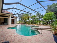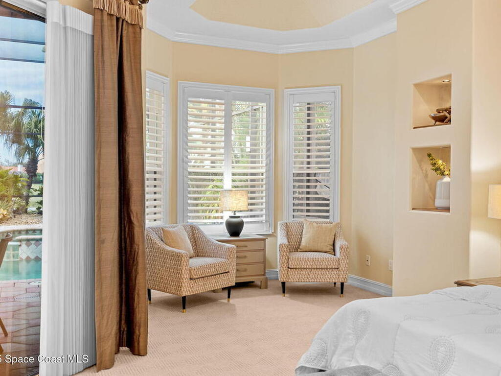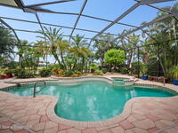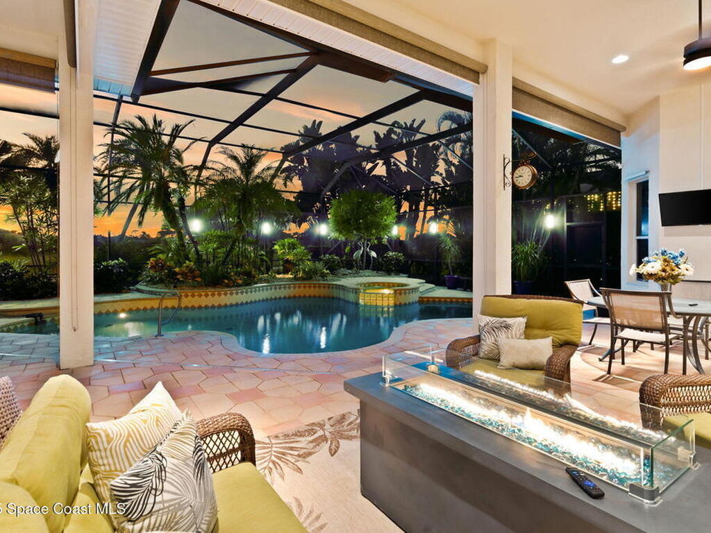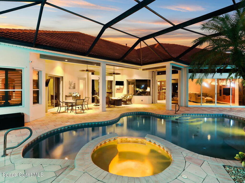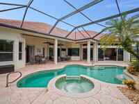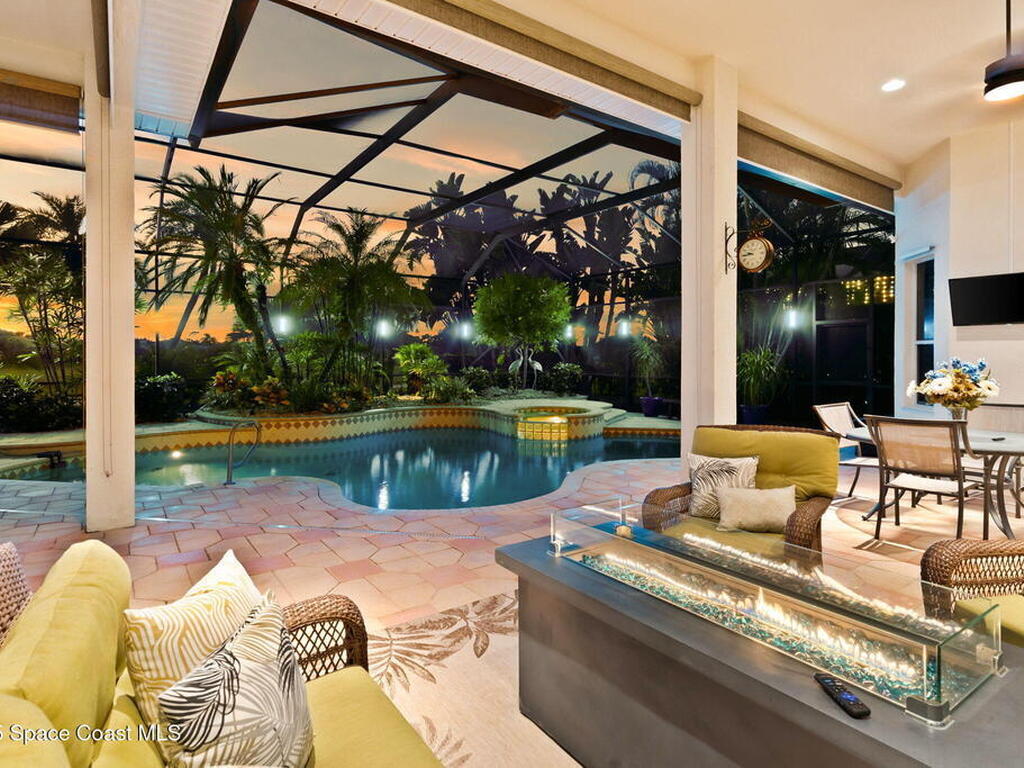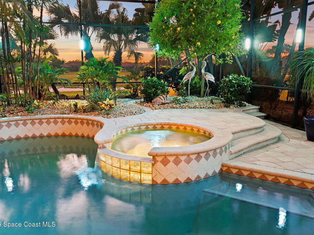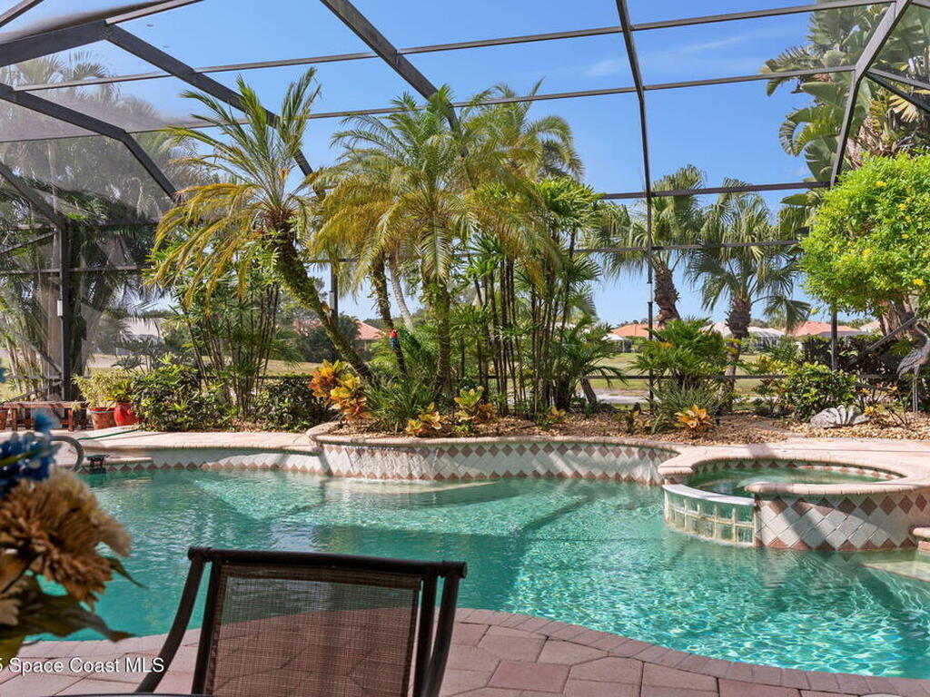 Luxury living in Baytree! Located on the 8th fairway in gated Saddleworth, this elegant single-story home offers over 3, 150 SF of open living with high ceilings, plantation shutters, tile floors, and premium finishes. Gourmet kitchen features granite countertops, large island, gas cooktop, Bosch dishwasher, new refrigerator, walk-in pantry, and breakfast nook overlooking the pool. Spacious primary suite with sitting area, dual custom closets, Jacuzzi tub, walk-in shower, and aquarium window. Custom office with built-ins plus 2 additional guest rooms. Enjoy resort-style outdoor living with screened lanai, covered seating, tropical landscaping, and heated saltwater pool & spa with waterfalls and LED lighting. Brick paver circular driveway, 3-car garage, natural gas generator, central vac, security system, hurricane shutters, and 2025 HVAC. Immaculate and move-in ready in one of Baytree's most desirable cul-de-sacs--minutes to top-rated schools, golf, parks, dining, and Suntree amenities