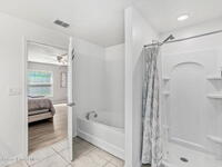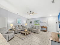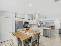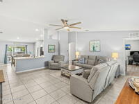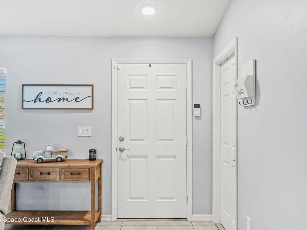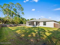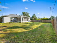 Welcome to Palm Bay! Tucked away on a quiet road and complete with a large fenced-in yard, this beautifully maintained home is ready for its new owner. Boasting over 1700 square feet, a high vaulted ceiling, and an open floorplan, there is ample space to make this house a home. In the primary suite, you'll find an oversized bedroom, a walk-in closet, and a bathroom which features both a shower & tub. The layout was designed with lifestyle in mind - a split plan that provides separation between the main living space and the secondary bedrooms. In addition to the 3 bedrooms, there is a dedicated office that could be used as a 4th bedroom or a den. Stepping outside to the covered porch, you'll enjoy the privacy of the 6-foot fence, neighbored on both sides by unbuilt wooded lots with an open field behind it. Gain the benefits of a new build (Built in 2021, concrete block construction) without high out-of-pocket expenses like a new fence or water softener system. Book your showing today!