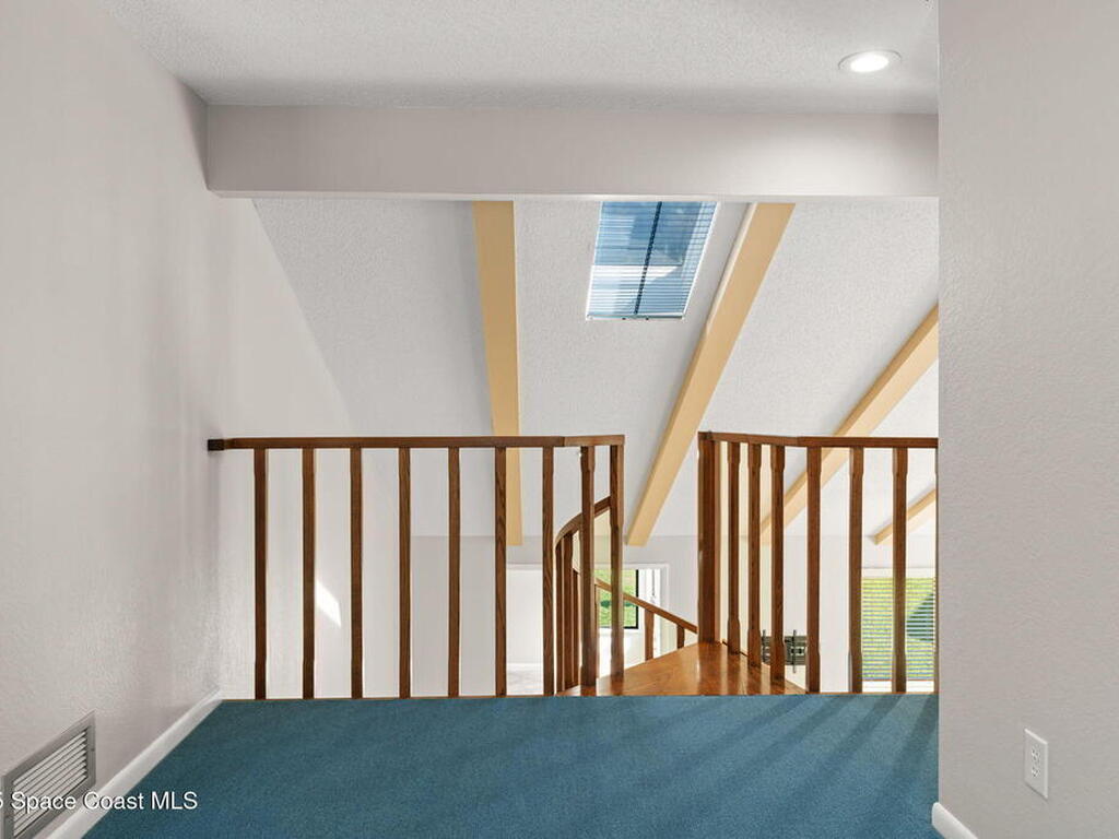 Welcome to your coastal oasis in the desirable Silver Sands area of New Smyrna Beach, just blocks from the No-Drive Beach. This custom-built, move-in-ready two-story home features 2 bedrooms, 2 bathrooms, a single-car garage, vaulted ceilings, and abundant natural light. The kitchen offers wood cabinetry, stainless steel appliances, a center island, and a dining nook. The first-floor primary bedroom overlooks the serene backyard. The spacious living room features ceiling beams, large windows, and a solid oak spiral staircase leading to a loft and guest suite with an updated ensuite bath and private entrance. A versatile bonus room is perfect for an office or studio. Enjoy a fully fenced oversized backyard with room for a pool or patio. Major updates include 2025 roof and exterior paint, 2022 A/C, 2021 septic drainfield, and newer appliances. Located near Hiles Boat Ramp, Canaveral National Seashore, and Flagler Avenue, this home offers true beachside living.