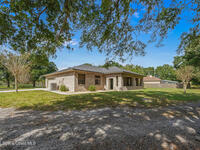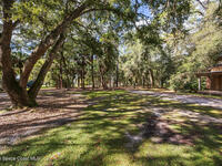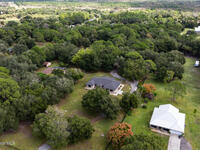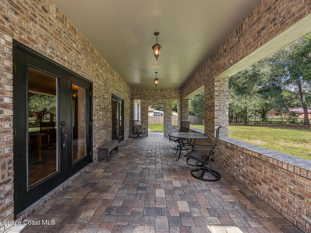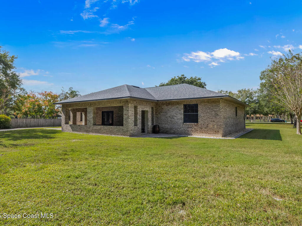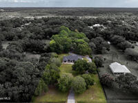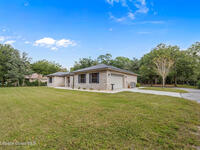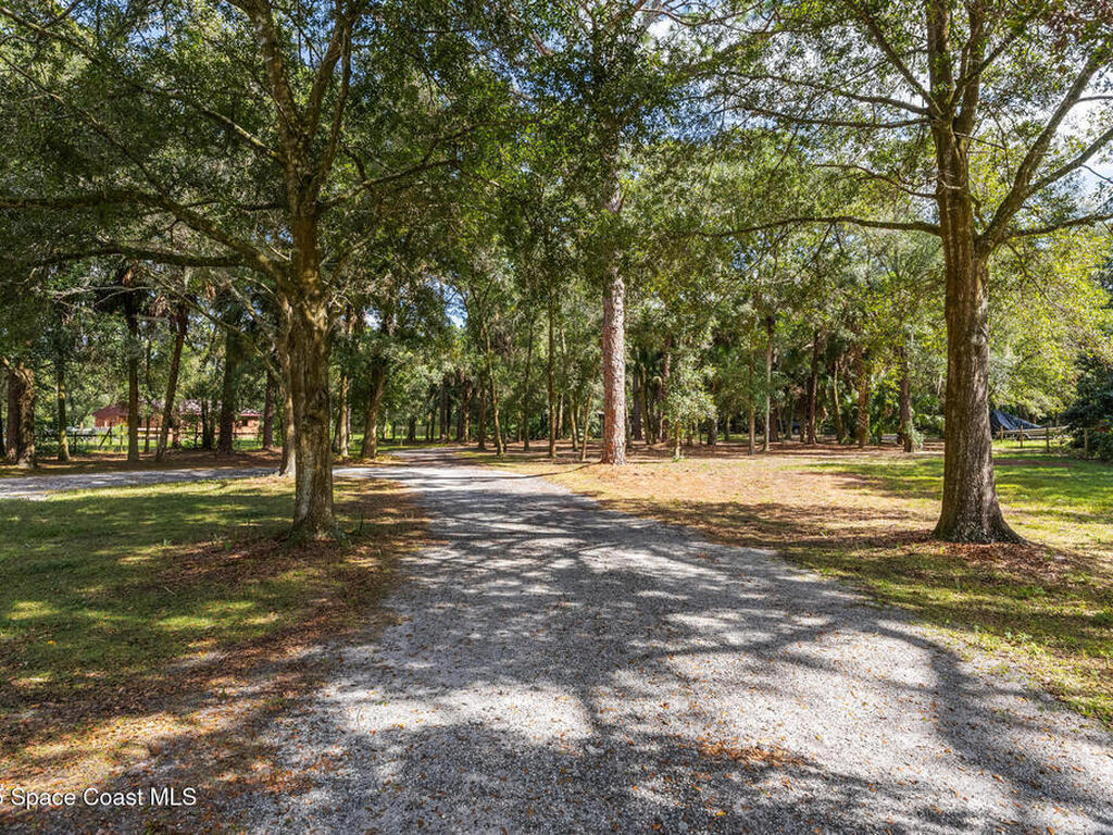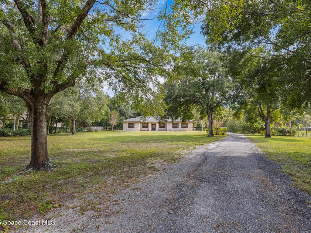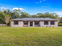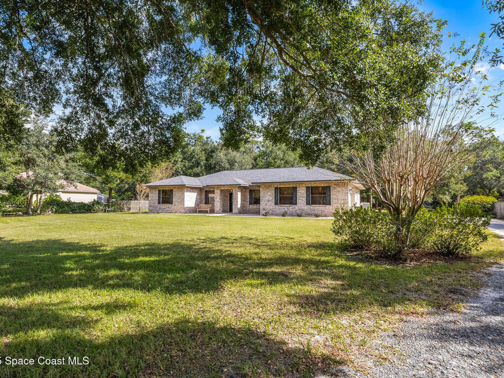 Welcome to this beautifully maintained brick-on-block home, with a sprawling 2.38 acres. This spacious home features 3 oversized bedrooms, 2 bathrooms with desirable split floor plan, separate dining room, and a dedicated office. The spacious layout is perfect for both relaxation and entertaining. Step outside to discover an impressive back porch with pavers. Nestled in the backyard of this picturesque property, you will find a tow-story workshop that exudes character and warmth, crafted from board and batten rough-sawn pine. The exterior boasts a timeless appeal, that harmonizes beautifully with the surrounding nature. You can embrace the charm and functionality of this rustic gem. The large yard offers plenty of room to relax, garden, or expand as your surrounded by the beauty of mature oak trees and vibrant crepe myrtles. Located with easy access to Kennedy space center and all major highways. This home is for anyone looking for space, function, and a bit of country charm.