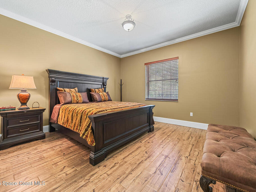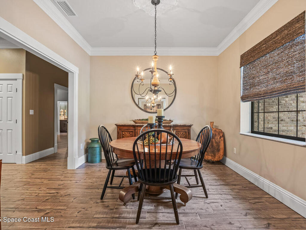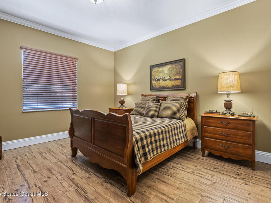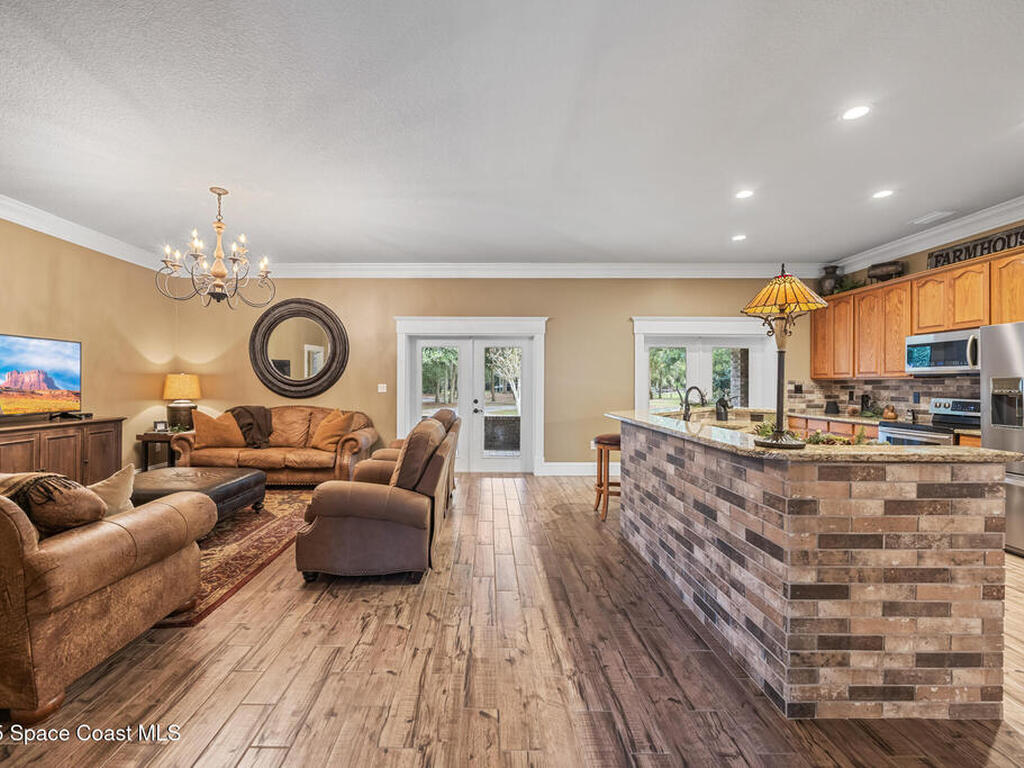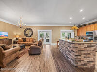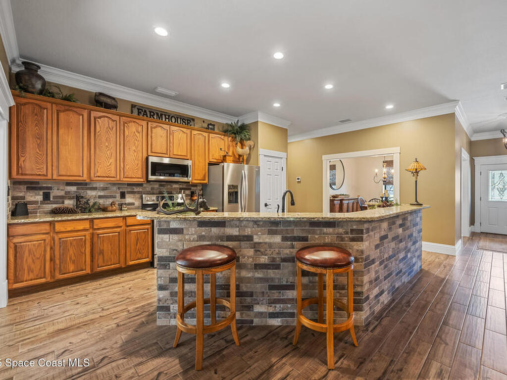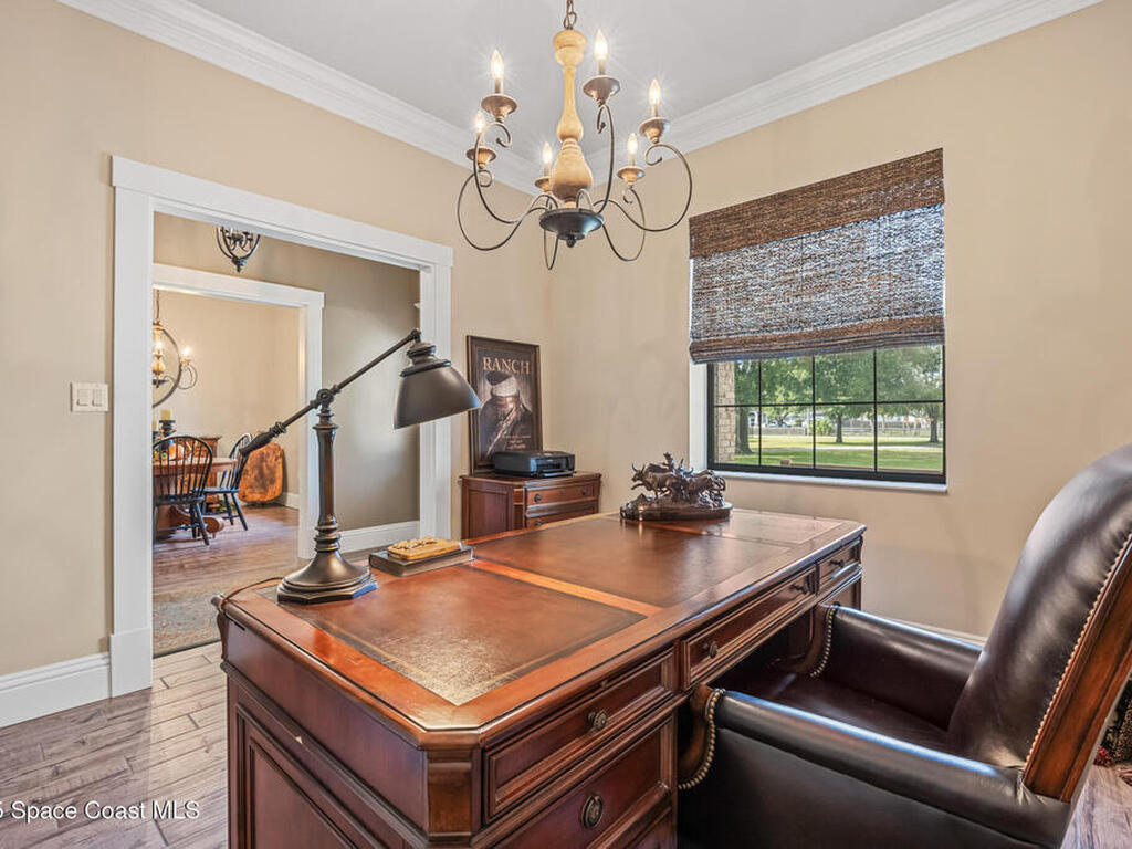 Welcome to this beautifully maintained brick-on-block home, with a sprawling 2.38 acres. This spacious home features 3 oversized bedrooms, 2 bathrooms with desirable split floor plan, separate dining room, and a dedicated office. The spacious layout is perfect for both relaxation and entertaining. Step outside to discover an impressive back porch with pavers. Nestled in the backyard of this picturesque property, you will find a tow-story workshop that exudes character and warmth, crafted from board and batten rough-sawn pine. The exterior boasts a timeless appeal, that harmonizes beautifully with the surrounding nature. You can embrace the charm and functionality of this rustic gem. The large yard offers plenty of room to relax, garden, or expand as your surrounded by the beauty of mature oak trees and vibrant crepe myrtles. Located with easy access to Kennedy space center and all major highways. This home is for anyone looking for space, function, and a bit of country charm.