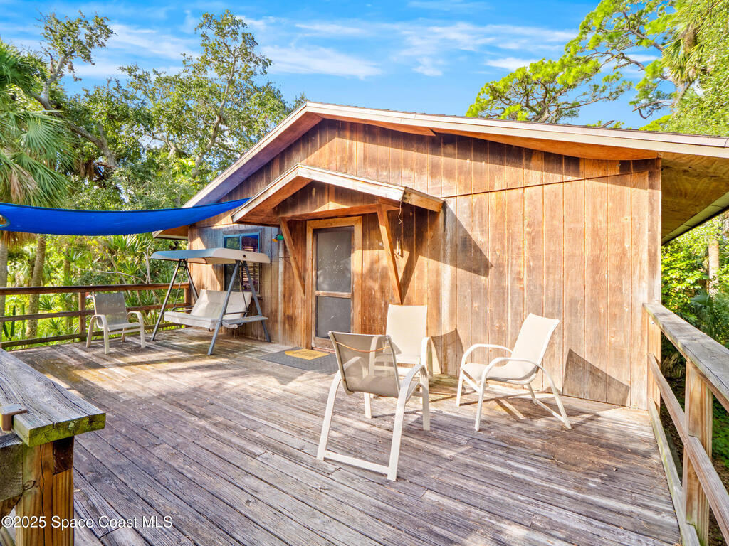 Welcome to your island retreat! On 0.86 acres there is plenty of space for your toys and hobbies! This home features 3 bedrooms, 2 bathrooms, two living spaces and an open kitchen. You have a front balcony and a back screened in balcony. The ground level has a carport and an oversized workshop with plenty of space! With the river right across the street from you and woods behind, you have a tranquil atmosphere at this property. Only one mile to highway 520 which is filled with shopping and restaurants. Only 10 minutes to the world famous Cocoa Beach filled with shopping, dining, beaches, parks and much more!