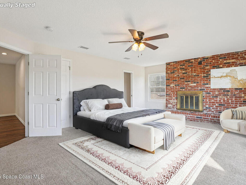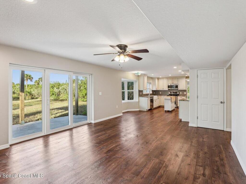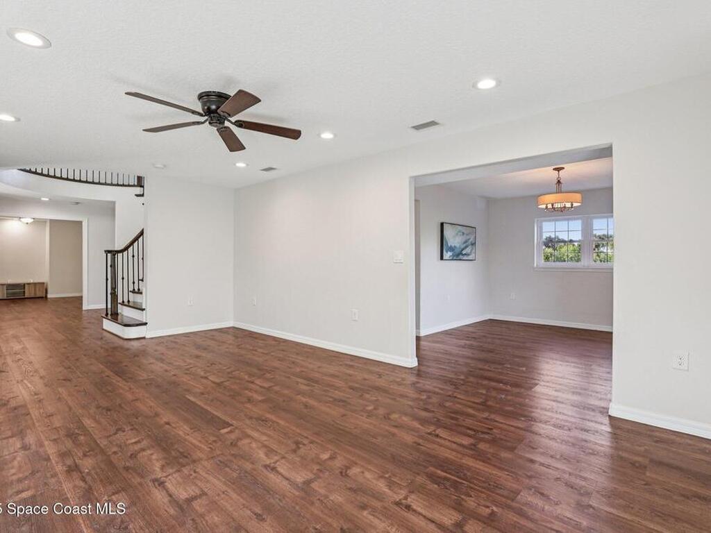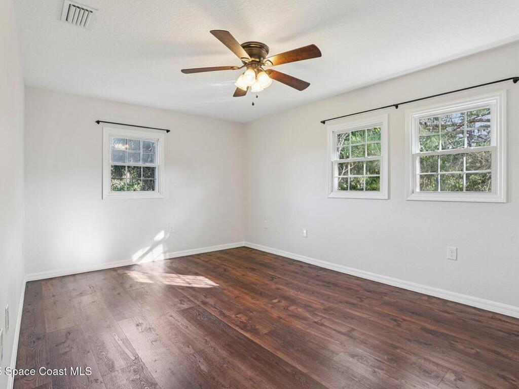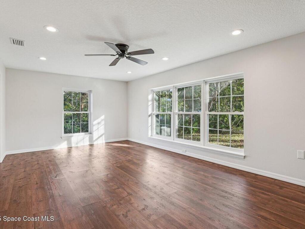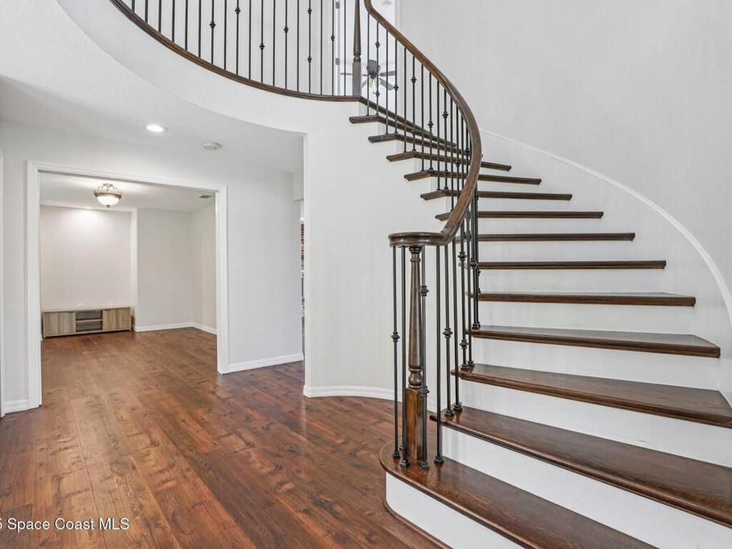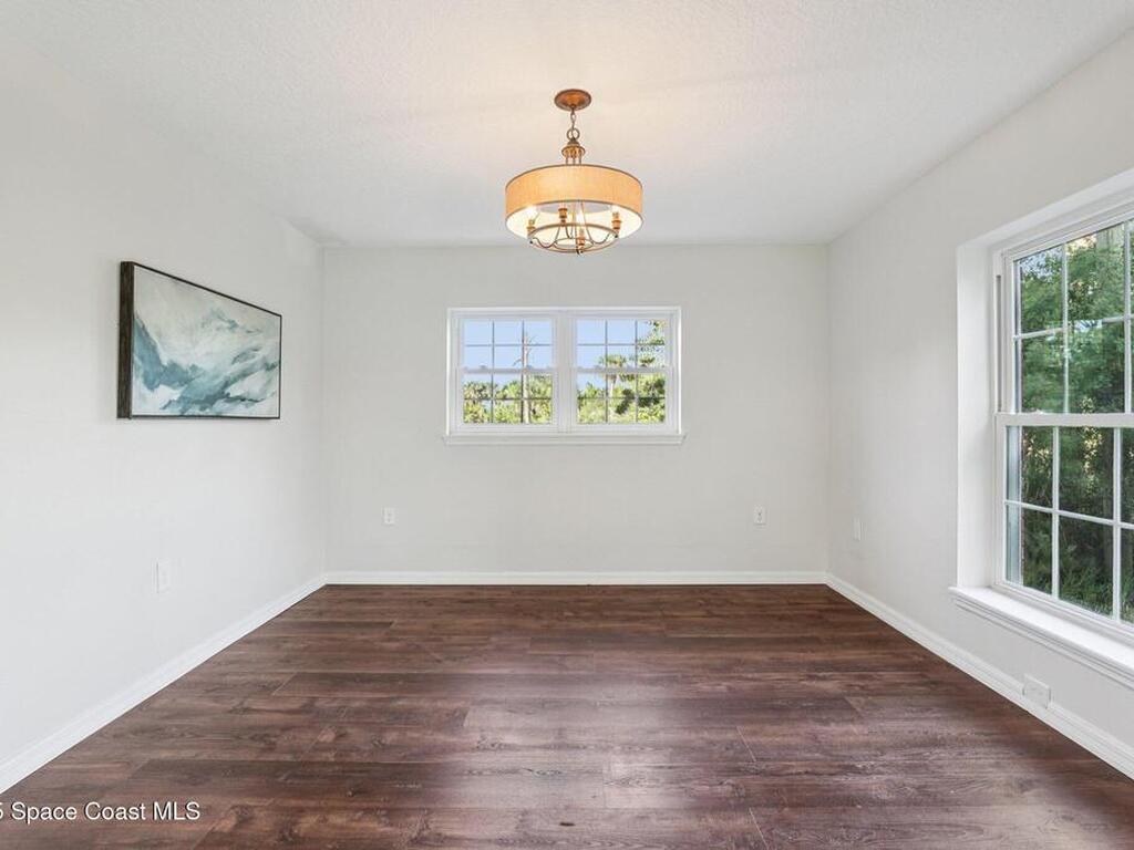 Welcome to this beautifully renovated two-story residence offering 3, 055 sq. ft. of living space under A/C, set on a private 2.01-acre lot in desirable North Merritt Island. This spacious home features 5 bedrooms and 3 full bathrooms, including four bedrooms and two baths upstairs, plus a downstairs bedroom--ideal for guests or use as a home office--along with a full bath. Completely renovated in 2018, the home includes re-piping, a newer roof, impact windows, and closed-cell foam insulation. A new septic system was installed in 2021. Additional enhancements include an asphalt driveway, screened front lanai, and a newly rebuilt upstairs rear deck--perfect for enjoying spectacular rocket launches right from home. Inside, you'll find an inviting floor plan with an eat-in country kitchen, formal living room, dining room, family room, and indoor laundry room. The washer and dryer convey. The home also offers two fireplaces and a 2-car garage. The expansive lot provides plenty of room for a