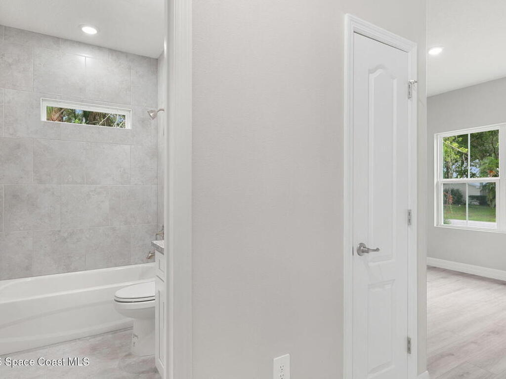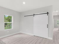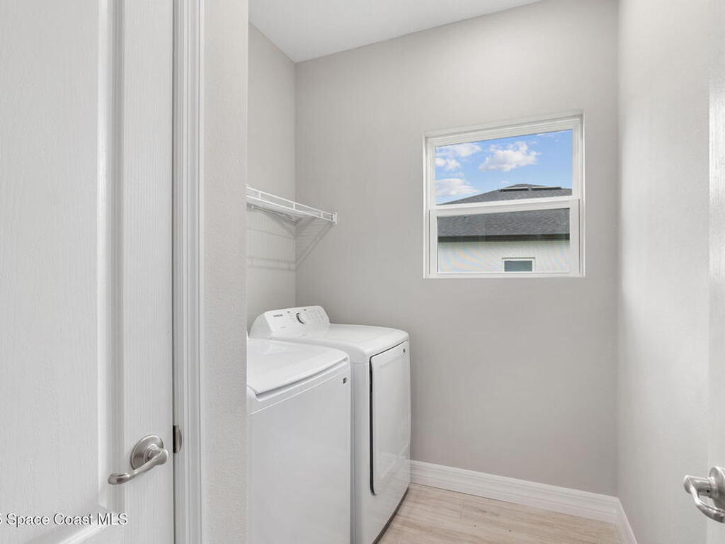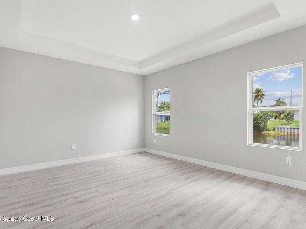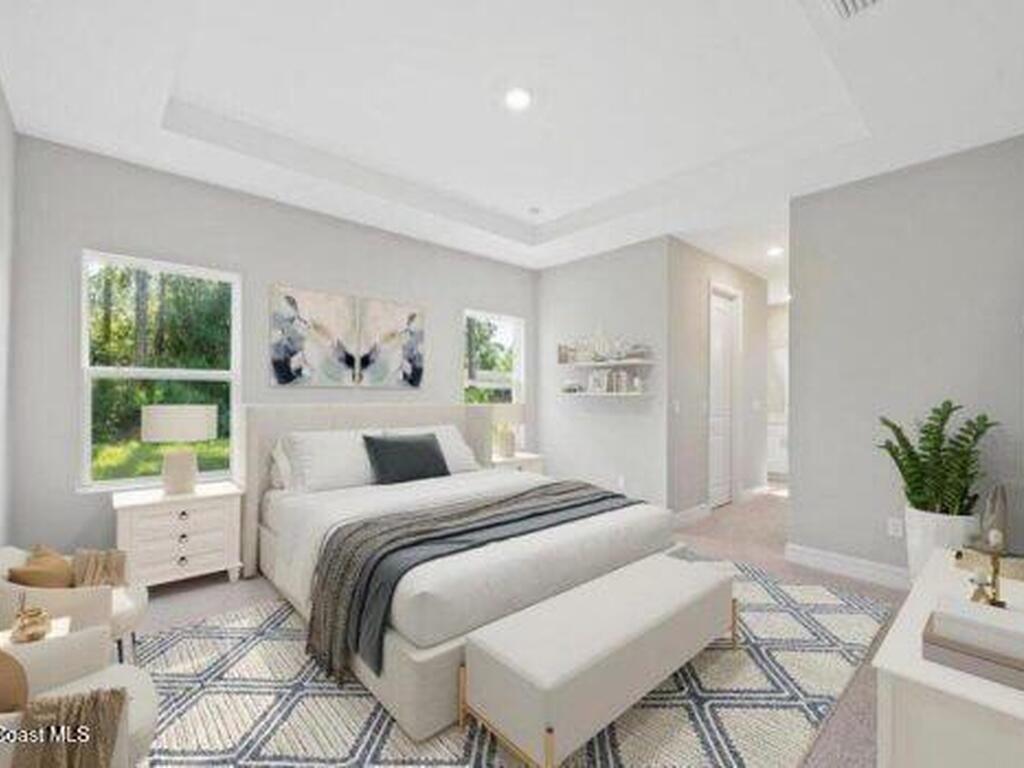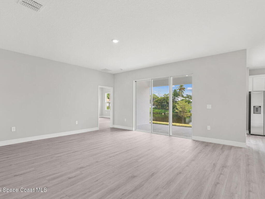 This stunning 4-bedroom, 3-bath, 2, 092 sq ft home sits on an oversized 0.34-acre corner lot with a pond and canal behind and on the side, offering rare water views and beautiful sunrises and sunsets. The property features a custom curved paver driveway with RV/boat parking, city water, septic, and FPL service. Inside, enjoy 9'4'' ceilings, LVP flooring throughout (That's right no carpet), and a chef's kitchen with white cabinets, Calacatta quartz countertops, Samsung stainless steel appliances (washer & dryer included), and a white subway tile backsplash with dove-gray grout. The home includes a frameless master shower, glass front door, upgraded Maxim lighting, and Moen chrome fixtures. Exterior upgrades include Shadow Grey shingles, black drip edge, Blue Ridge Cobble stone, and beautifully customized and fully irrigated landscape. A rare blend of premium finishes, modern design, and exceptional waterfront living for maximum privacy.