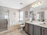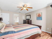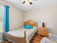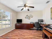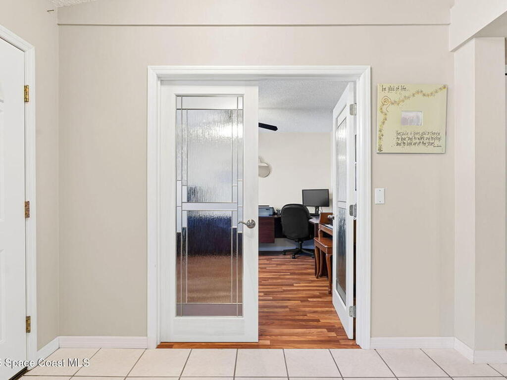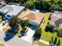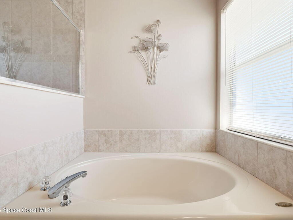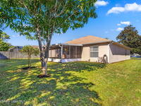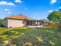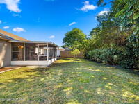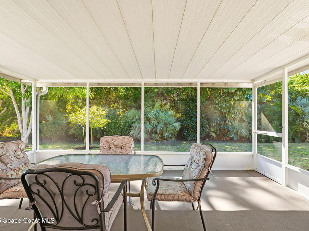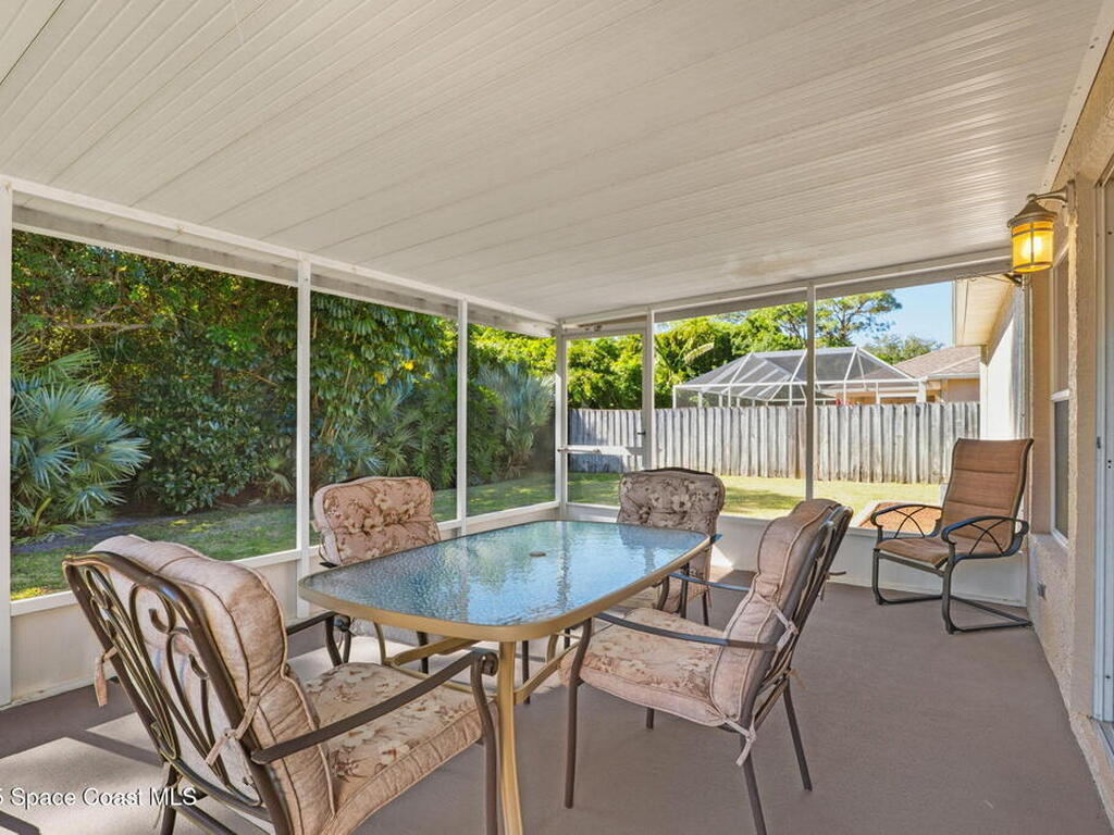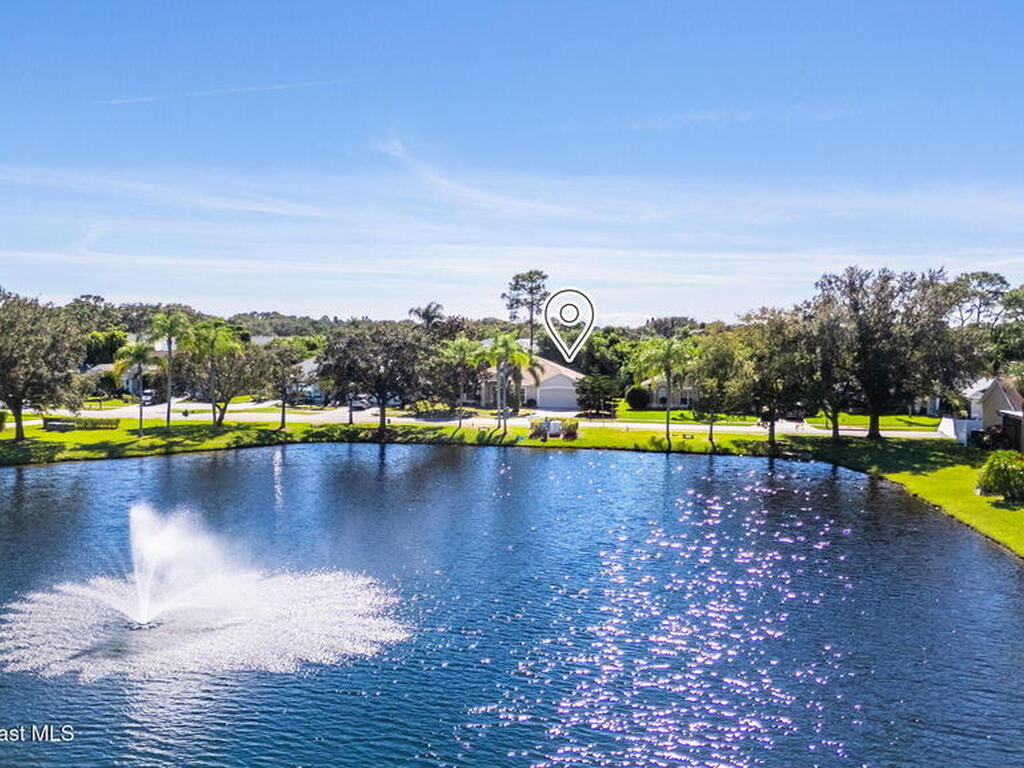 This beautifully maintained vacation home has been lovingly cared for since 2012 with a major remodel. Located in the desirable Sunrise community (not part of Suntree Master Association) with low annual HOA, this concrete block home offers lake views from the front door, dining room, and office, plus a wooded area behind. Features include a 5-year-old roof, brand-new AC, no carpet, fresh interior paint, quality laminate flooring, vaulted ceilings, and a spacious screened porch. Split floor plan with a large primary suite, walk-in tiled shower, garden tub, and double sinks. Enjoy a roomy kitchen with oak cabinets open to a bright family room. Vaulted ceilings and an abundance of windows and sliders fill the space with natural light and provide beautiful views of your private backyard. The dedicated office with elegant French doors can also serve as a fourth bedroom.Enjoy Florida living year-round on the oversized screened porch. Perfect for outdoor living, relaxation or