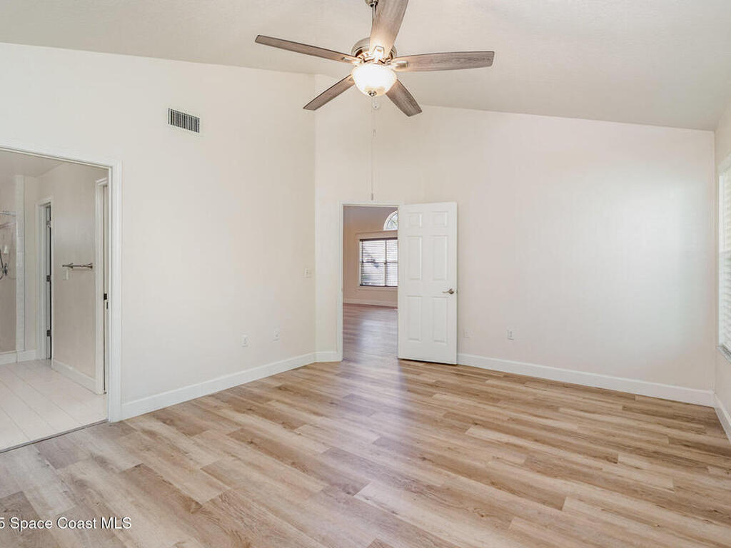 Welcome to Village Woods, a gated and tree-lined community that feels lush and serene. This beautiful home offers a rare primary bedroom on the first floor, with two additional bedrooms, a full bath, and an extra loft upstairs--perfect for guests, hobbies, or a home office. The spacious living room with formal dining area provides an inviting layout for entertaining. Just off the living room, enjoy a sunlit enclosed bonus room, ideal as a den, office, or creative space. The updated kitchen features high-end finishes, modern cabinetry, a wine fridge, and is just off the living areas for easy flow. The HOA covers lawn service, offering low-maintenance living, and you're just a short walk from La Cita Country Club for golf, dining, and social events. Located minutes from I-95, local beaches, and major employers such as Kennedy Space Center, SpaceX, and Blue Origin, this home blends comfort, convenience, and lifestyle! Some pictures are virually staged.