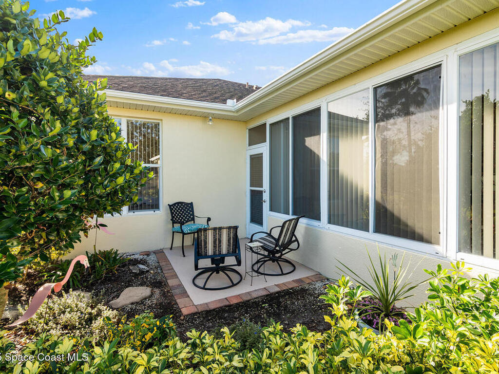 Charming villa in the desirable Viera East Golf Course community, featuring a spacious great room that flows into the dining area & kitchen for a truly open layout. The completely updated kitchen shines with crisp white cabinets, crown molding, glass display doors, gorgeous quartz countertops, & beautiful new tile flooring. The open design allows you to cook & entertain seamlessly, staying fully connected with guests. The generous owner's suite offers a walk-in closet & an ensuite with a raised-height vanity featuring two sinks, a soaking tub, & a tastefully tiled shower. A private hallway leads to two welcoming guest rooms & a full guest bath. Through sliding glass doors, a large A/C-cooled Florida room becomes a favorite retreat, opening to a private paver patio perfect for relaxing. Lovingly updated & meticulously maintained, this home is made even easier by an HOA that handles lawn & landscape care with irrigation, exterior paint, roof repair & replacement, & structural insurance.