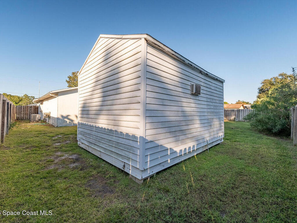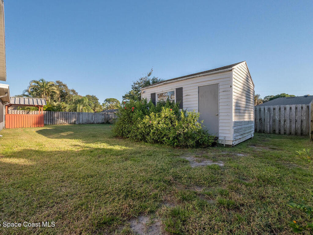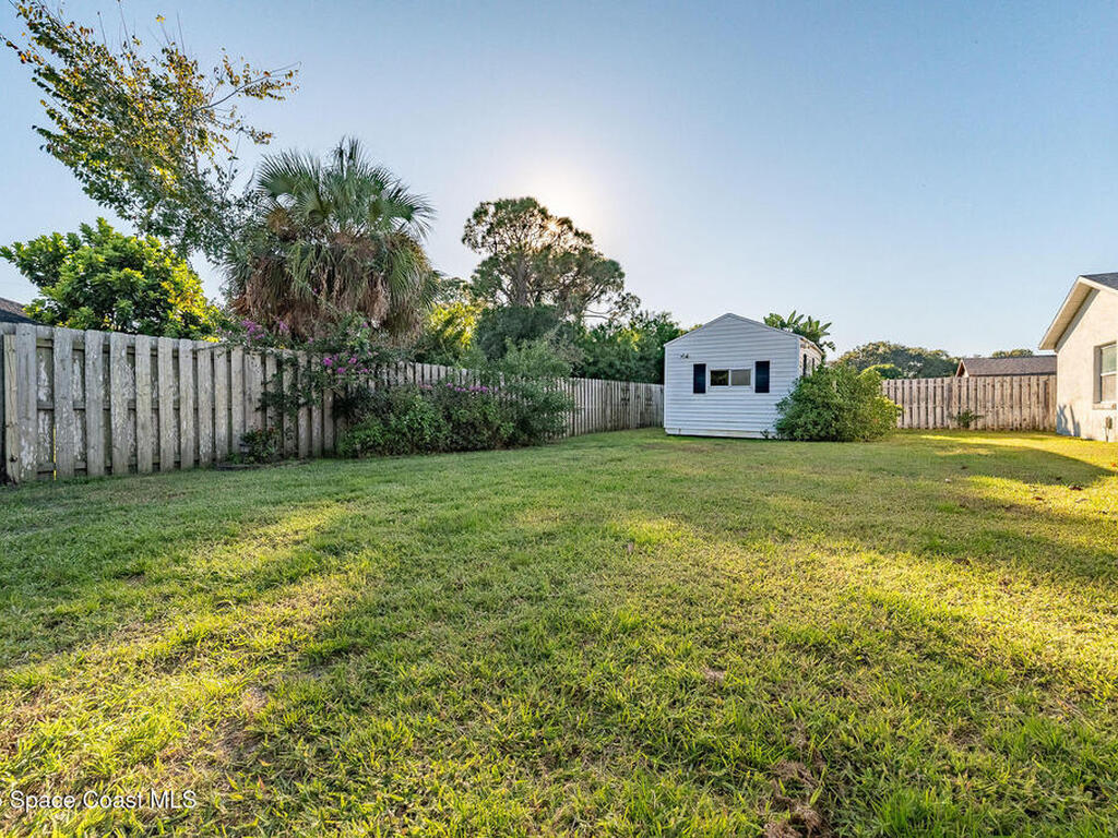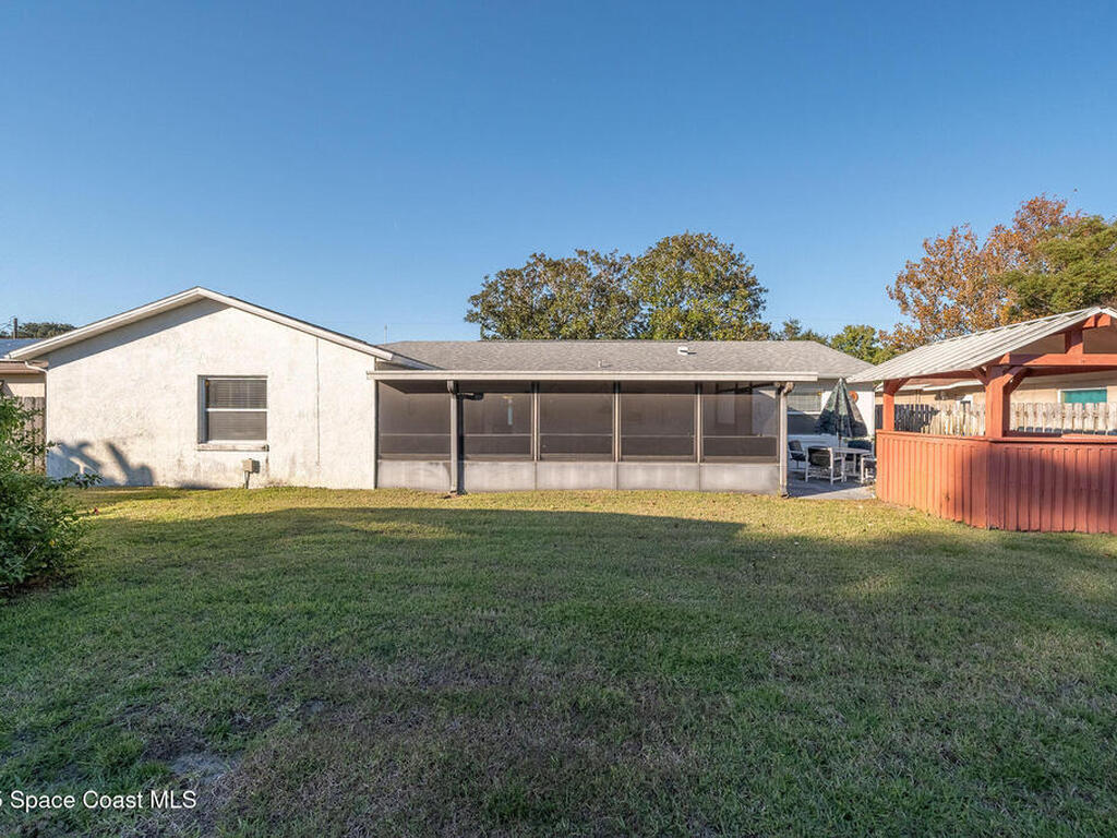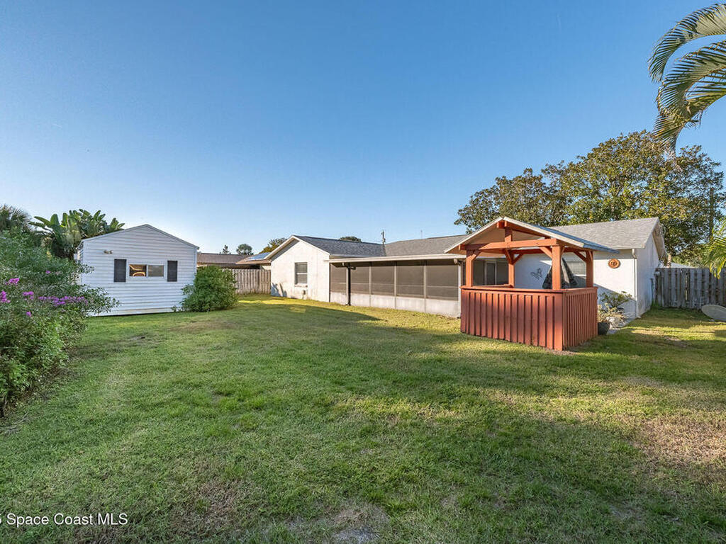 Discover this well-cared-for, move-in-ready 3-bedroom, 2-bath home in the heart of Rockledge. This accommodating split floor plan features a spacious primary bedroom and an open living area that flows seamlessly into a large dining room and nicely sized kitchen. Enjoy peaceful mornings and breezy evenings on the over-sized 14 x 25 screened patio, complete with vinyl windows.Step outside to your private backyard oasis! A fully fenced yard with a storage shed and a charming gazebo, perfect for creating your ideal grilling or entertainment space. Roof 2018, AC 2017, water heater 2016, new smart thermostat and irrigation pump.Centrally located in Brevard County, you'll love the easy access to beaches, shopping, I-95, and a short drive to Orlando