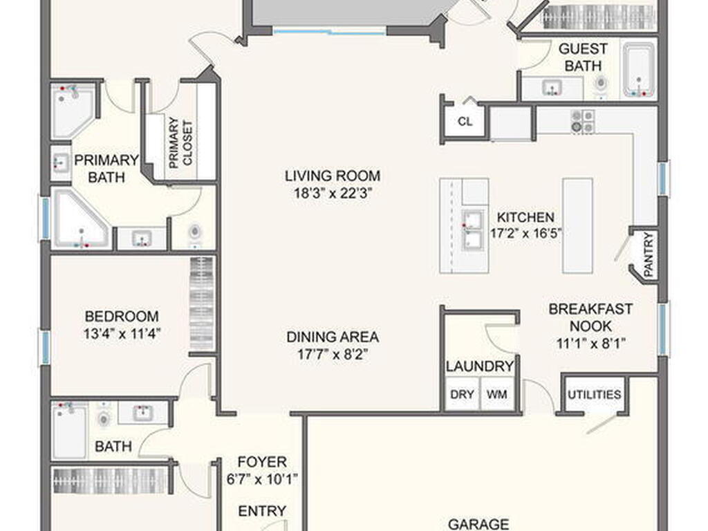 Ceiling Fan(s), Eat-in Kitchen, Entrance Foyer, Guest Suite, Kitchen Island, Open Floorplan, Pantry, Primary Bathroom -Tub with Separate Shower, Primary Downstairs, Split Bedrooms, Walk-In Closet(s)