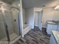 Bright and open, this 4 bedroom, 3 bath home welcomes you with soaring 10' ceilings, abundant windows, and plenty of natural Florida light. A spacious living and dining area anchors the home, with a versatile flex room off the foyer--perfect for a sitting room, game room, or office. At the heart of it all, the kitchen flows easily into the living spaces, ideal for entertaining or everyday gatherings. The split floorplan offers privacy: the owner's suite features dual closets and a spa-like bath with soaking tub, shower, dual vanities, and private water closet. Two bedrooms share a bath with dual sinks, while a private bedroom and bath create a comfortable guest suite. A covered lanai extends the living space outdoors, accessible from the living room, owner's suite, and secondary bath. Thoughtful finishes include ceiling fans, lever-handle hardware, 5'' baseboards, seeded glass fixtures, and stainless appliance