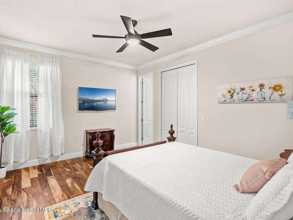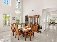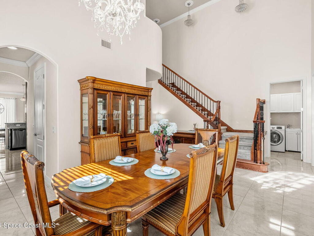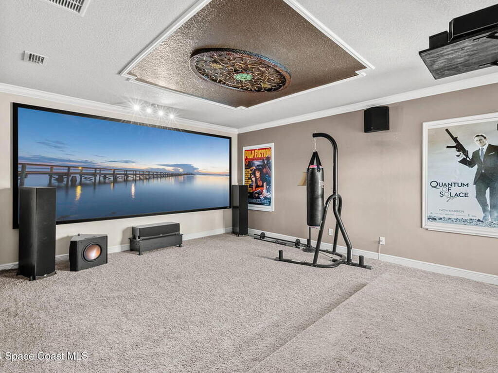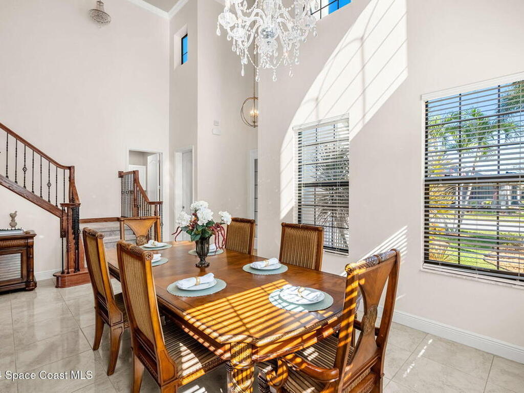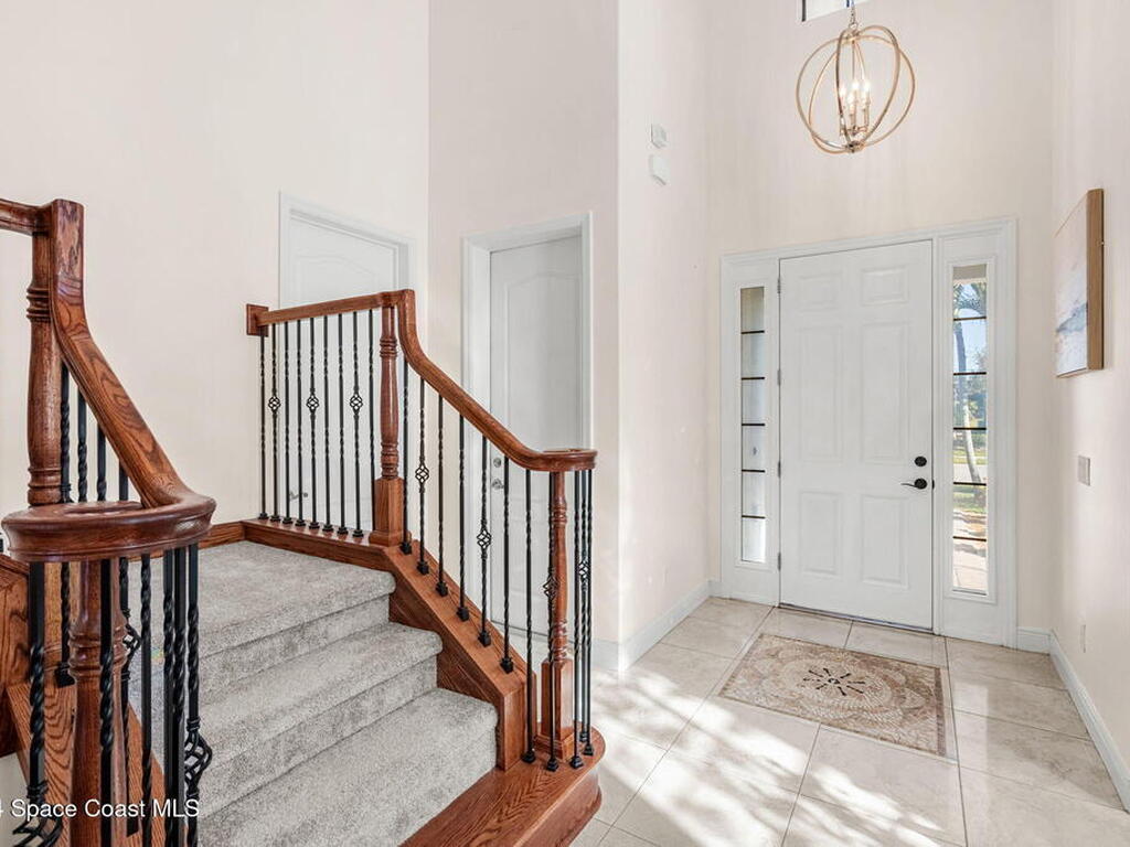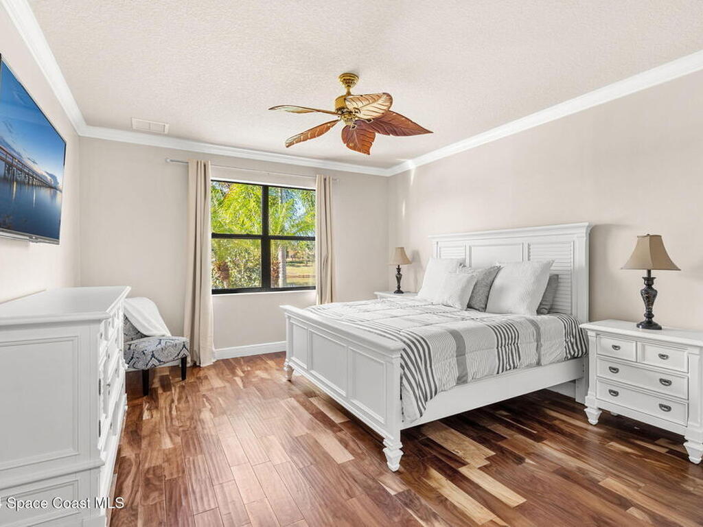 Brand NEW ROOF just installed! Located in the prestigious Strom Park in West Viera, you'll find this beautiful 5 bedroom two story home. We are calling this one ''Peace on the Pond'' with its' gorgeous lot offering incredible sunsets, along with tranquil lake and natural views. Built in 2015 with over 3100' square feet of living space, there is plenty of room for the whole family to relax, entertain and enjoy. Well appointed with upgrades such as granite, 8' doors, crown molding, rich wood cabinetry, custom closets, glass tile accent walls, and an electric feature fireplace. An open layout, multiple living and dining options and abundant storage allows elegance to meet practicality. Downstairs you'll find the Primary suite along with a second bedroom/en-suite~perfect for multi-generational living, home office or gym. One of the 3 upstairs bedrooms is oversized and used for a Home Theatre (all equipment conveys!) Impact windows on the front of the home and the second story.