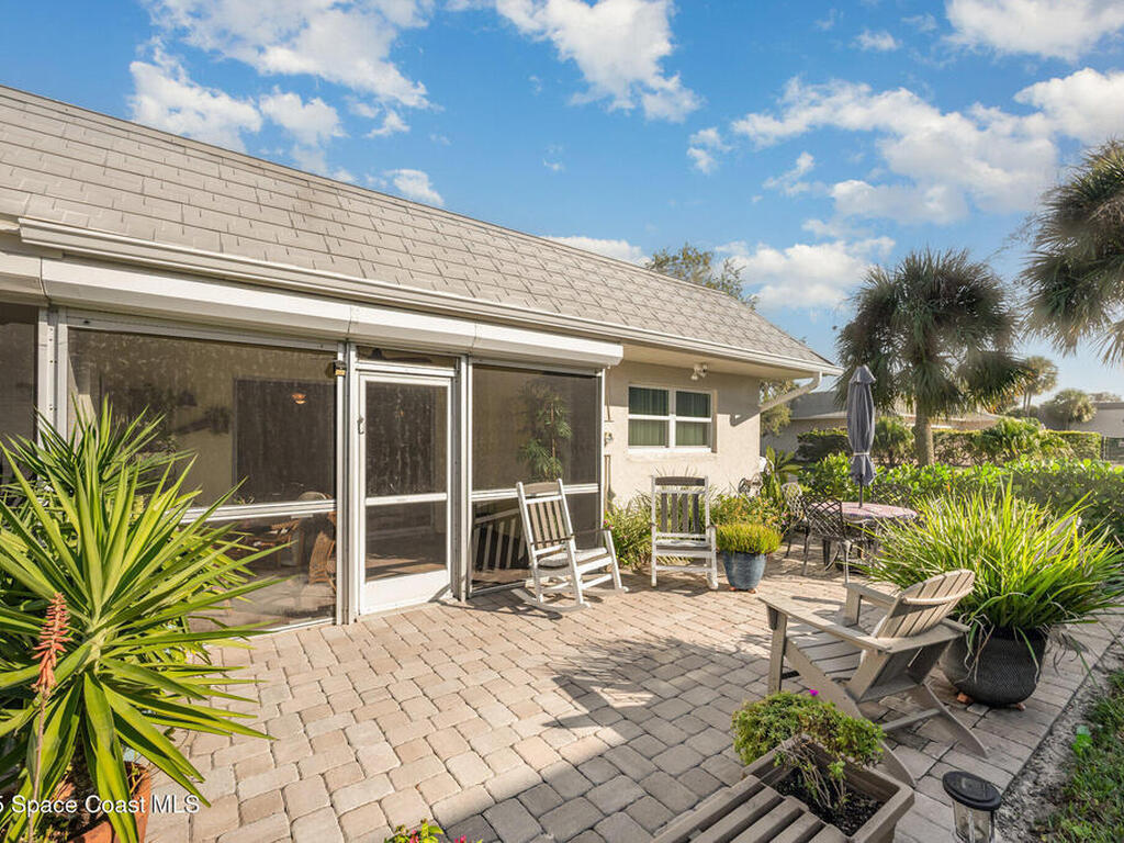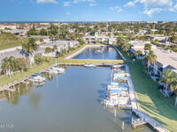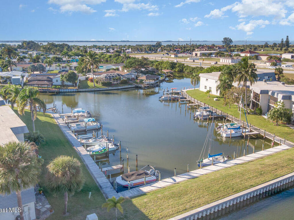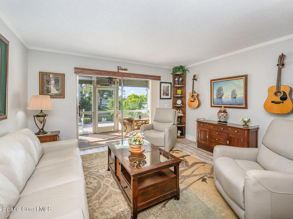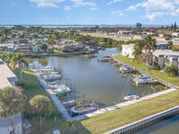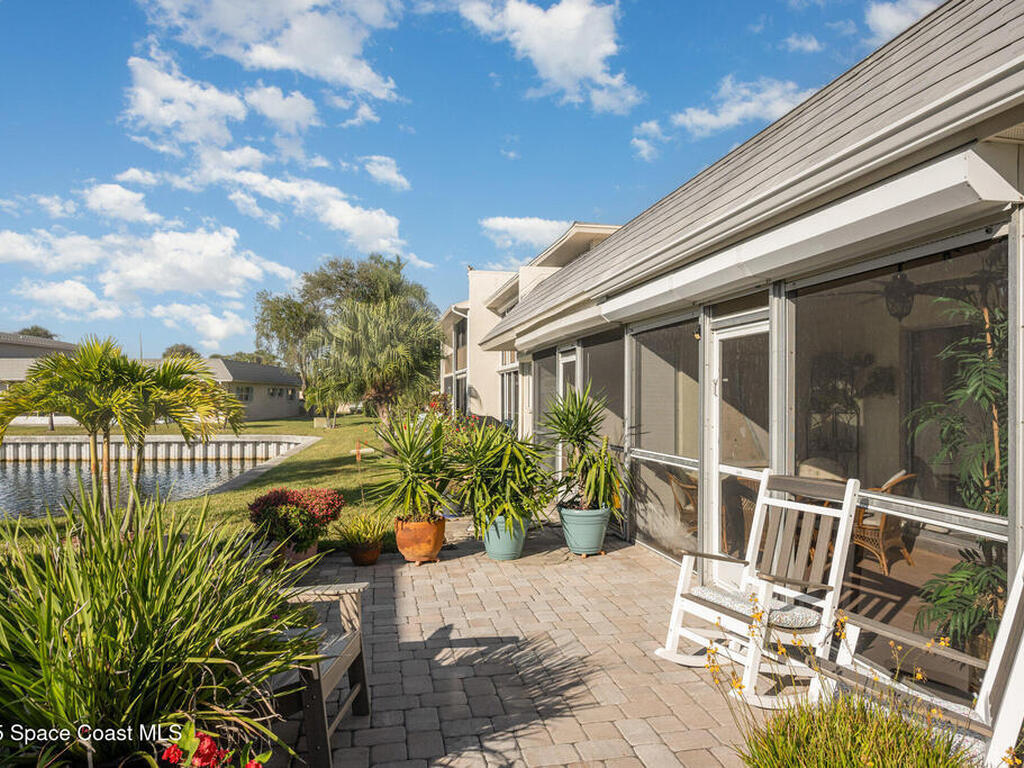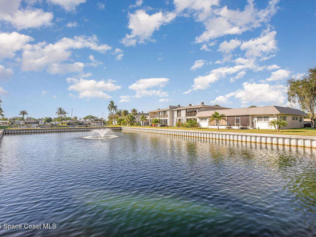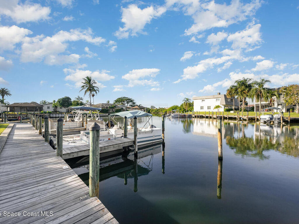 This beautifully remodeled 1-story end-unit waterfront townhome is just blocks from the Atlantic Ocean and includes your assigned boat slip. Flooded with natural light through new impact windows, the interior features new LVP flooring, tile in the guest bath, and a stunning kitchen with quartz countertops, stainless appliances, deep workstation sink with accessories, soft-close cabinetry, marble backsplash, and touch lighting. The dining area offers a wine and beverage bar perfect for entertaining. The owner's en suite includes a designer walk-in closet and double sinks. Additional upgrades include crown molding, faux wood blinds, and fans throughout. Enjoy the paved front courtyard or relax on the paver patio overlooking the Banana River canal or on your XL screened porch. A/C 2019, newer hot water heater, and upgraded electrical panel. Community amenities include pool, pickleball, and tennis. You won't believe it until you see it so make your appt today!