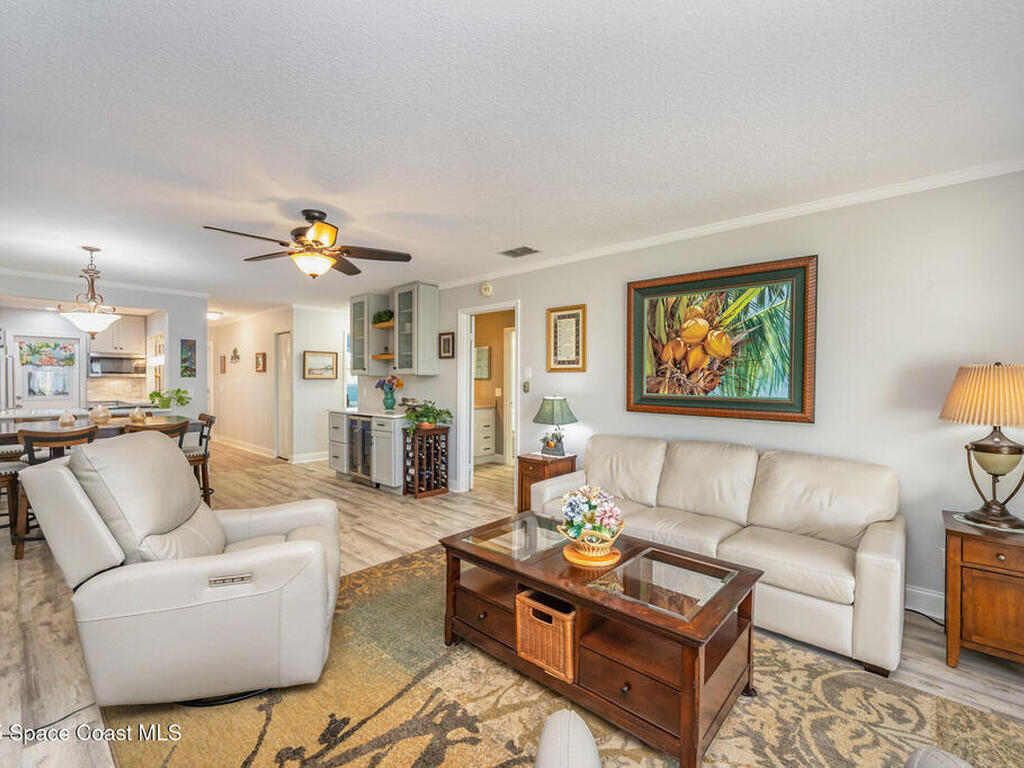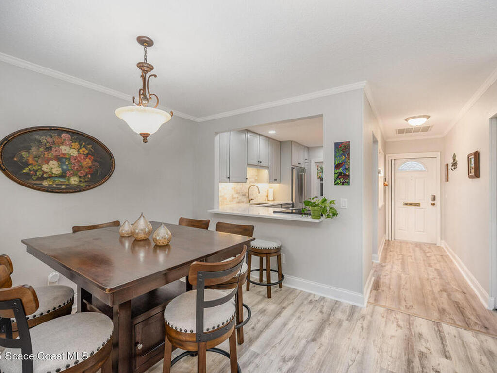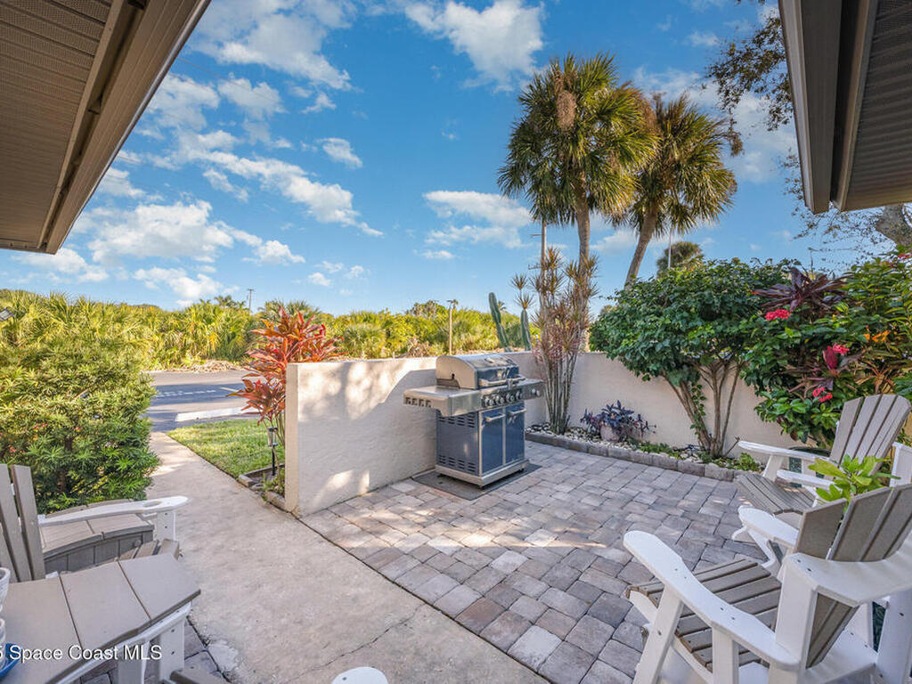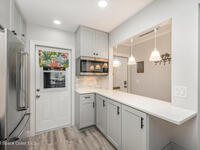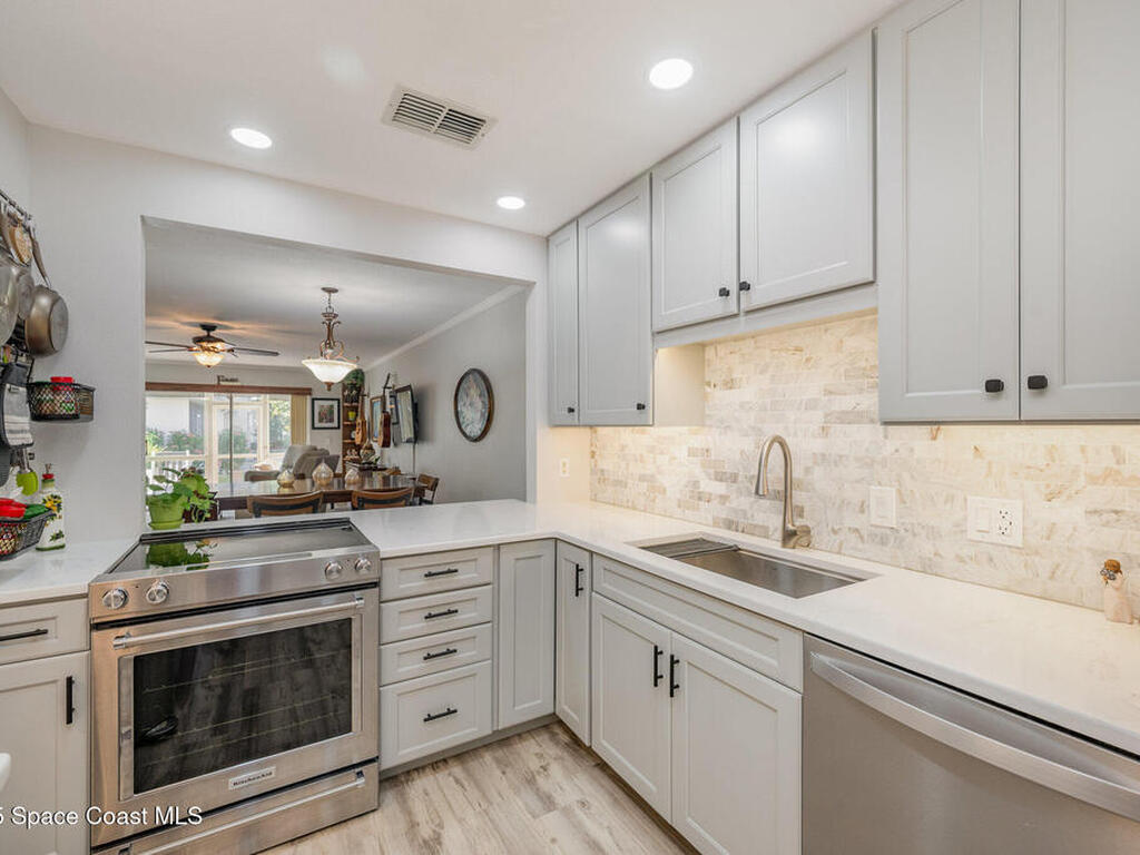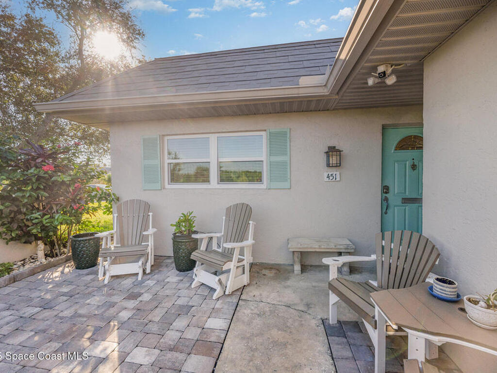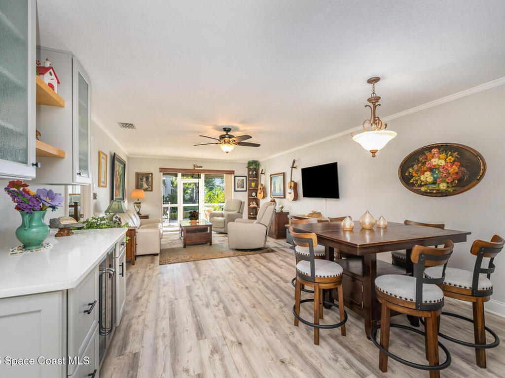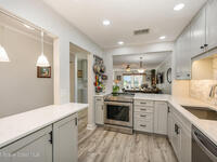 This beautifully remodeled 1-story end-unit waterfront townhome is just blocks from the Atlantic Ocean and includes your assigned boat slip. Flooded with natural light through new impact windows, the interior features new LVP flooring, tile in the guest bath, and a stunning kitchen with quartz countertops, stainless appliances, deep workstation sink with accessories, soft-close cabinetry, marble backsplash, and touch lighting. The dining area offers a wine and beverage bar perfect for entertaining. The owner's en suite includes a designer walk-in closet and double sinks. Additional upgrades include crown molding, faux wood blinds, and fans throughout. Enjoy the paved front courtyard or relax on the paver patio overlooking the Banana River canal or on your XL screened porch. A/C 2019, newer hot water heater, and upgraded electrical panel. Community amenities include pool, pickleball, and tennis. You won't believe it until you see it so make your appt today!