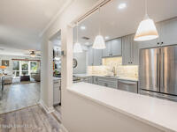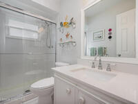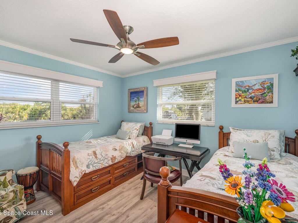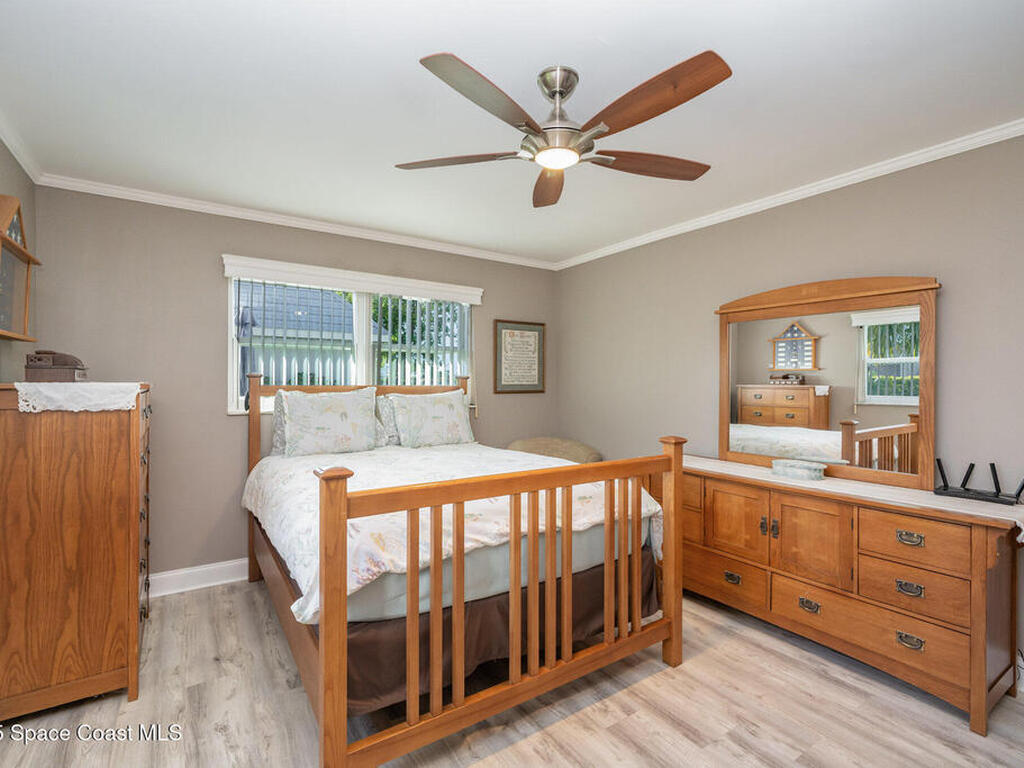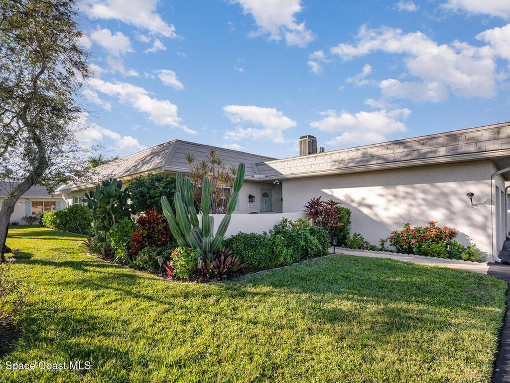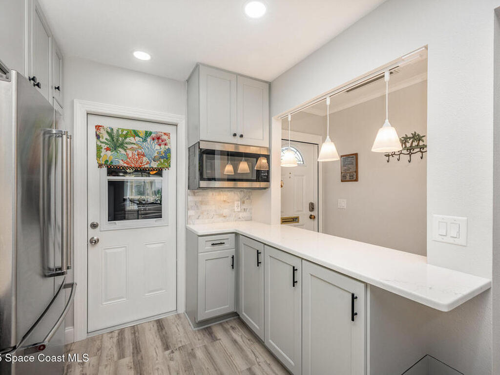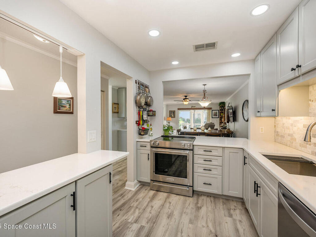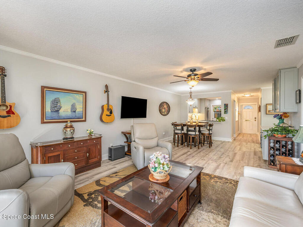 This beautifully remodeled 1-story end-unit waterfront townhome is just blocks from the Atlantic Ocean and includes your assigned boat slip. Flooded with natural light through new impact windows, the interior features new LVP flooring, tile in the guest bath, and a stunning kitchen with quartz countertops, stainless appliances, deep workstation sink with accessories, soft-close cabinetry, marble backsplash, and touch lighting. The dining area offers a wine and beverage bar perfect for entertaining. The owner's en suite includes a designer walk-in closet and double sinks. Additional upgrades include crown molding, faux wood blinds, and fans throughout. Enjoy the paved front courtyard or relax on the paver patio overlooking the Banana River canal or on your XL screened porch. A/C 2019, newer hot water heater, and upgraded electrical panel. Community amenities include pool, pickleball, and tennis. You won't believe it until you see it so make your appt today!