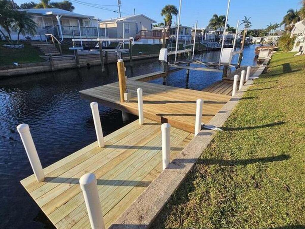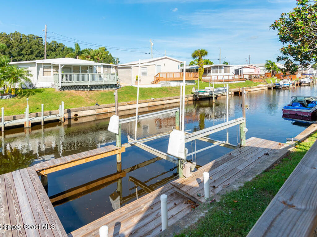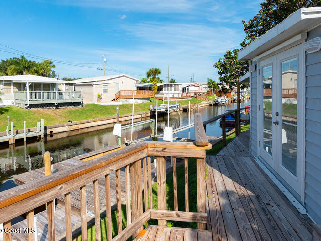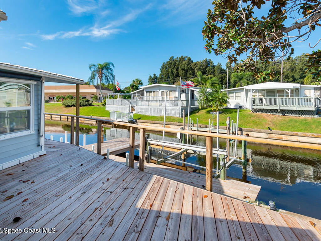 Welcome Home! NO LOT RENT. Everything is done. Move right in. SO MANY UPDATES AND DEFERRED MAINTENANCE ITEMS COMPLETED. ITS LIKE NEWStep into this beautifully remodeled 2-bedroom, 2-bath manufactured home--where nothing remains from its original build. This is truly a rare find in the resident-owned 55+ Palm Bay Estates community: you own the land, there's no lot rent, and you're right on a deep-water canal with your own private dock and electric boat lift leading out to the Indian RiverInside, you'll love the bright, open floor plan, tile floors throughout, newer windows, and 2x4 framed walls with drywall for a solid, site-built feel. Every inch has been thoughtfully upgraded for comfort, style, and easy waterfront living.Enjoy peaceful mornings or stunning sunsets on the wrap-around deck with French doors opening from the dining area looking at dolphins, manatees, and fish jumping . Close to several amazing restaurants and retail. Golf Cart friendly and beautifully maintained.