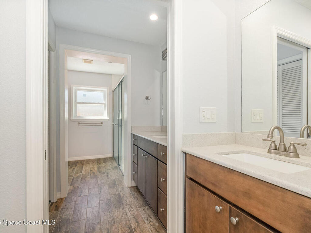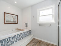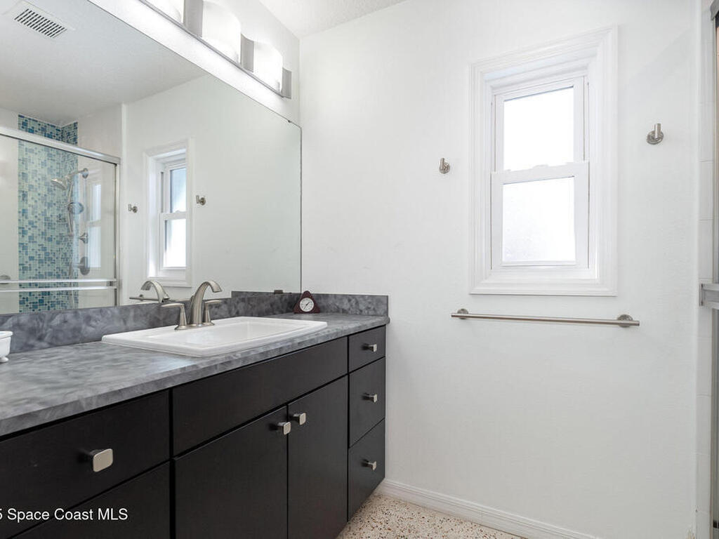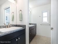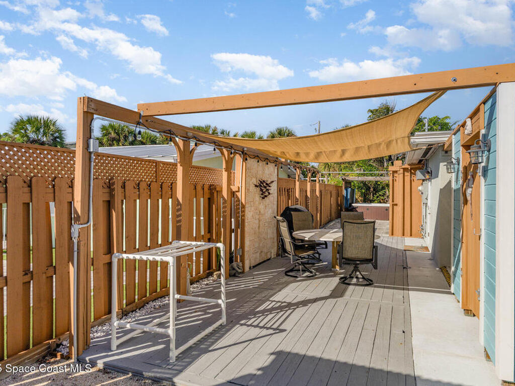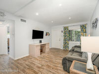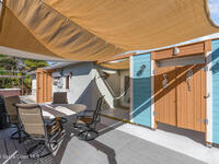 Tastefully remodeled Coastal Home across the street from the Ocean, offering exceptional versatility as a single-family residence or duplex with 2 electric meters & separate entrances. Taken to the studs in 2012/2013, this property features a 3BR/2BA main home with a full kitchen boasting all-wood Cabinetry & Silestone Countertops. Bathrooms include all-wood cabinetry & Formica Countertops. The 2 Bed/ 1 Bath Suite includes its own Kitchenette; ideal for guests or short-term rental income. Additional features include a garage/workshop with AC, an enclosed screened Lanai with 2 lounging areas, a fenced backyard with hot tub, an outdoor shower, & covered golf-cart parking. Natural gas powers the hot water heater, stove, & dryer. Major updates include NEW Roof (2024), NEW A/C for 2 Bed/1 Bath (2025), & NEW LG Washer (2023). Enjoy proximity to the Cocoa Beach Pier, Port Canaveral dining & cruising, and frequent rocket launch views from Kennedy Space Center.