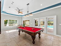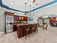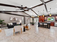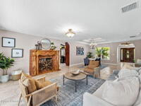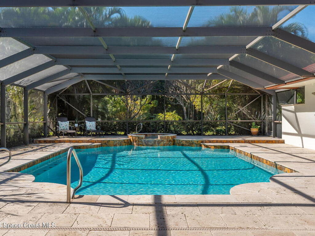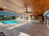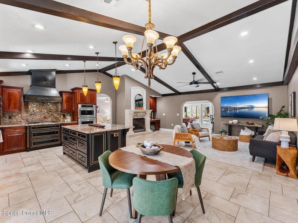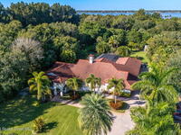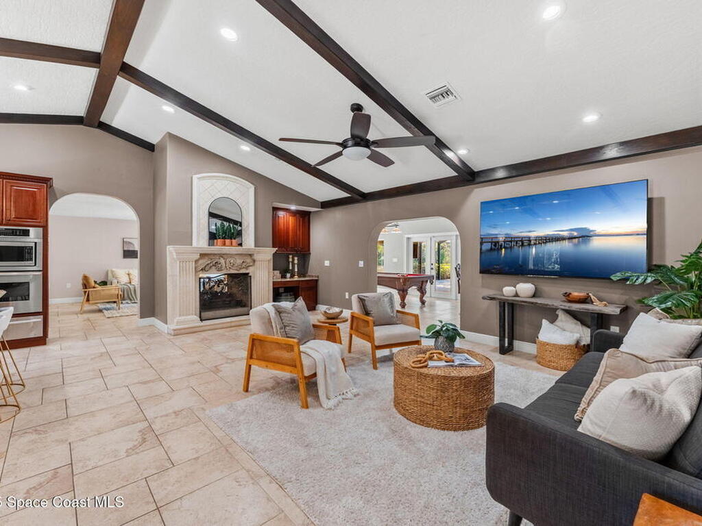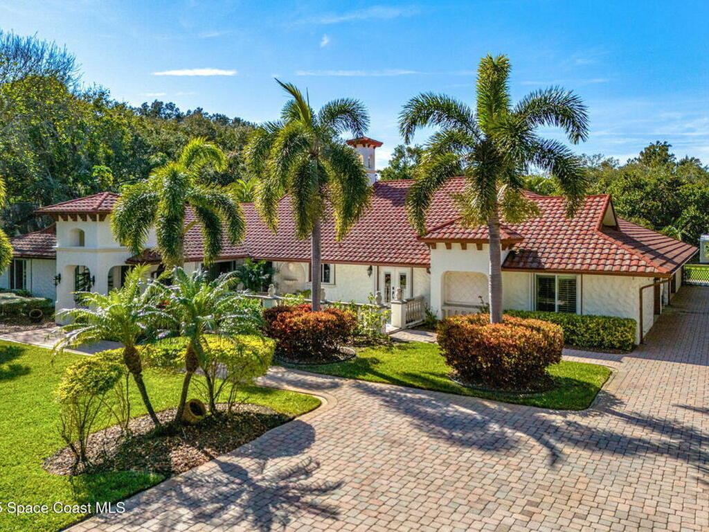 Discover your private oasis on Merritt Island. This gated waterfront estate spans over 2 acres between the Banana & Indian Rivers, offering a long royal palm-lined driveway, custom landscaped grounds & a backyard paradise w/ a screened heated pool, spa, outdoor kitchen & lounge areas. Inside this Mediterranean-style home, you'll find porcelain floors, tray ceilings, ornate stone fireplaces & a chef's kitchen w/ vaulted ceilings, cherry cabinetry, granite counters & a massive island w/ bar seating. The family room boasts a full bar & pool deck access, while the primary suite boasts a fireplace, private patio, custom shower & walk-in closet. Every guest room enjoys private bathroom access & separate quarters behind the 3+ car garage w/ 2 Tesla chargers provide ideal space for guests or multi-gen living. Beyond the lush fruit trees & whimsical pergola, the property offers dock potential across Tropical Trail & is mins from beaches & top-rated schools. This 4000+ sqft estate is a standout