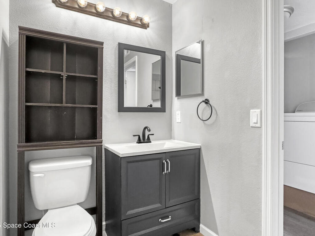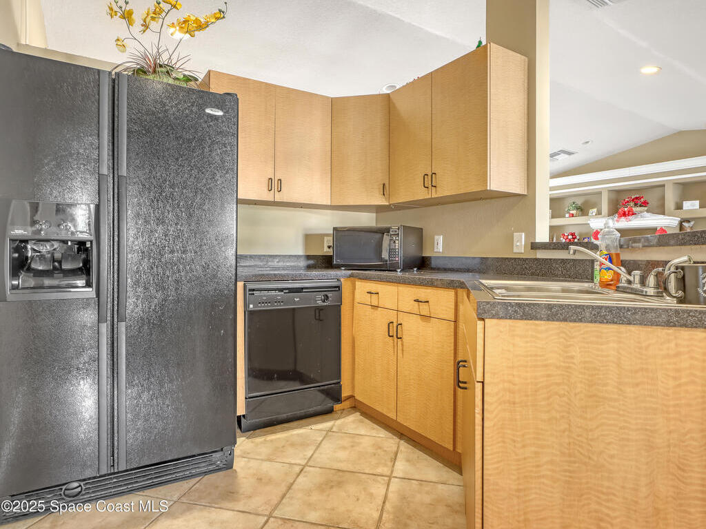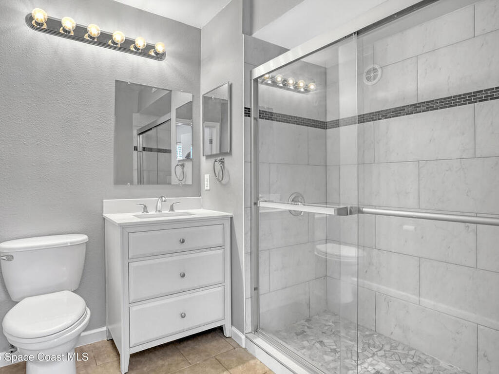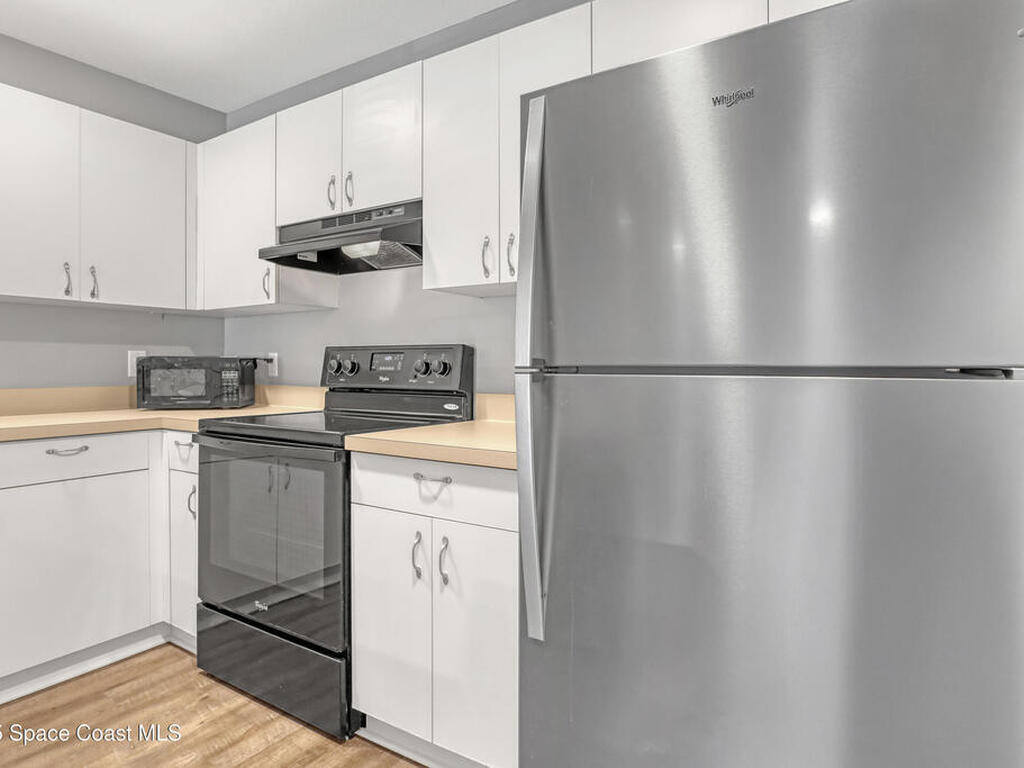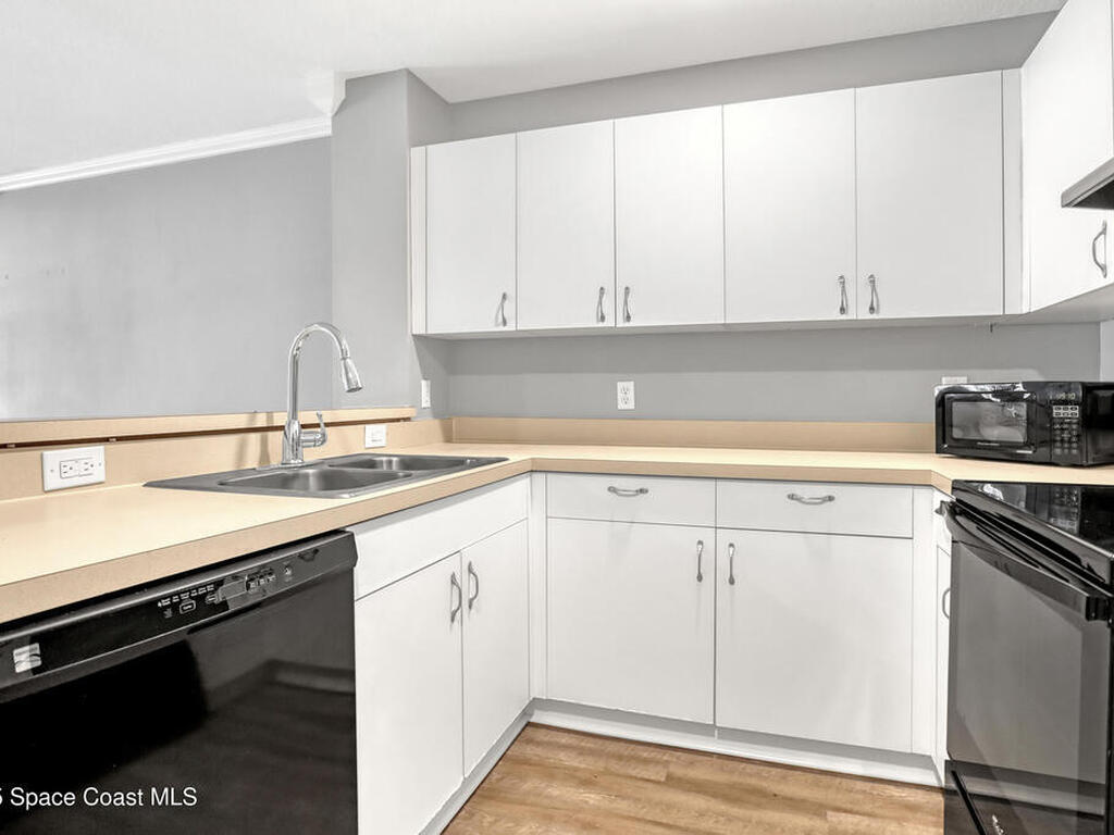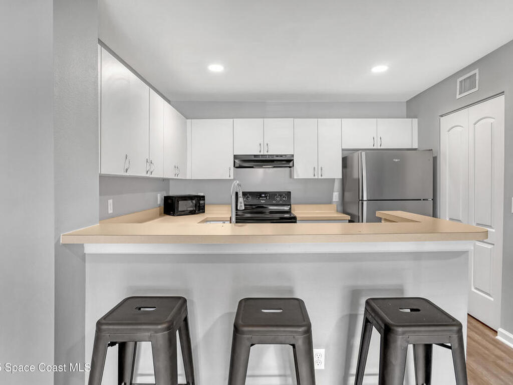 This ground floor corner unit sits in the gated community of The Greens at Viera and is ready for a new owner who wants comfort and a great location. You are greeted by a covered front porch which gives you a quiet place to sit and enjoy the day. The living area, kitchen, and common areas have luxury vinyl plank floors for easy maintenance. The 3 bedrooms have carpet and both bathrooms have tile and are fully updated with new tile, vanities, mirrors and fixtures. The primary bedroom has a walk in closet and a private bath with a shower. The kitchen has a new stainless steel fridge, white cabinets, a breakfast bar and plenty of storage space. The home includes a washer and dryer tucked away in the hall. The gated community has a pool, clubhouse, fitness center, and well kept grounds. The location puts you close to the best parts of the Space Coast with quick drives to Cocoa Beach, Cocoa Village, and Kennedy Space Center.