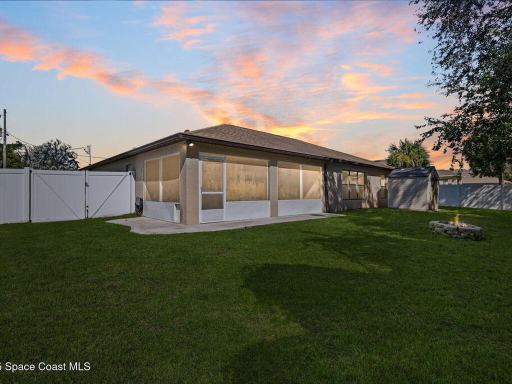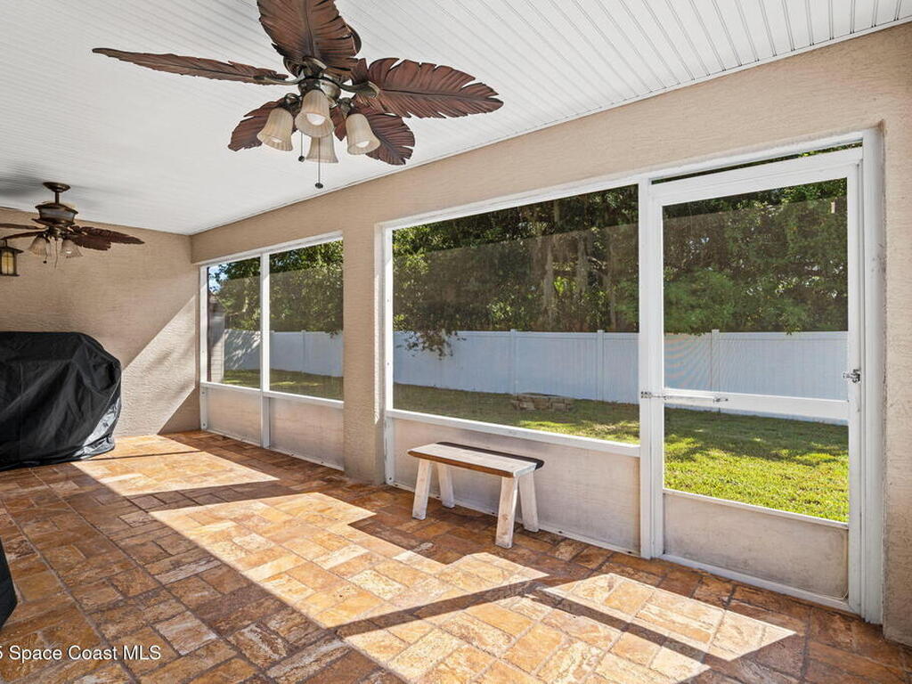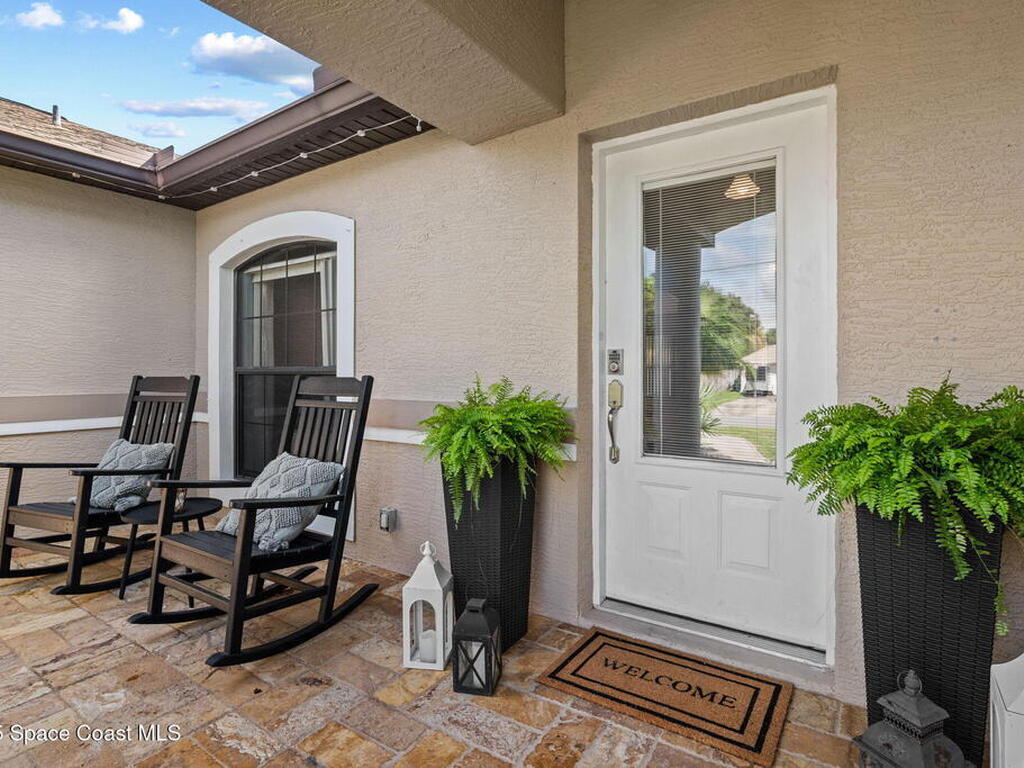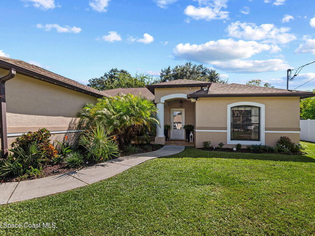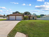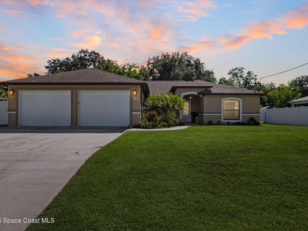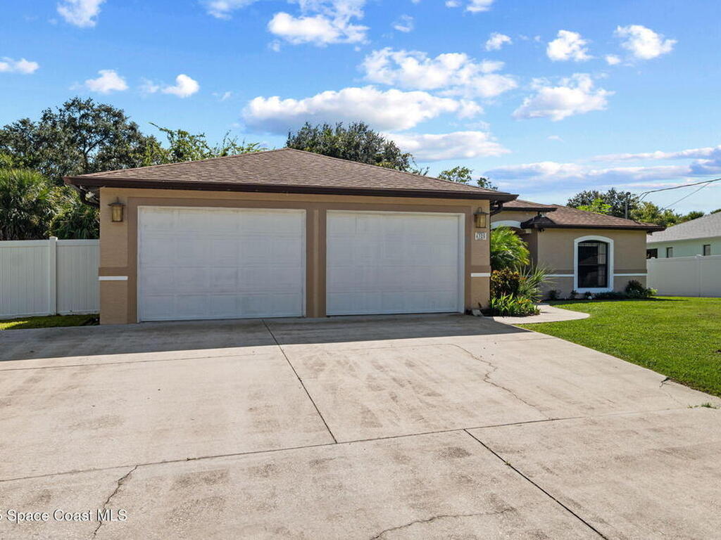 This custom concrete block home features 3 bedrooms, 2 bathrooms, and a 2-car garage. Enjoy Florida outdoor living on the front porch or screened back porch. The open-concept kitchen offers granite countertops, bar seating, and a walk-in pantry with barn door, along with newer stainless steel appliances. The primary suite includes a jetted Jacuzzi tub and a floor-to-ceiling tiled walk-in shower, while the main living areas feature luxury vinyl plank flooring and Avoria Fiorito marble tile in the kitchen, dining room, and primary bath. Recent updates include a 2020 roof, 2025 water heater, sprinkler system, new vinyl fencing, a backyard shed, and programmable exterior lighting. Conveniently located near I-95 and less than tow miles from the local schools, this home offers solid construction, practical upgrades, and flexible living space.