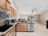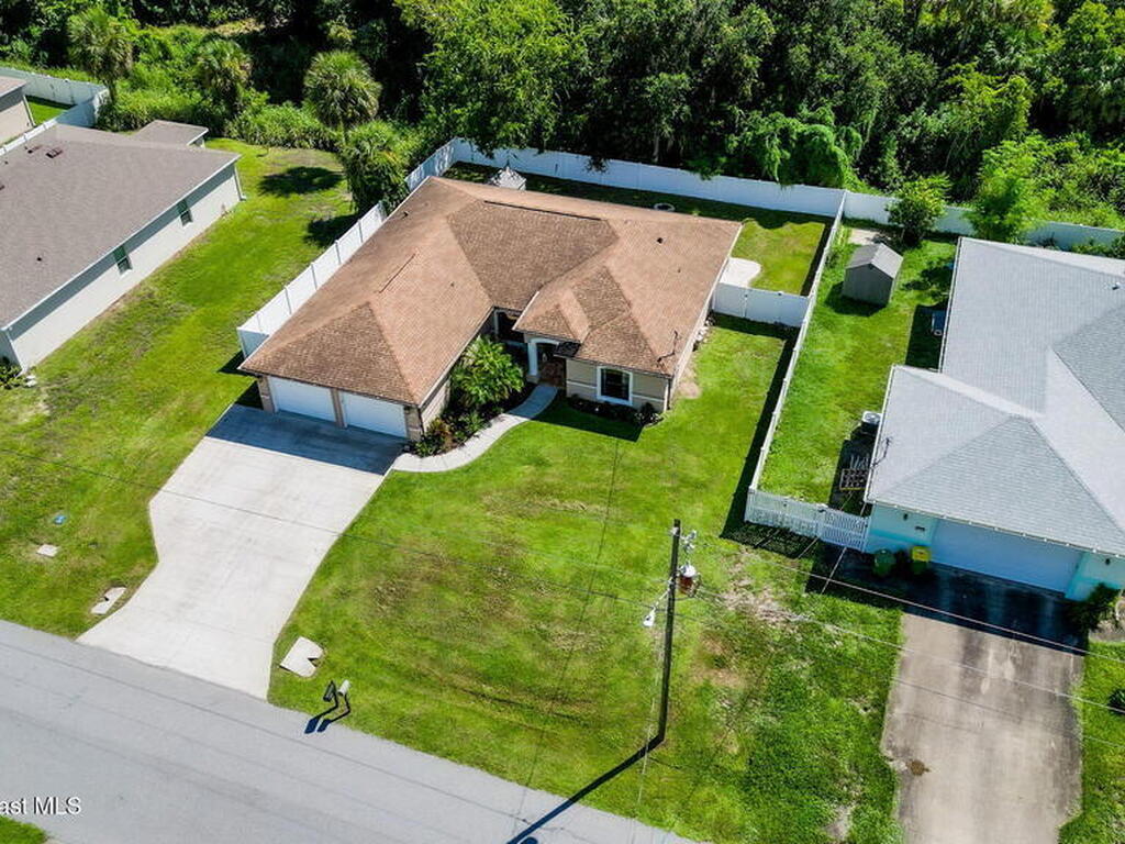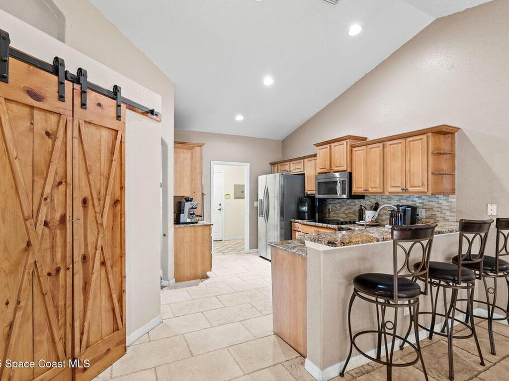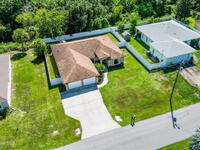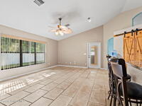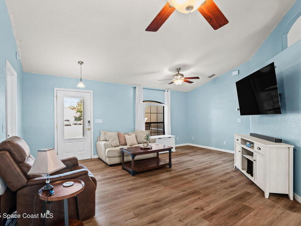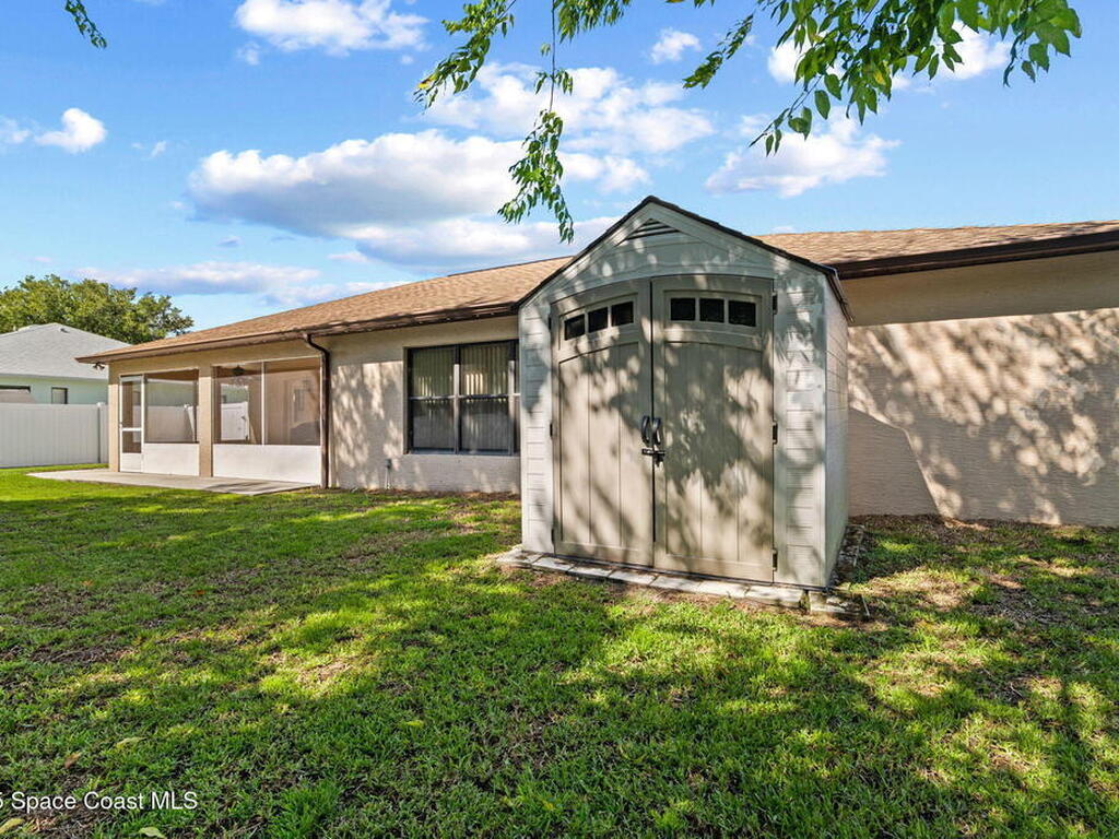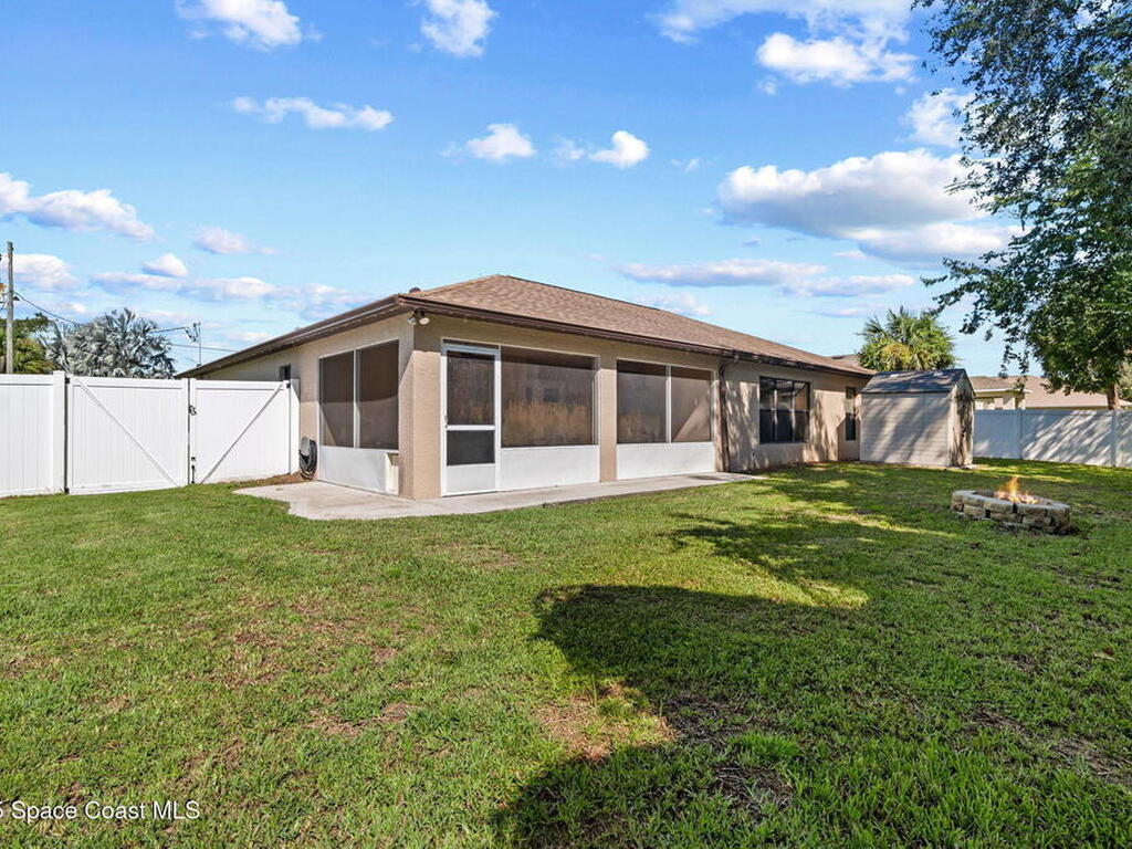 This custom concrete block home features 3 bedrooms, 2 bathrooms, and a 2-car garage. Enjoy Florida outdoor living on the front porch or screened back porch. The open-concept kitchen offers granite countertops, bar seating, and a walk-in pantry with barn door, along with newer stainless steel appliances. The primary suite includes a jetted Jacuzzi tub and a floor-to-ceiling tiled walk-in shower, while the main living areas feature luxury vinyl plank flooring and Avoria Fiorito marble tile in the kitchen, dining room, and primary bath. Recent updates include a 2020 roof, 2025 water heater, sprinkler system, new vinyl fencing, a backyard shed, and programmable exterior lighting. Conveniently located near I-95 and less than tow miles from the local schools, this home offers solid construction, practical upgrades, and flexible living space.