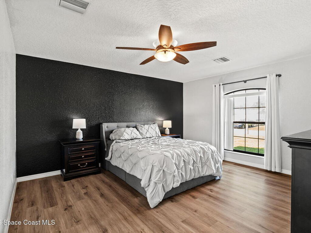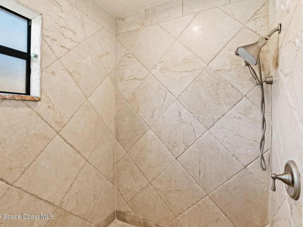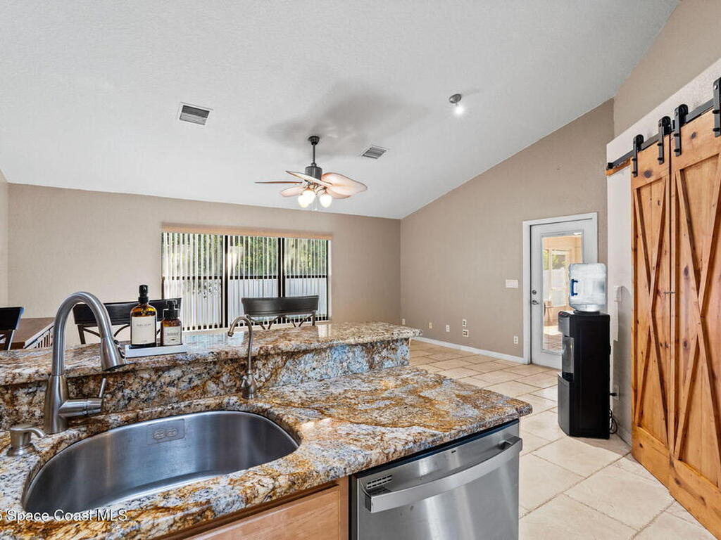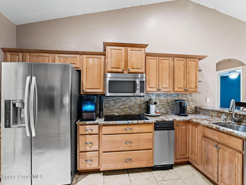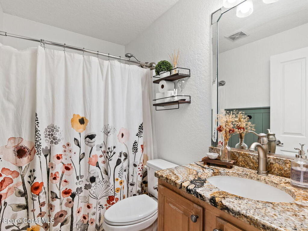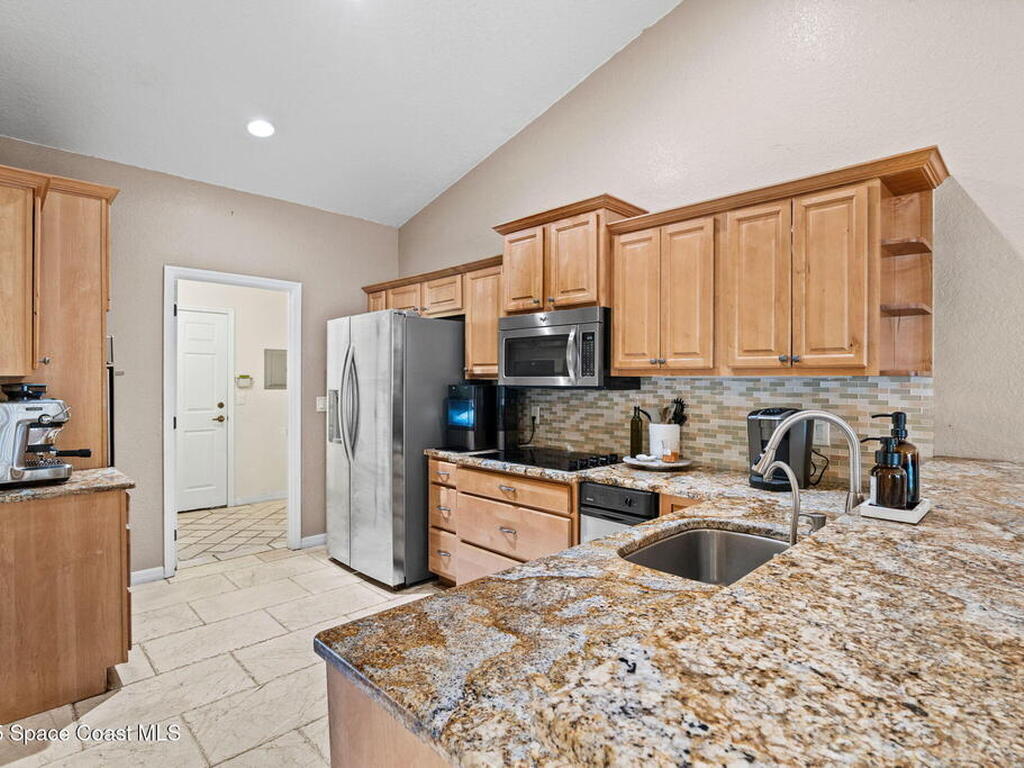 This custom concrete block home features 3 bedrooms, 2 bathrooms, and a 2-car garage. Enjoy Florida outdoor living on the front porch or screened back porch. The open-concept kitchen offers granite countertops, bar seating, and a walk-in pantry with barn door, along with newer stainless steel appliances. The primary suite includes a jetted Jacuzzi tub and a floor-to-ceiling tiled walk-in shower, while the main living areas feature luxury vinyl plank flooring and Avoria Fiorito marble tile in the kitchen, dining room, and primary bath. Recent updates include a 2020 roof, 2025 water heater, sprinkler system, new vinyl fencing, a backyard shed, and programmable exterior lighting. Conveniently located near I-95 and less than tow miles from the local schools, this home offers solid construction, practical upgrades, and flexible living space.