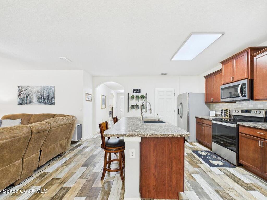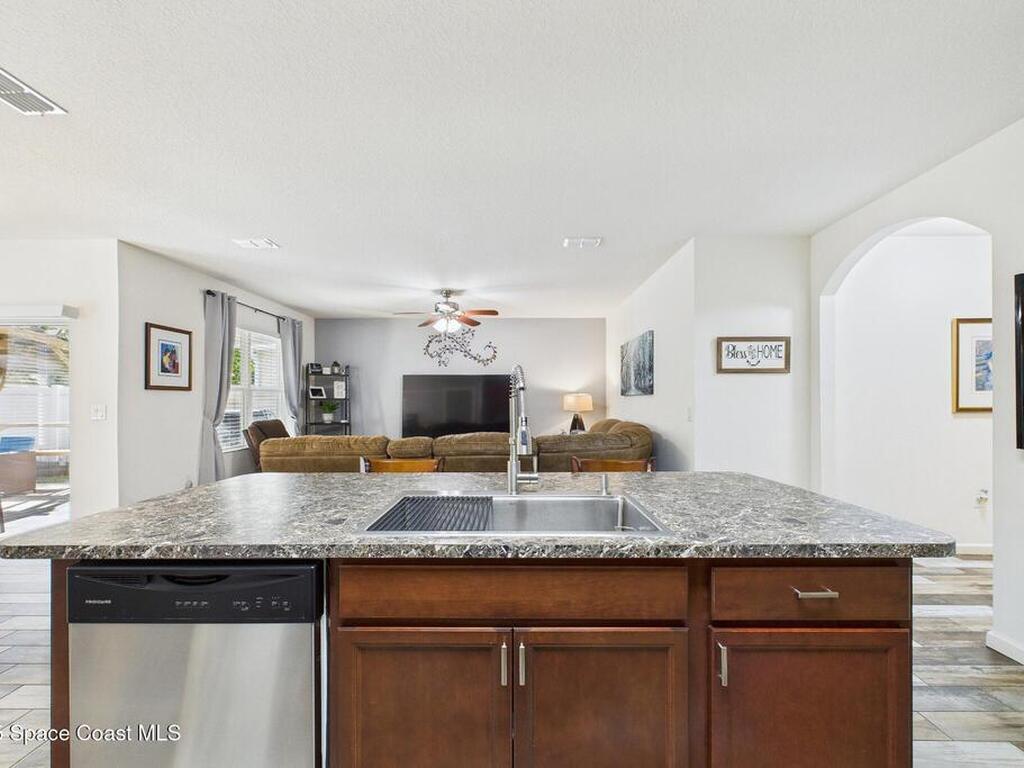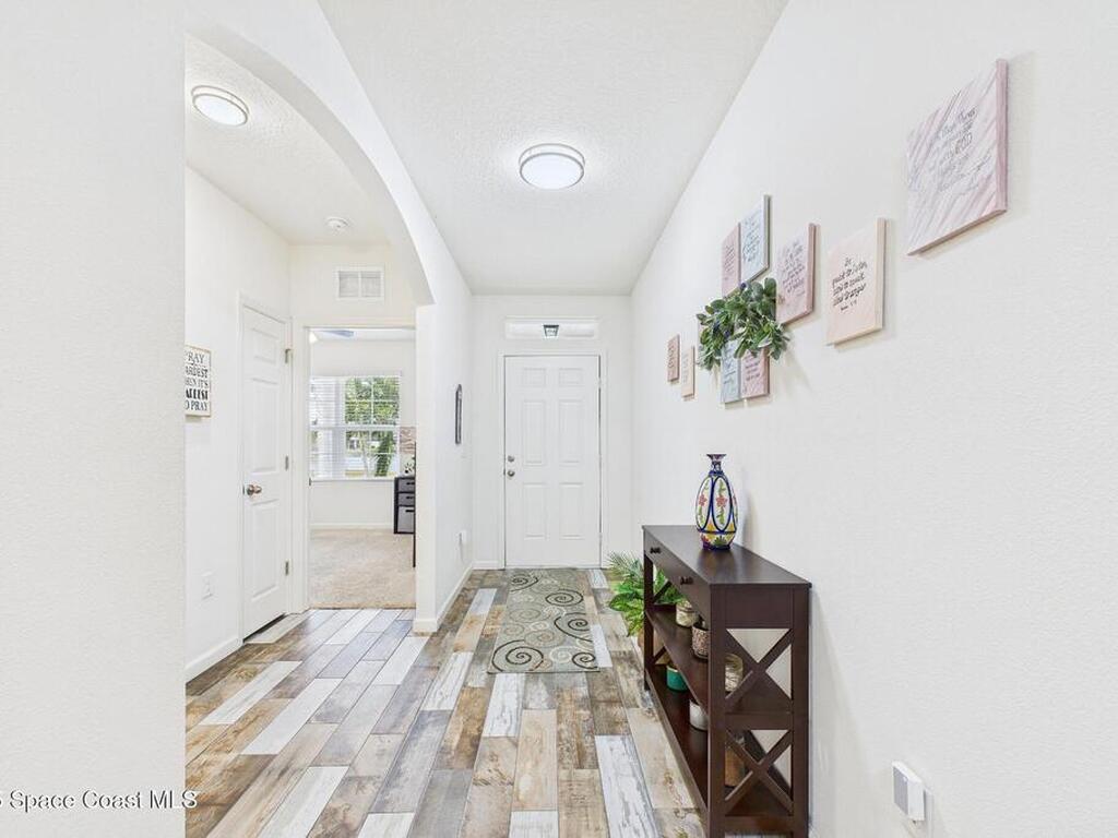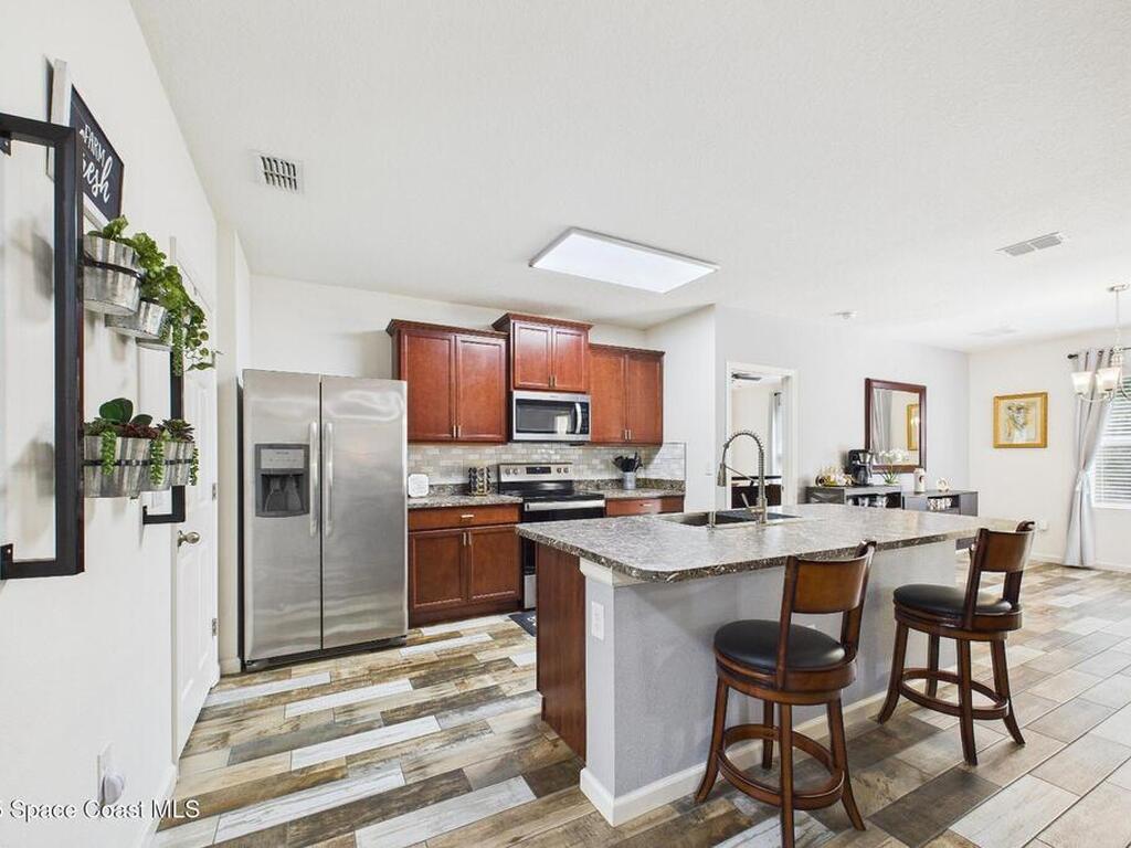 Discover this beautifully maintained three bedroom two bathroom home in the exclusive gated community The Falls of Palm Bay. The open layout features an upgraded kitchen with a new stove, over stove microwave, and deep Delta sink. Ceramic tile flooring extends through the main living areas while the bedrooms offer comfort and privacy. The primary suite includes two walk in closets. Ceiling fans are in all bedrooms and the lighting in the kitchen and hallway has been refreshed. Additional storage is available with attic access in the garage. Step outside to a privatized back yard with a serene paved patio and pergola, and the patio set conveys for added convenience. The exterior was freshly repainted in November of 2025, enhancing the polished appeal of this well cared for residence. The community offers a peaceful setting with convenient access to Malabar Road for easy commutes, along with nearby schools, public transit, shopping, parks, and dining.