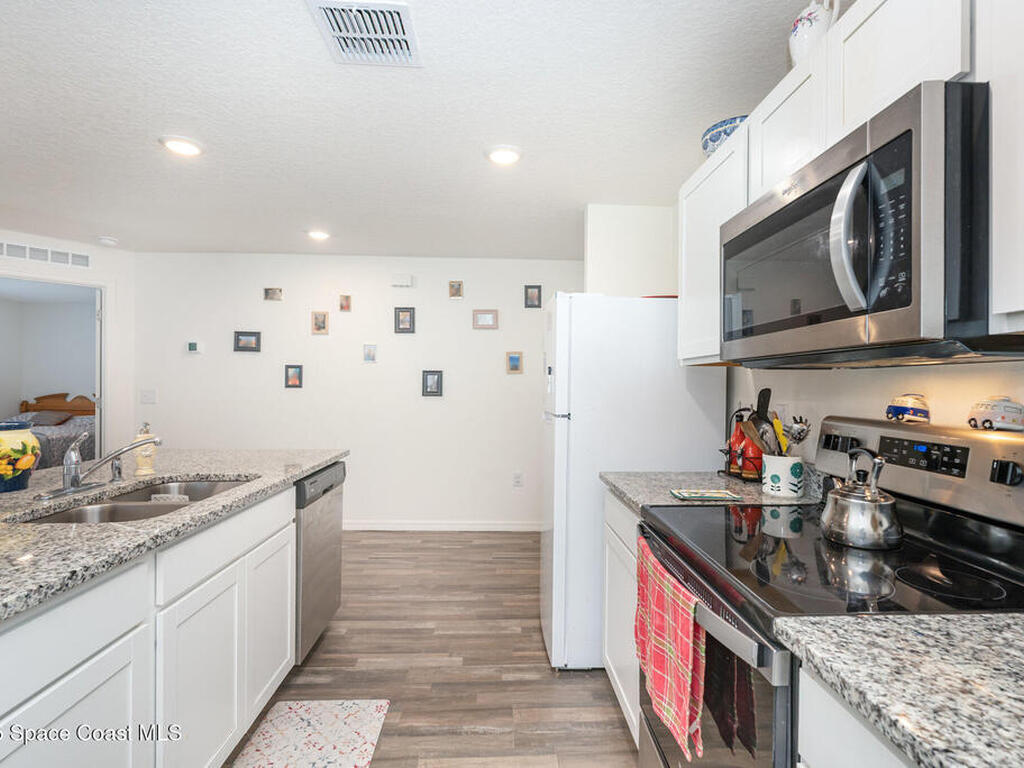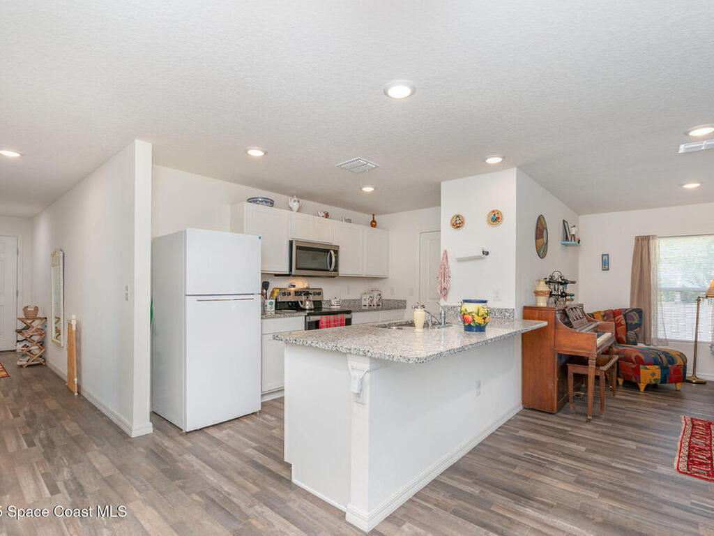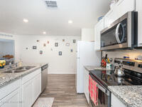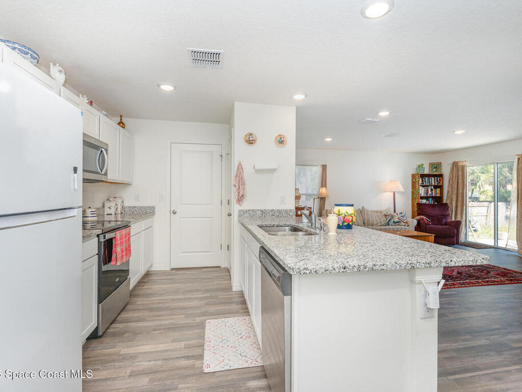 Nestled in the tree lined streets of Palm Bay, this 3 bed / 2 bath features an open floor plan, fruit trees and paid off solar panels! The kitchen boasts granite countertops, white shaker cabinets, stainless steel appliances, and bar seating. The primary ensuite offers a double vanity with granite countertops and walk-in closet. Additional bedrooms offer maximum storage with walk-in closets. Vinyl plank in main living areas. Indoor laundry room. Gardener's paradise with citrus, grape, cherry, pineapple, fig, bananas, mango, avocado, lettuce beds, elderberry, basil and so much more! Minutes away from major shopping centers, restaurants, parks, and quick access to I95. Also listed for rent MLS #1062585.