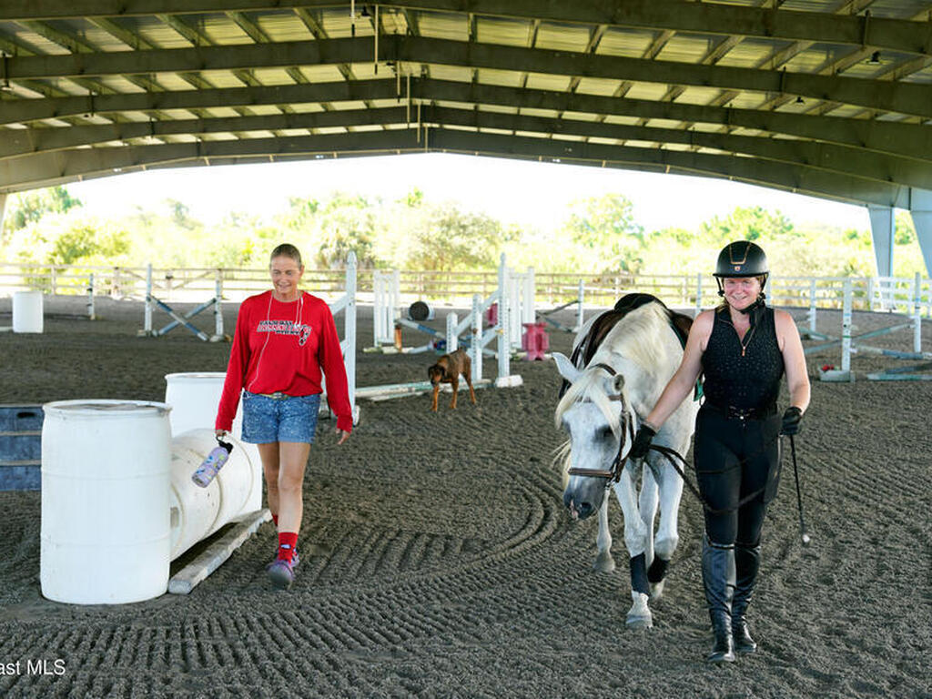 Experience an unmatched equestrian estate fully fenced with gated entry and beautiful views of the Indian River. The 3 bedroom 3 bath main home offers 2 flex rooms, full solar, & 3092sq ft under air. Five large pastures + 8 smaller paddocks provide exceptional turnout with roomy shelters, cross fenced areas, mature fruit trees, and wide open training space. The main barn features 16 stalls, 2 tack rooms with individual lockers, organized storage, 2 wash racks, and private 3 bedroom 2 bath 1400sq ft living quarters ideal for trainer or staff housing. Additional barns include 16 stalls in the north lower barn, 10 stalls in the south lower barn with a shop and storage room, plus 13 combined stalls in the north & south pasture barns. A covered dressage arena and a covered jump arena offer lights, sprinklers, arena mirrors, and viewing pavilions. A fully enclosed hay barn, feed barn, open air pavilion, ample trailer parking, and income producing versatility complete this premier facility.