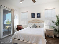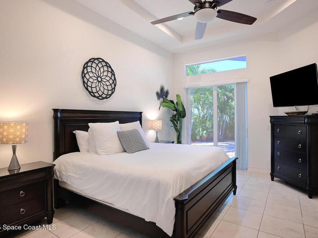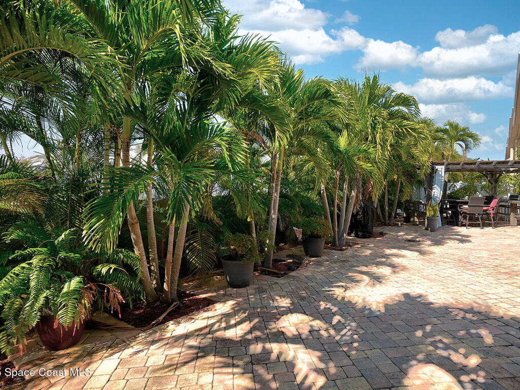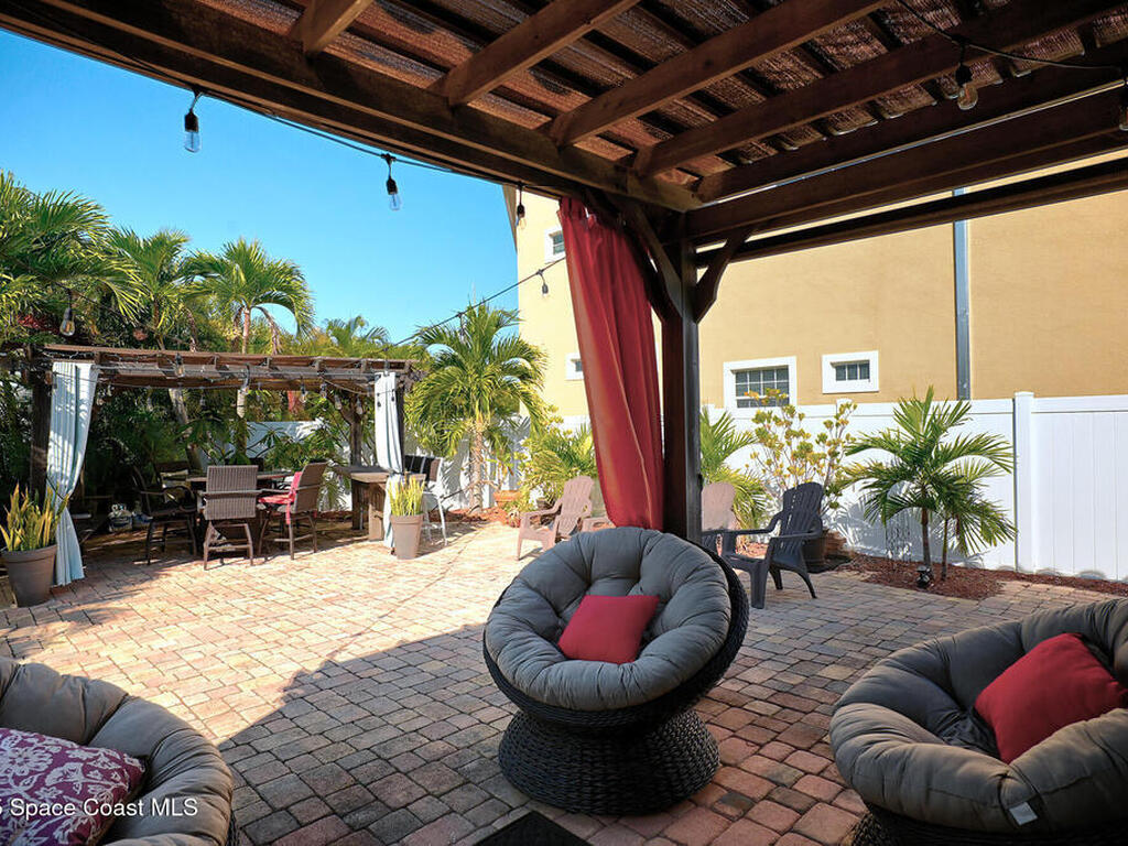 INVESTOR ALERT! AIR B N B this stunning, furnished beachside townhome that stands apart, marrying luxury design with everyday practicality. Highlights include a barrel tile roof, paver driveway, impact-rated windows/sliders. Outdoor entertaining area shines with pergolas, pavers, palm landscaping, and tasteful lighting and large pavered patio. Inside, the space exudes an interior designer's touch w/ lofty 12-foot ceilings, 8-foot doors and sliders, and a refined wrought-iron staircase. Transom windows bathe rooms in natural light, underscoring rich wood and tile flooring. A granite wet bar pairs with a chef's kitchen featuring soft-close cabinetry, granite counters, and S/S appliances, a breakfast bar adds casual seating. First floor owner's retreat opens to pergola patio and features a tray ceiling, plus a primary, spa like bath w/garden tub & separate shower. HOA covers roof replacement + exterior building maintenance, lawn and pool care. Beach access just a short drive away.