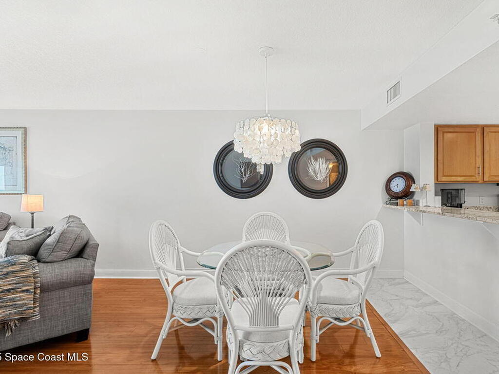 Step into sweeping Atlantic Ocean views the moment you enter this direct oceanfront condo on Florida's Space Coast. This three-bed, two-bath residence offers secured elevator access, a private one-car garage, and additional guest parking. An oversized balcony with storm shutters and impact-rated turtle glass sliders frames the shoreline. The remodeled kitchen showcases elegant granite, a breakfast bar, wine bar, and stainless appliances. French doors open to a flexible third bedroom or office. The primary suite includes a large walk-in shower, soaking tub, and double sinks, while the guest room features an en suite bath with dual access. Wood and marble-look tile floors run throughout. Amenities include private beach access, a heated pool, fitness center, and clubhouse. Two pets up to 35 lbs and 6-month rentals allowed. Recent building updates and all past assessments paid in full. Walkable to dining and all that Indian Harbour offers--true beachside living.