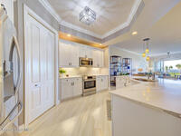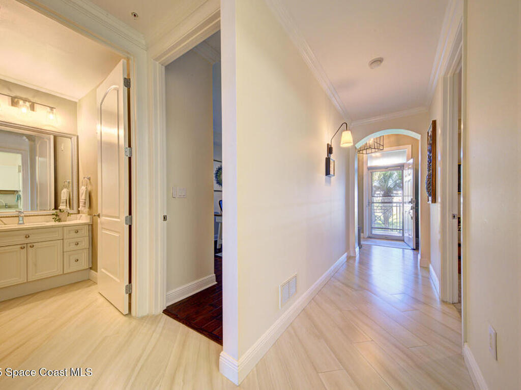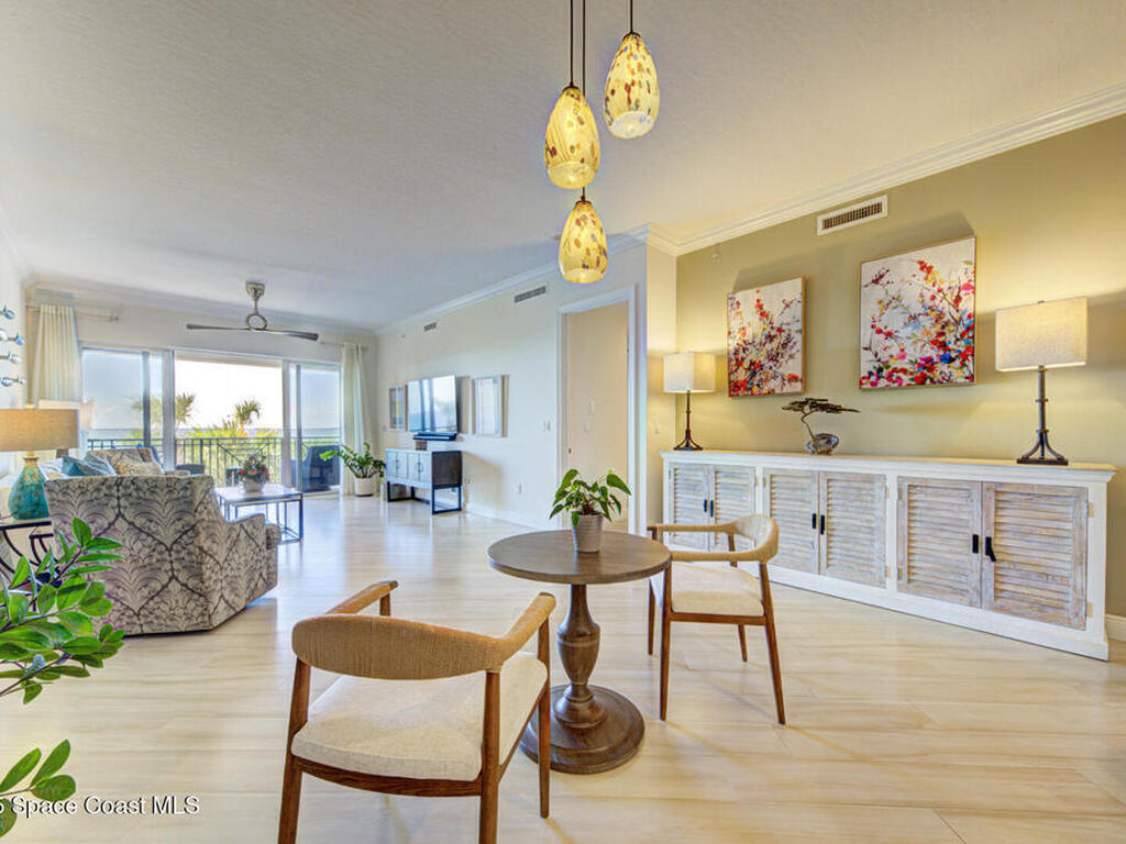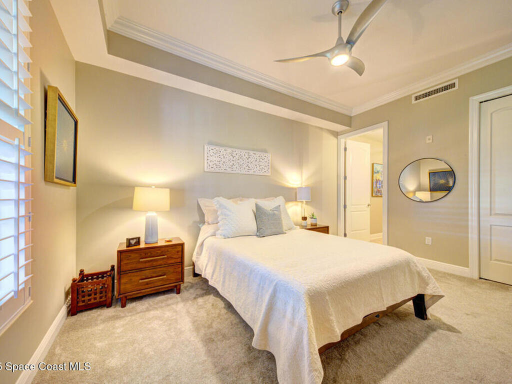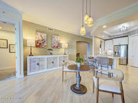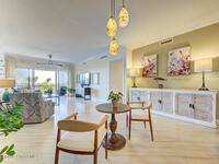 Nature enthusiasts will love this serene and beautifully appointed 3-bedroom, 3-bath condo, offered fully furnished. Enjoy spectacular Banana River sunsets from your private lanai w/ electric hurricane shutters and screen. Built in 2007 w/ refined craftsmanship, this residence features 10' ceilings, crown molding, plantation shutters, new ceramic tile flooring (2022), designer lighting, A/C (2025), and porcelain countertops in the kitchen, pantry, and baths. The gourmet kitchen includes all new appliances Bosch induction range, Bosch dishwasher (2025) plus a custom walk-in pantry w/ wine refrigerator. Resort-style amenities include a heated pool, updated clubhouse, fitness center, and hot tub. Additional perks: a private enclosed garage and oversized powered storage unit ideal for bikes, kayaks, and gear. The community has strong reserves and passed all structural inspections. Ideally located just steps to the ocean, dining, a bike ride to downtown Cocoa Beach, Country Club, and more.