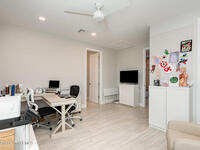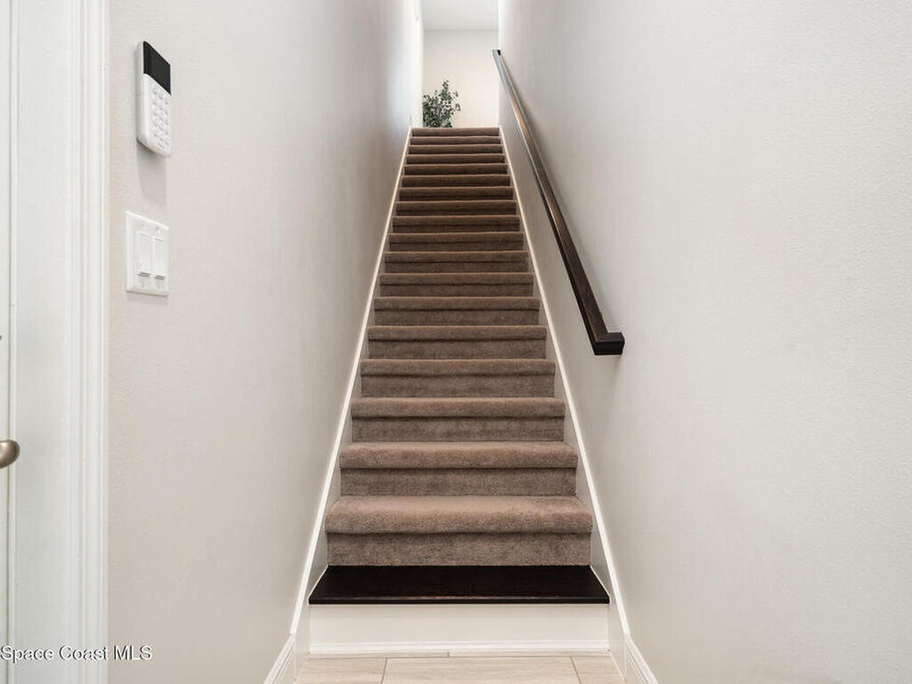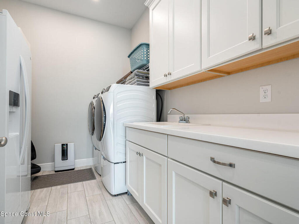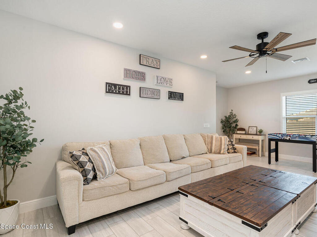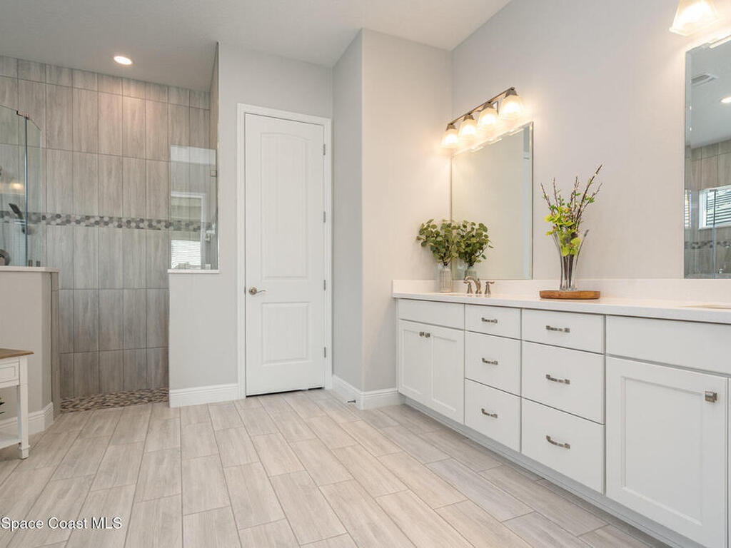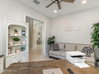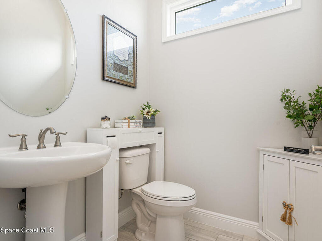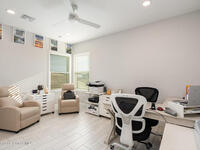 Nearly new 2024-built home in Viera's exclusive Laurasia! This spacious 4-bedroom, 4.5-bath residence offers 3, 690 sq ft of bright, open-concept living with soaring ceilings and effortless flow for everyday comfort or entertaining. The Gourmet Kitchen package dazzles with Level 4 cabinets, upgraded countertops, and a microwave drawer. Premium Level 3 flooring runs throughout, with matching tile upstairs. Unwind by a 6-ft electric fireplace set on a custom stone wall. Impact windows, a cell-phone booster, and abundant LED high-hat lighting on both floors elevate daily living. The primary suite adds a relaxing soaking tub and premium shower. A private study, laundry cabinets, and extra garage direct-line outlets add function. Outside, enjoy a premium lot with extra lanai outlets plus water and gas stubs, pool-service prep, and space to build your dream backyard oasis. Minutes to schools, parks, The Avenue Viera, beaches, I-95, and Space Coast employers--move-in ready. A MUST SEE!