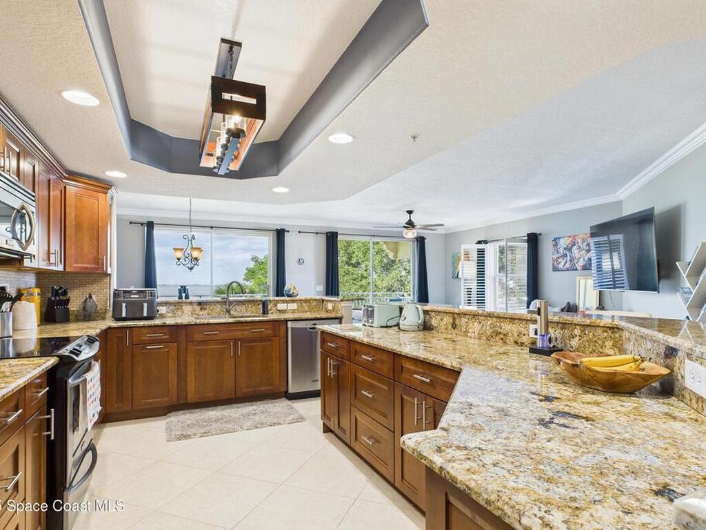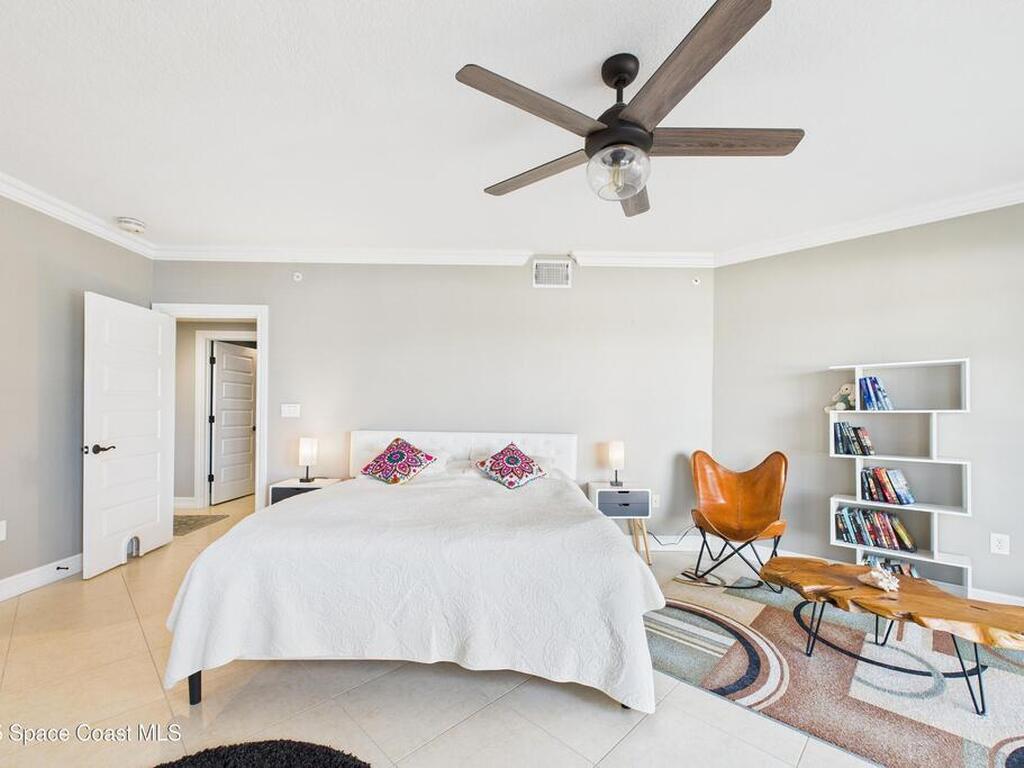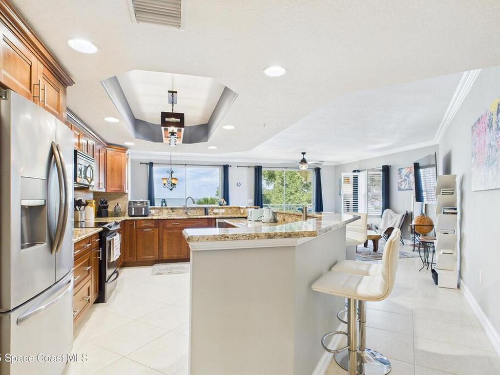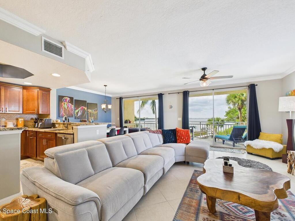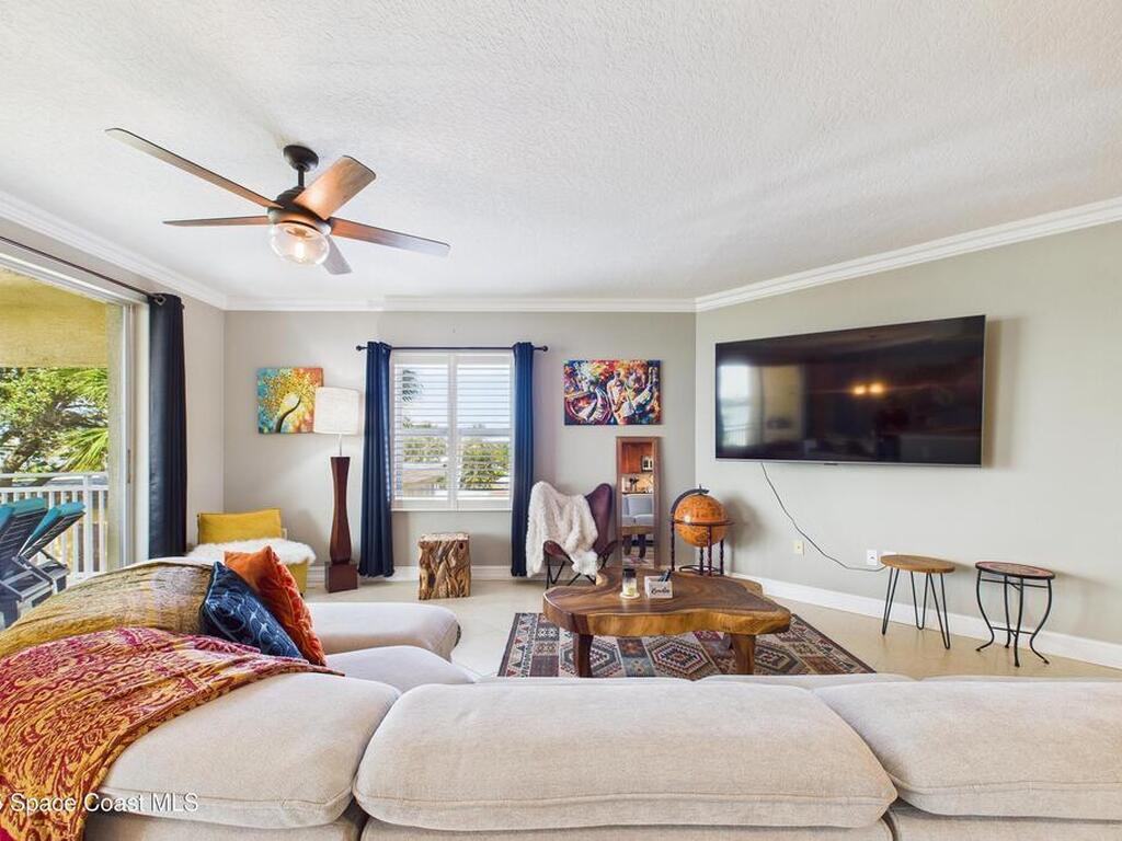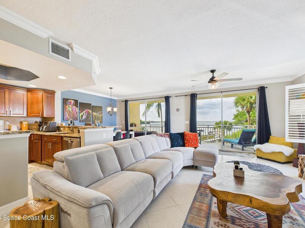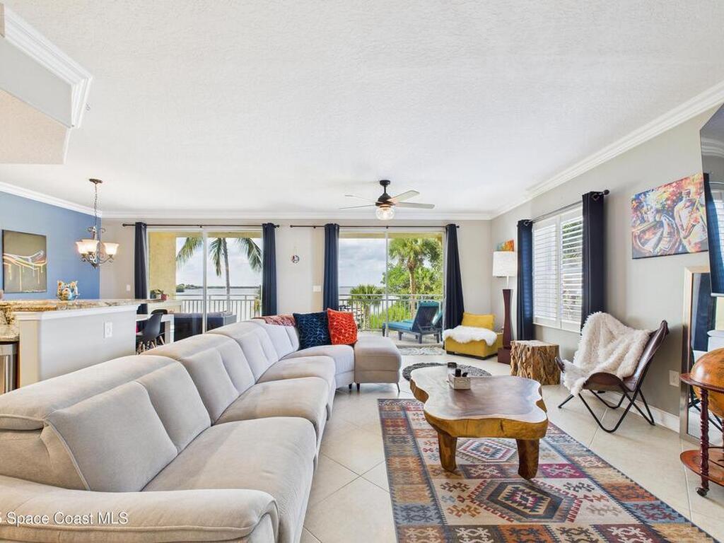 Spectacular DIRECT BANANA RIVERFRONT CORNER UNIT offering breathtaking views and a peaceful waterfront lifestyle in the boutique 11-unit community of Garden Bay. Rare opportunity to own an end unit in this highly desirable Cocoa Beach complex--just a short stroll to the ocean, restaurants, and shopping. Nearly 2, 600 sq ft of luxury living with 4 bedrooms, 3.5 baths, and a private 2-car garage. High 8.5' ceilings, crown molding, travertine and wood flooring (no carpet), and impact windows with plantation shutters throughout. The gourmet kitchen boasts granite countertops, custom cabinetry, tile backsplash, and newer stainless appliances overlooking the water. Spacious owner's suite features double walk-in closets, private balcony, and spa-inspired bath with jetted tub and marble shower. Each guest bedroom has its own ensuite bath for privacy and comfort.