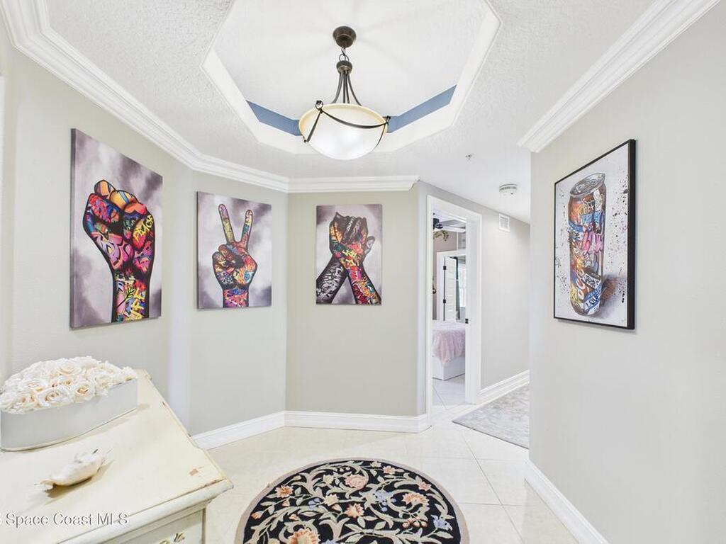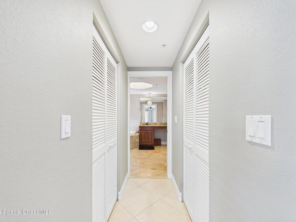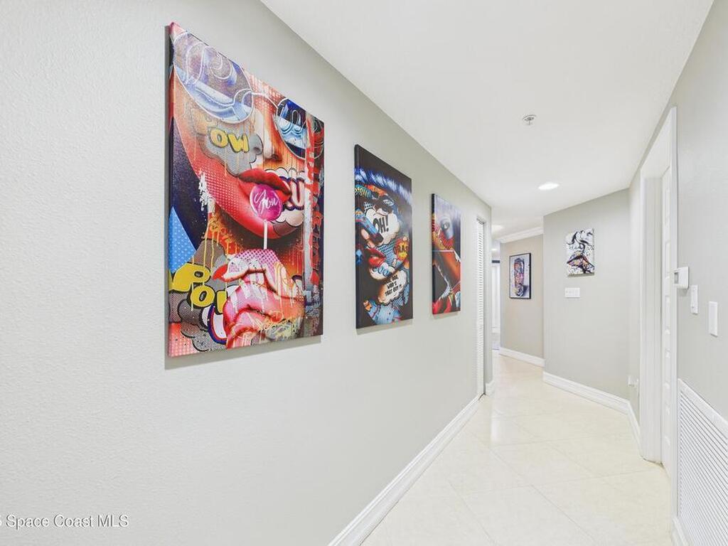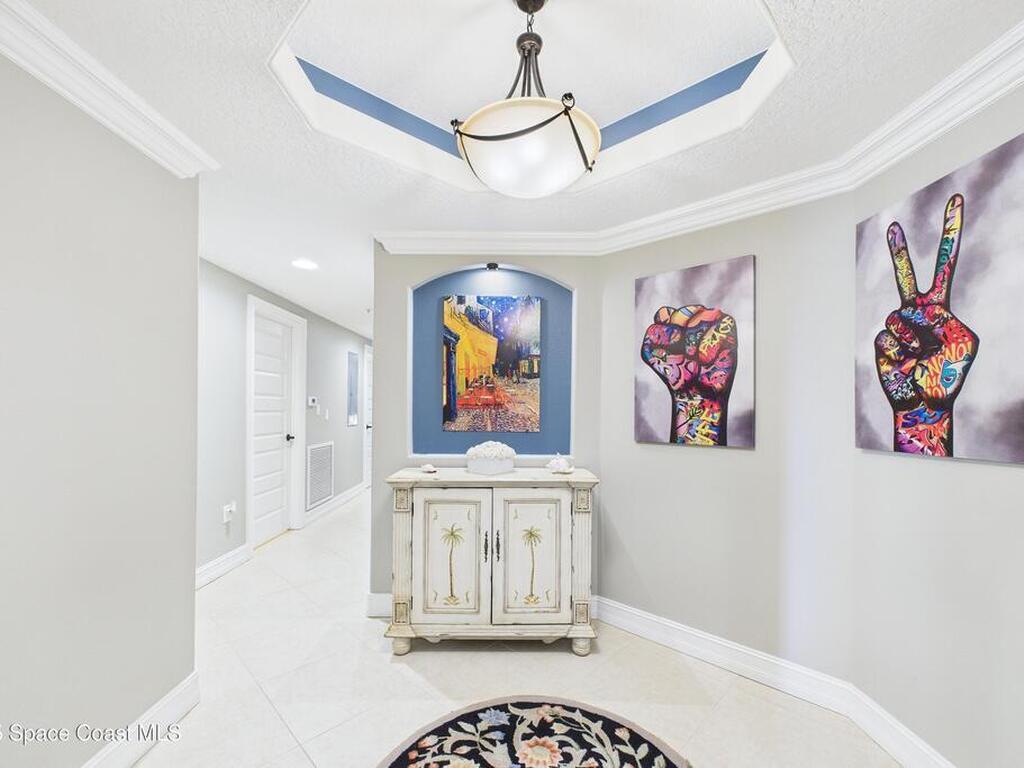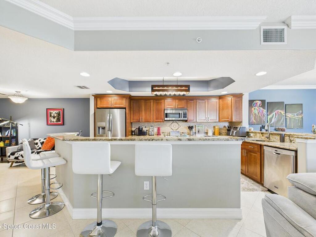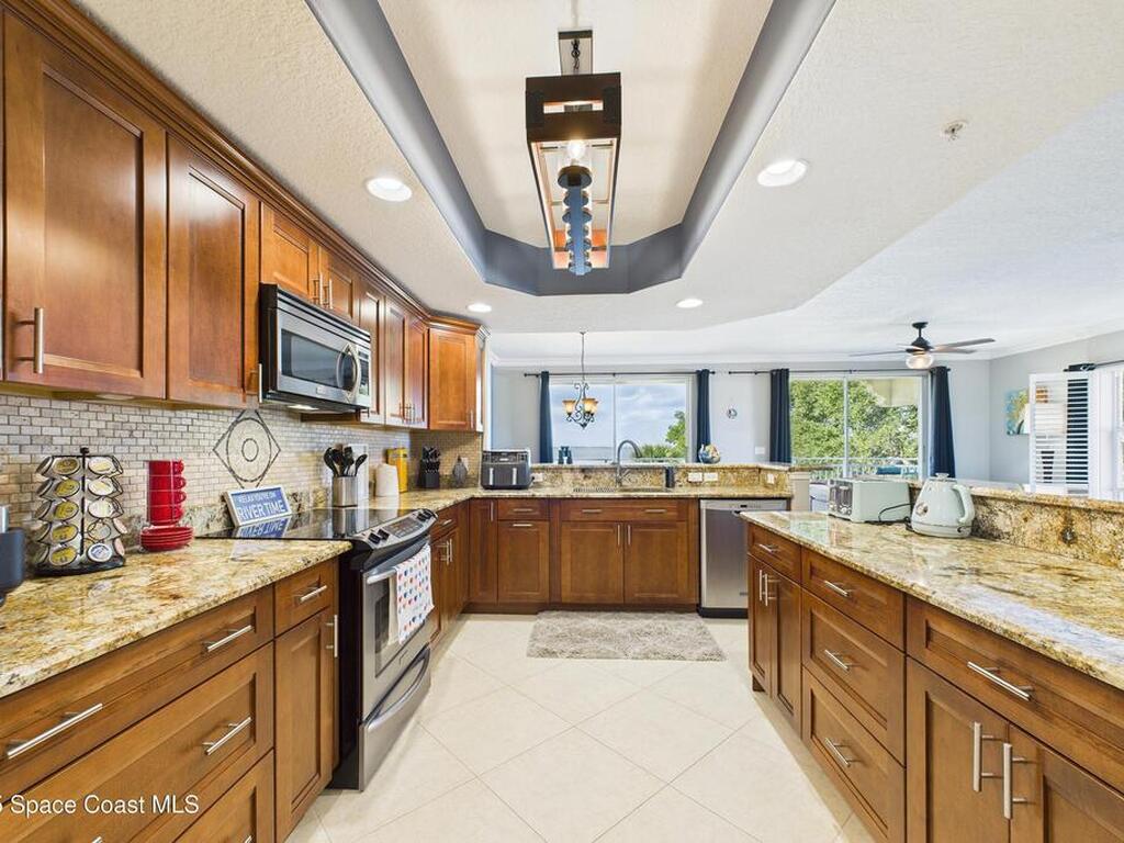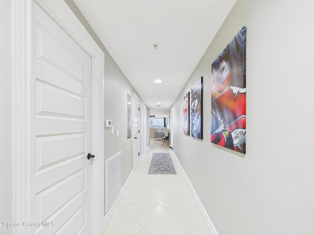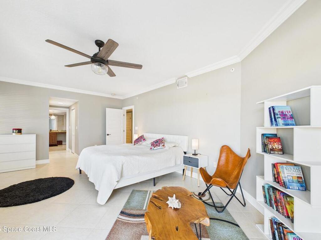 Spectacular DIRECT BANANA RIVERFRONT CORNER UNIT offering breathtaking views and a peaceful waterfront lifestyle in the boutique 11-unit community of Garden Bay. Rare opportunity to own an end unit in this highly desirable Cocoa Beach complex--just a short stroll to the ocean, restaurants, and shopping. Nearly 2, 600 sq ft of luxury living with 4 bedrooms, 3.5 baths, and a private 2-car garage. High 8.5' ceilings, crown molding, travertine and wood flooring (no carpet), and impact windows with plantation shutters throughout. The gourmet kitchen boasts granite countertops, custom cabinetry, tile backsplash, and newer stainless appliances overlooking the water. Spacious owner's suite features double walk-in closets, private balcony, and spa-inspired bath with jetted tub and marble shower. Each guest bedroom has its own ensuite bath for privacy and comfort.