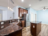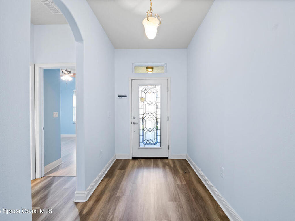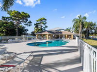 Charming curb appeal sets the tone in this gated community, where tropical landscaping, stone filled edged plantings beds & pavers lead from the driveway to the charming front porch & leaded-glass front door. Inside, gorgeous new vinyl plank flooring - no carpet - flows through a bright modern open floorplan designed for effortless living & entertaining. The kitchen shines with solid wood 42'' high cabinets, granite counters & newer stainless appliances. The spacious owner's suite offers a peaceful retreat with a huge walk-in closet & stunning ensuite featuring a zero-entry shower & granite-topped double sink vanity. Two generous guest bedrooms & a guest bath provide comfort for visitors. Step out of the great room to enjoy Florida living on the large under-truss porch & pavered patio overlooking the expansive, fully fenced backyard. Updates include a 2020 HVAC, 2023 tankless water heater, electric roll-down shutters at the front window & back porch, & accordions on remaining windows.