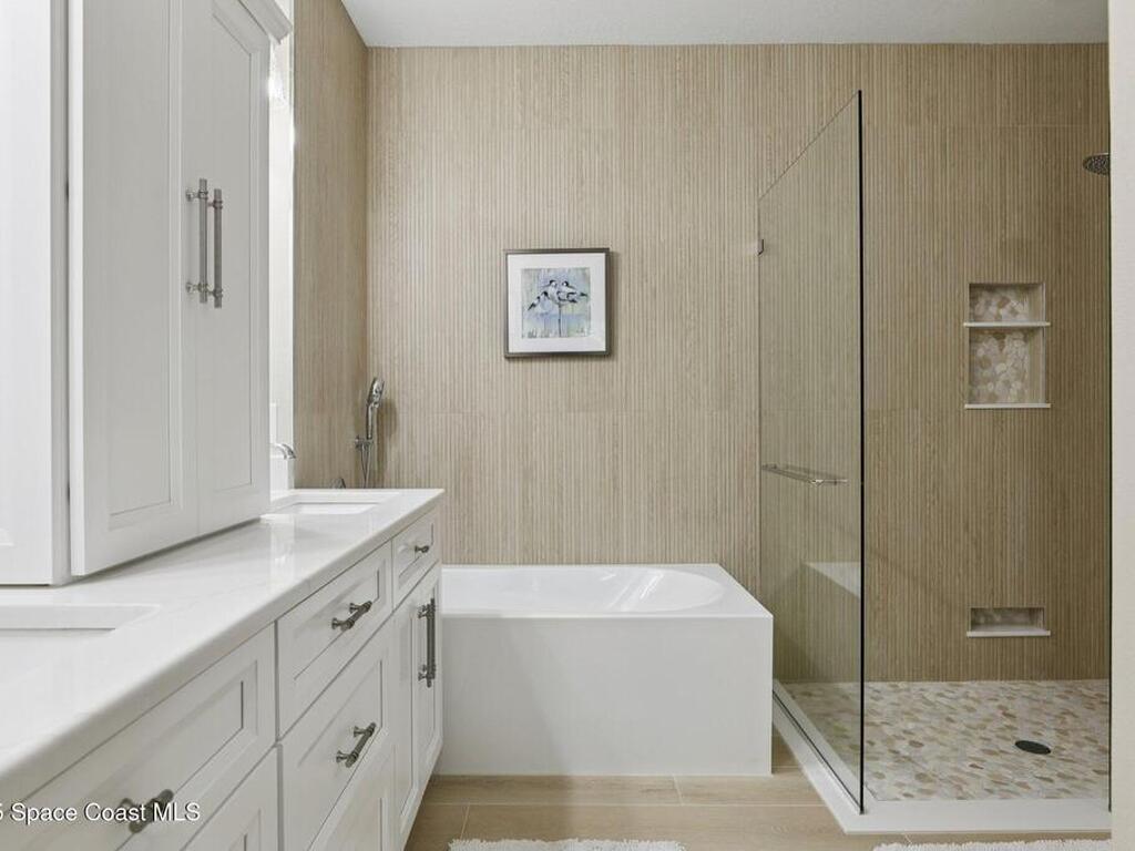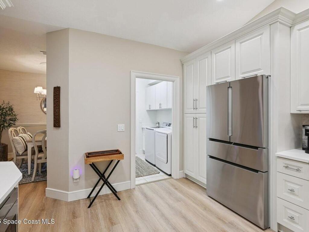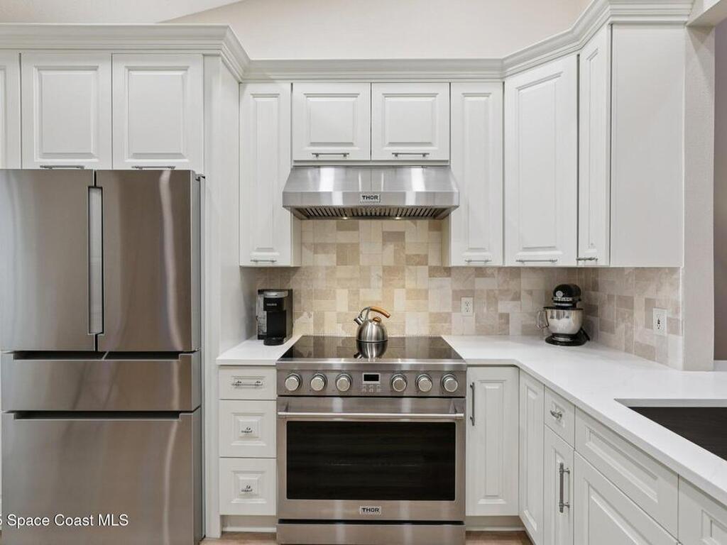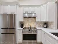Amazing opportunity to own a beautifully renovated townhome in the prestigious barrier island, ocean to river, Aquarina Beach & Country Club. This fully updated home features new luxuryvinyl flooring throughout, solid-core doors, upgraded baseboards and window trim, a completelyremodeled kitchen with high-end BOSCH appliances including a 36'' Thor range and fullyrenovated bathrooms with upgraded showers and vanities. Additional improvements include a new AC (2025), new ceiling fans, a whole-house water filtration system, hurricane accordion shutters, and a 2021 roof maintained by the HOA. Enjoy the newly renovated enclosed Florida/sun room with built-in cabinetry, perfect for an office, along with peaceful views overlooking the golf course. The garage offers new epoxy flooring, sturdy storage racks, andextra storage pantries. This 2-bedroom, 2-bath split floor plan features vaulted ceilings, makingit truly move-in ready with