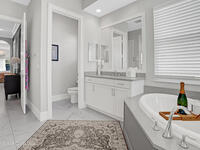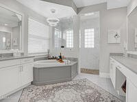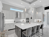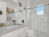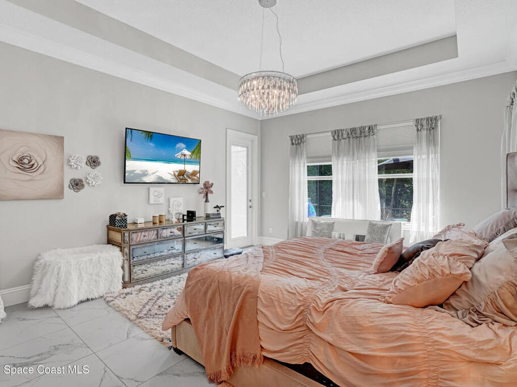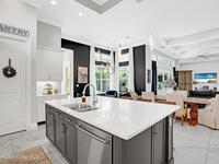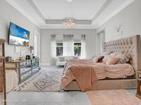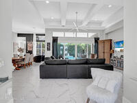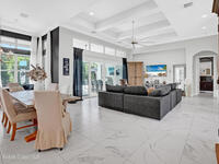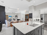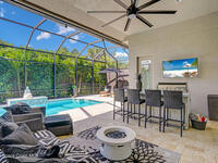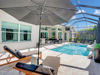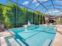 Stunning Tradewinds model. Open floor plan with soaring ceilings, spacious layout features split bedrooms, a large walk-in pantry, and a cabana bath with direct access to the pool area. Primary suite includes patio door leading to the beautifully designed outdoor space. Enjoy the saltwater pool with waterfall feature, pool heater, screened enclosure, and travertine pavers extending across the patio and pool deck. Highlights include a bar with a beverage refrigerator, porcelain tile flooring, quartz countertops, and a 36-inch gas cooktop, whole-home generator, fenced yard, and so much more!