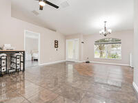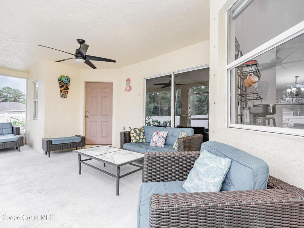 Well-maintained 3-bed, 2-bath home with new roof (Nov 2025) and new HVAC (Aug 2025). Ceramic tile flooring in main areas, vaulted ceilings, and updated ceiling fans and lighting throughout. Contemporary kitchen features stainless steel appliances. Samsung front-load washer and dryer included if desired; patio furniture negotiable. Hurricane shutters with predrilled anchors for quick install. Screened-in back porch and fenced backyard with mature oak trees in front yard. Located minutes from shopping, schools, and local parks. Less than 25 minutes to Indialantic Beach and close to attractions like Turkey Creek Sanctuary and the Palm Bay Aquatic Center.