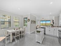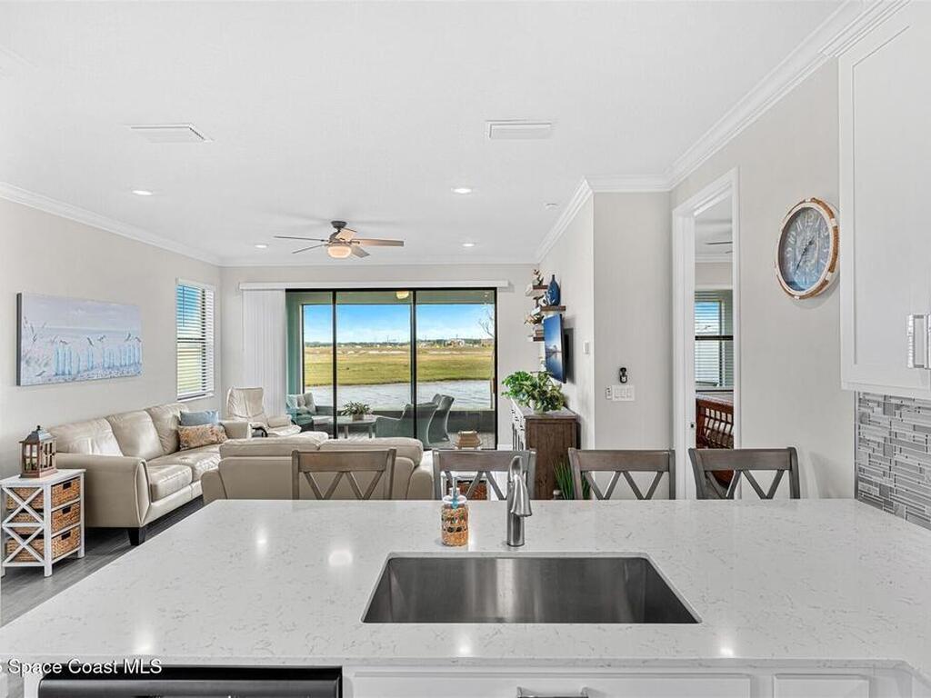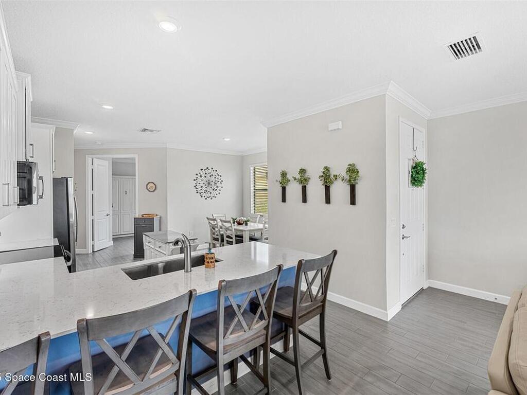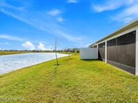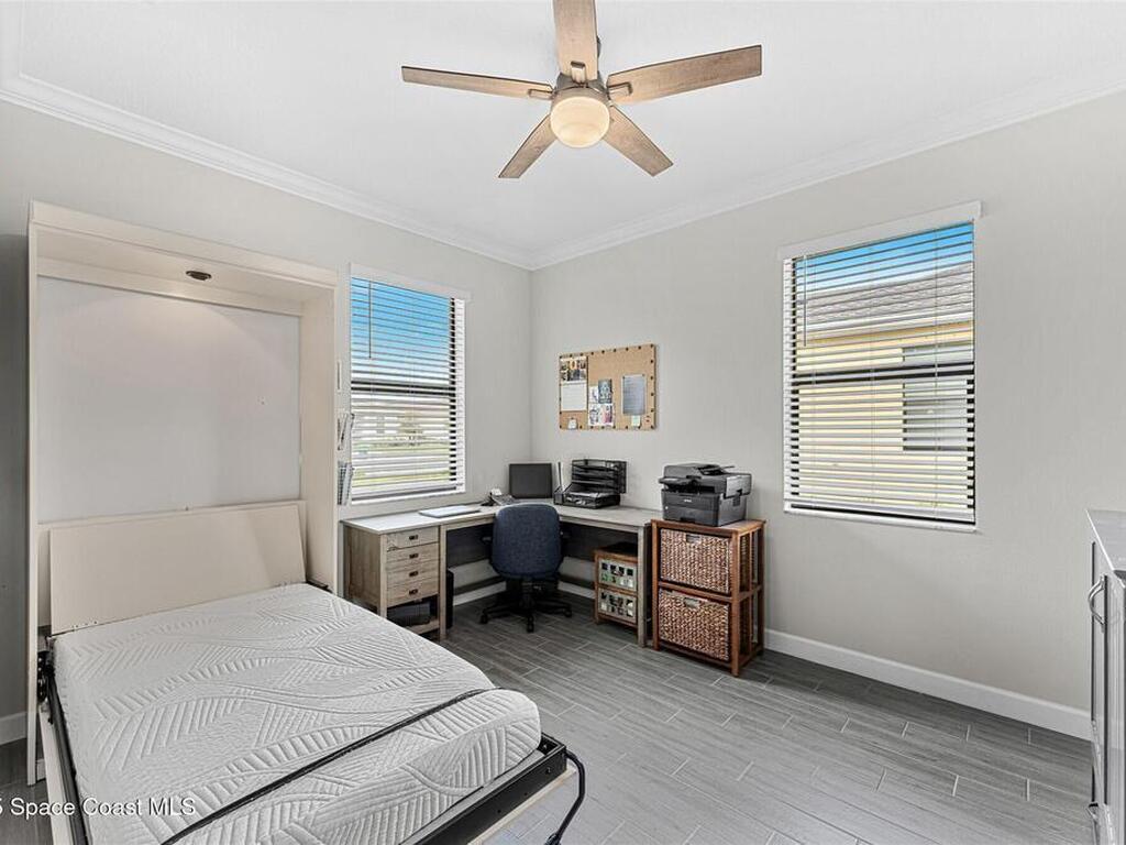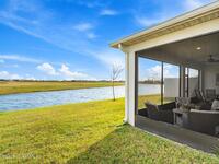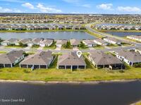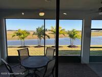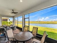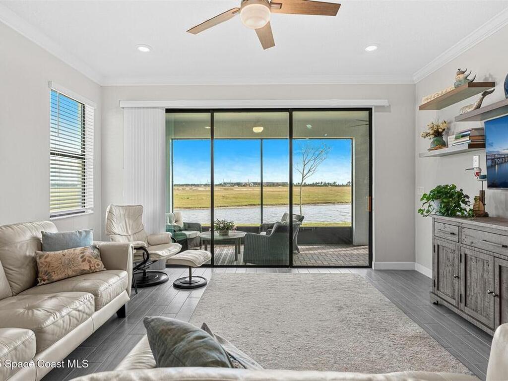 Must See 1565 Sq. ft. waterfront home in in Bridgewater, Viera's sought after 55+ resort style gated community! This 2 bedroom plus study, 2 bath, 2 car oversized garage (20X21) home checks off all the boxes: plank tile floors and crown molding throughout, 8' doors, deluxe light package with LED lights in Great Room and Primary Bedroom, and 5 ceiling fans. Designer kitchen with staggered white cabinets, marble look quartz counters, decorator backsplash, and portable island with extra drawers and cabinets! Luxury primary bath with large shower w/ bench, quartz counters and upgraded faucets! Study with double doors includes a murphy bed for those out-of-town guests! Laundry Rm has extra closet! Private screened-in entry and 270 sq. ft. back porch. Unwind at the private clubhouse, featuring a heated pool w/ waterfall & spa, fitness room, billiard room, coffee lounge, lit tennis & pickle ball courts, and a movie theater! The HOA covers lawn care! Short car ride to Atlantic beaches!